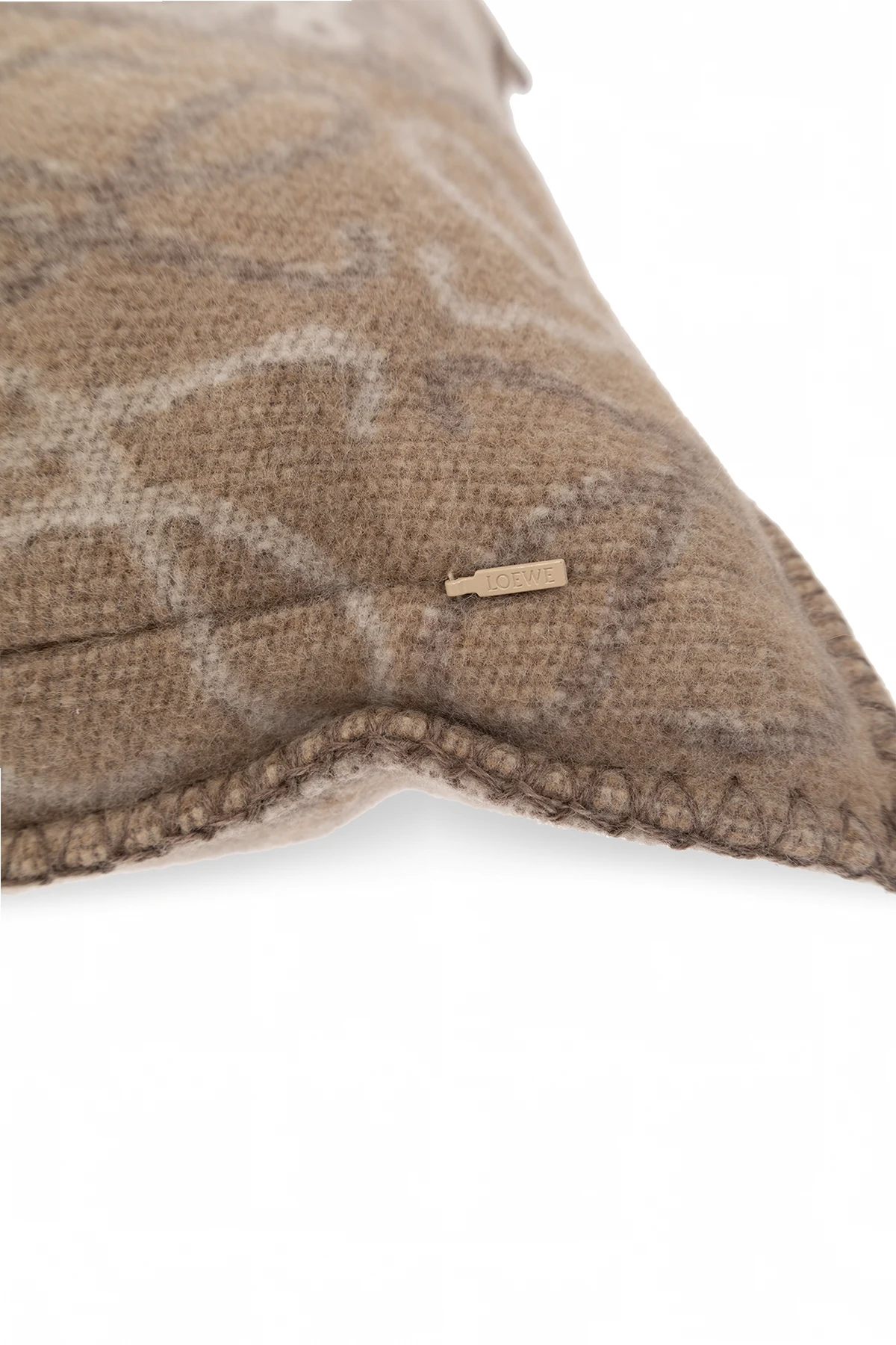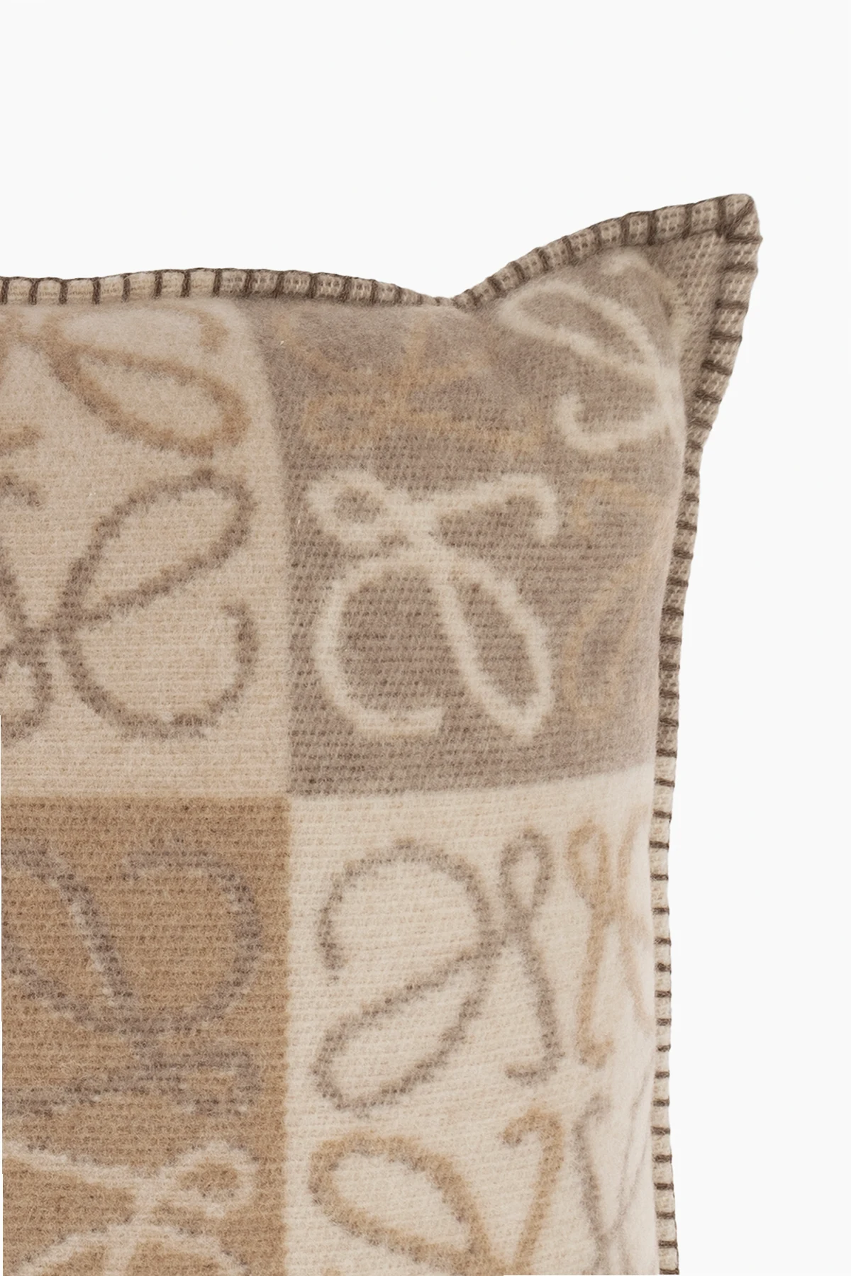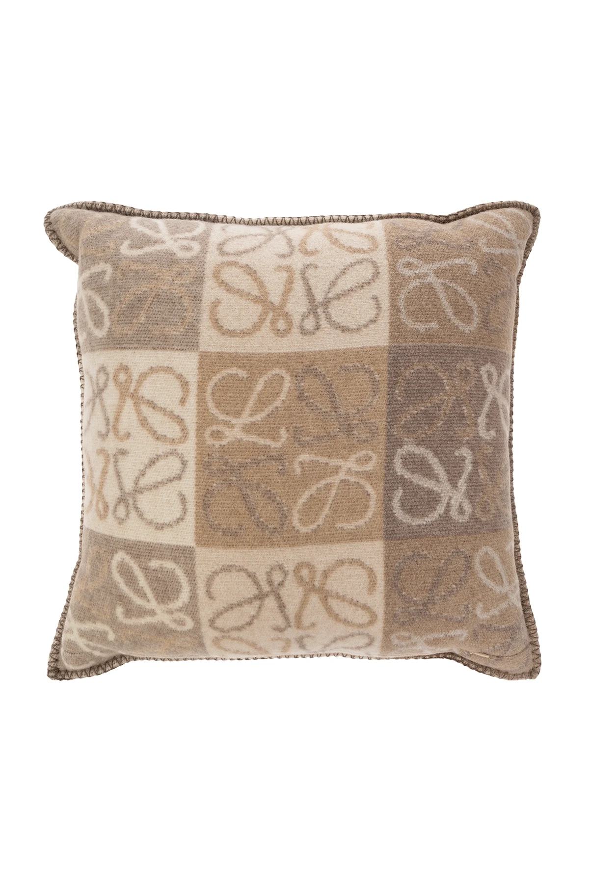 Beige and cream cushion from Loewe. Made from a cashmere and wool blend, this item fastens with a hidden side zip and showcases a checkerboard pattern accompanied by a logo.