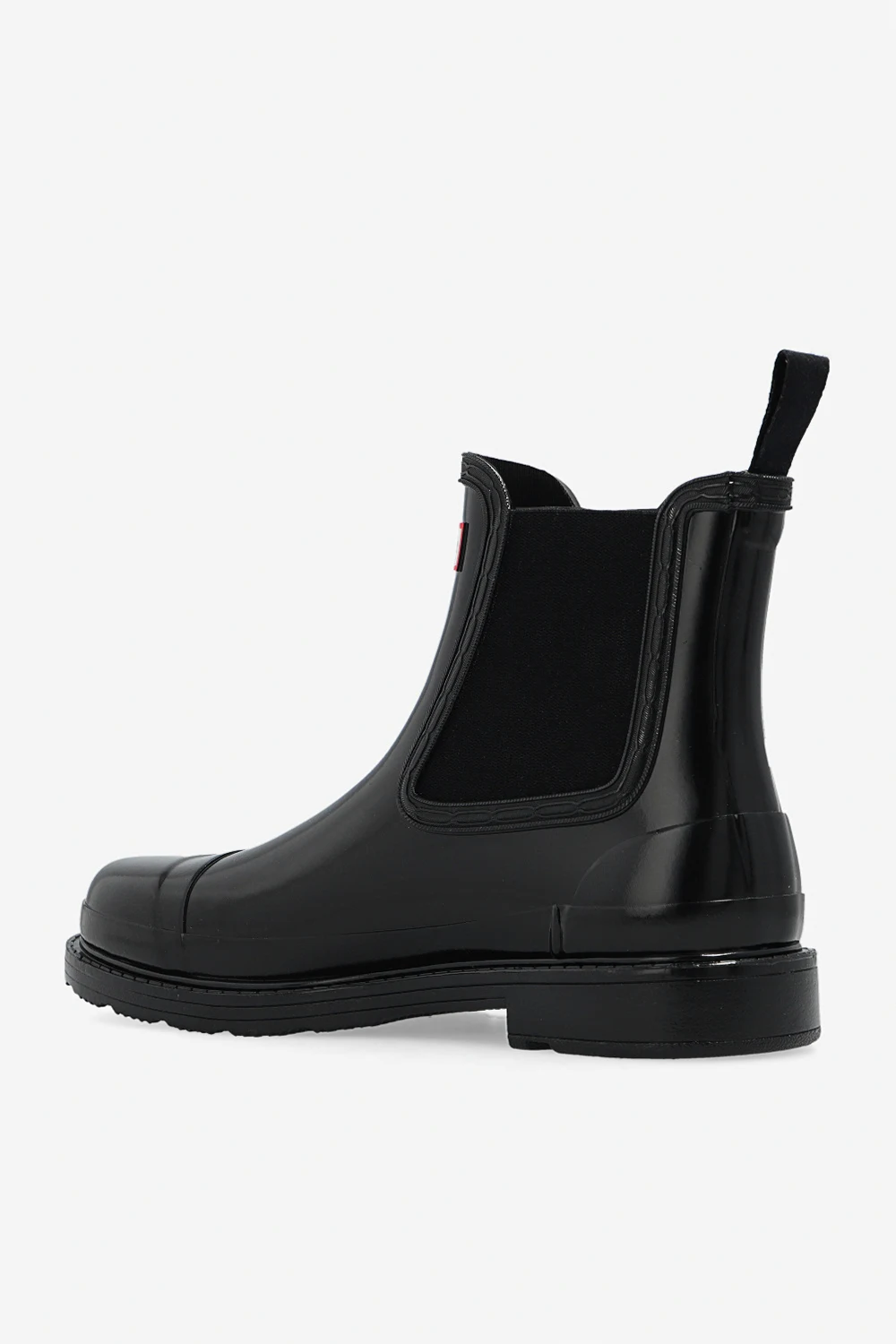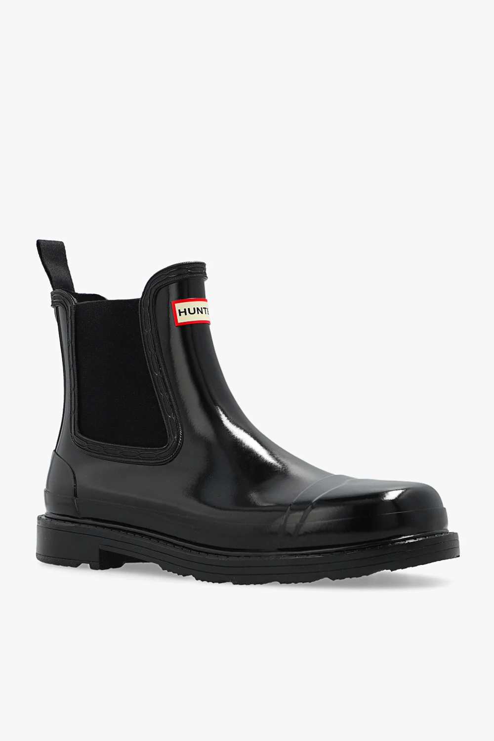 Black ‘Commando Chelsea Gloss’ rain boots with a gloss finish from Hunter. Handcrafted from natural vulcanised rubber from an FSC®-certified plantation, this pair features a logo appliqué, elastic side panels, fabric handle at the back and rubber sole with Hunter Original tread pattern.
