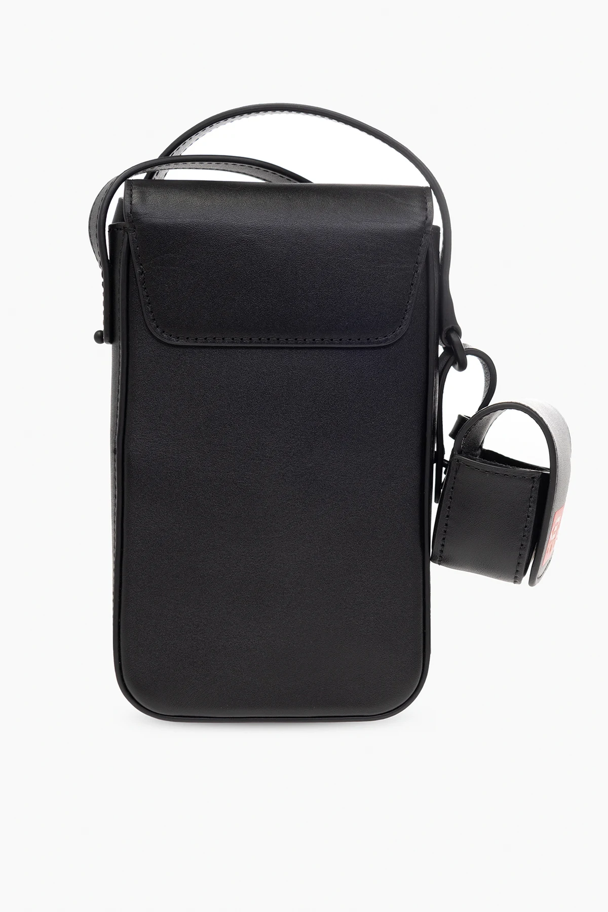 Black phone pouch from Kenzo. Made of leather, this item is complete with a magnetic closure, red, white and green logo print, adjustable strap, detachable AirPods case and one internal compartment with three card slots.