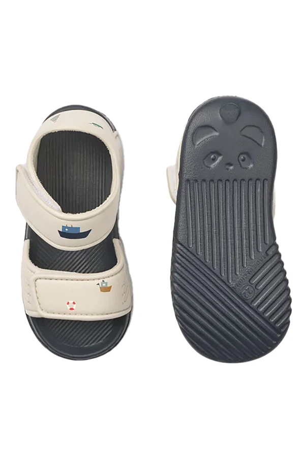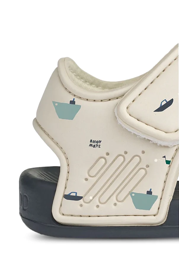 Delicate marine-inspired prints—featuring sailboats, ships, lighthouses, and lifebuoys in soothing pastel hues of green, blue, brown, red, and black—adorn the sandal’s understated cream landscape. Two wide hook-and-loop straps ensure an adjustable fit, while the subtle “AHOY MATE” inscription integrates seamlessly into the maritime motif for a touch of playful distinction.