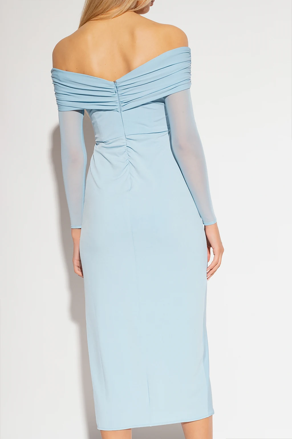 Light blue dress from Self Portrait. Crafted from stretchy fabric with a form-fitting silhouette, this style features a wide neckline exposing the shoulders, a hidden zipper with a hook & eye closure at the back, underwired bodice, asymmetrical drapes and slit on the front, and long sleeves made of sheer fabric.