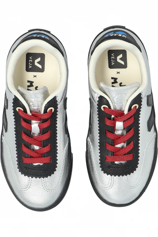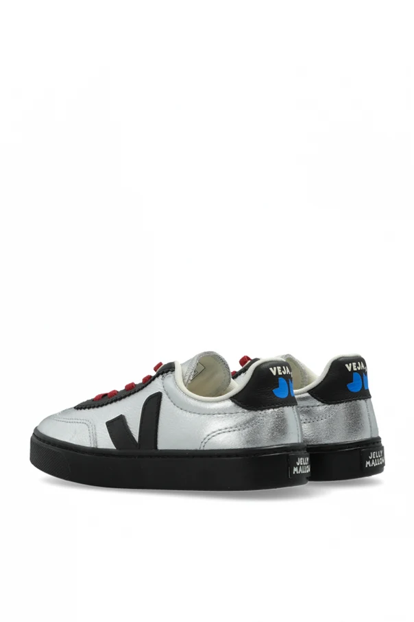 A captivating fusion of playful refinement, the VEJA x Jelly Mallow sneakers for children represent a masterful balance between contemporary aesthetics and timeless form. Their iconic low-cut silhouette, characterized by softly rounded lines, is accentuated by a stunning metallic silver finish that casts a radiant, mirror-like sheen. Contrasting black accents —from the signature side “V” logo to sleek piping and outsole—bring a modern edge to this luminous design.