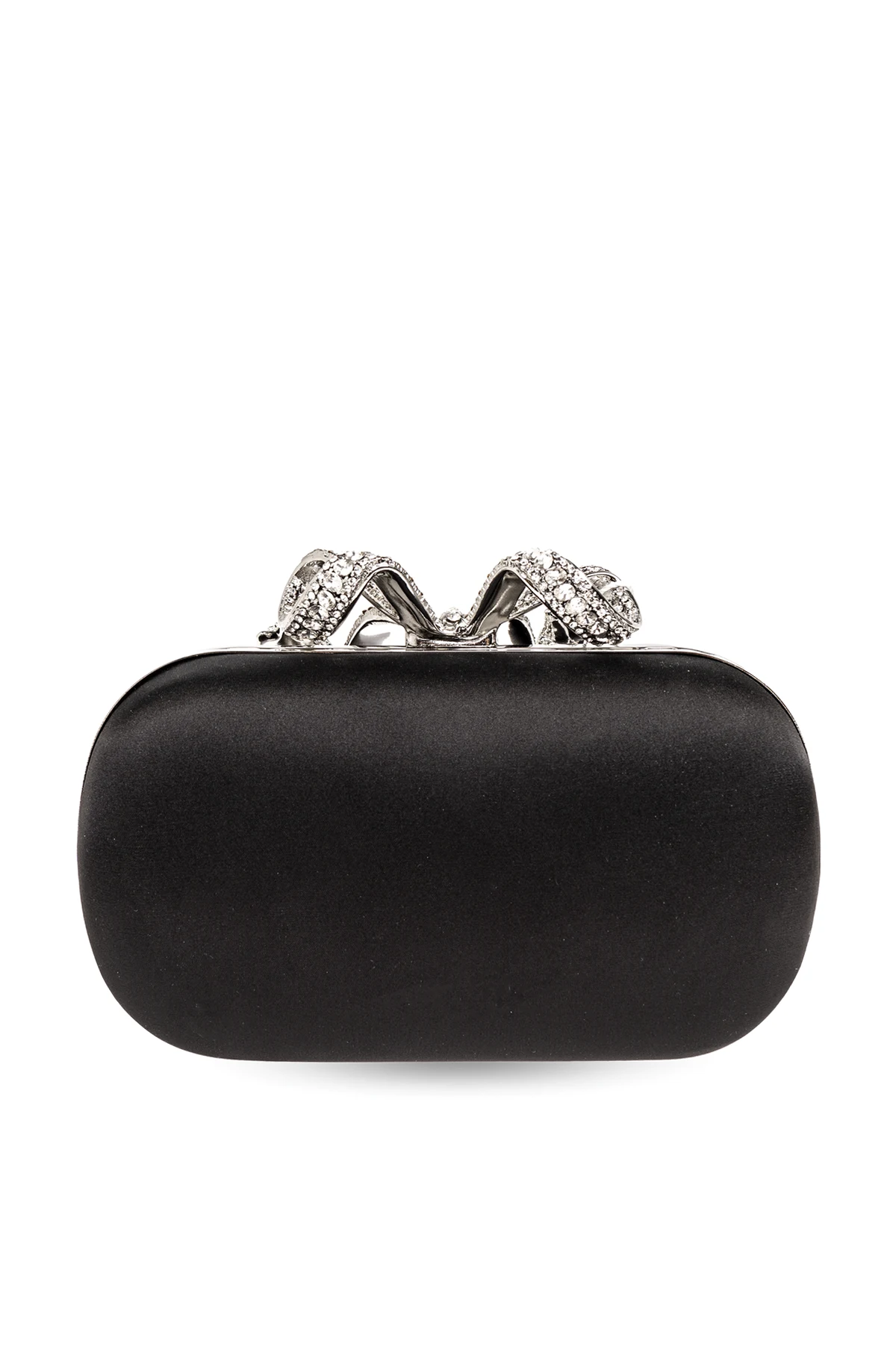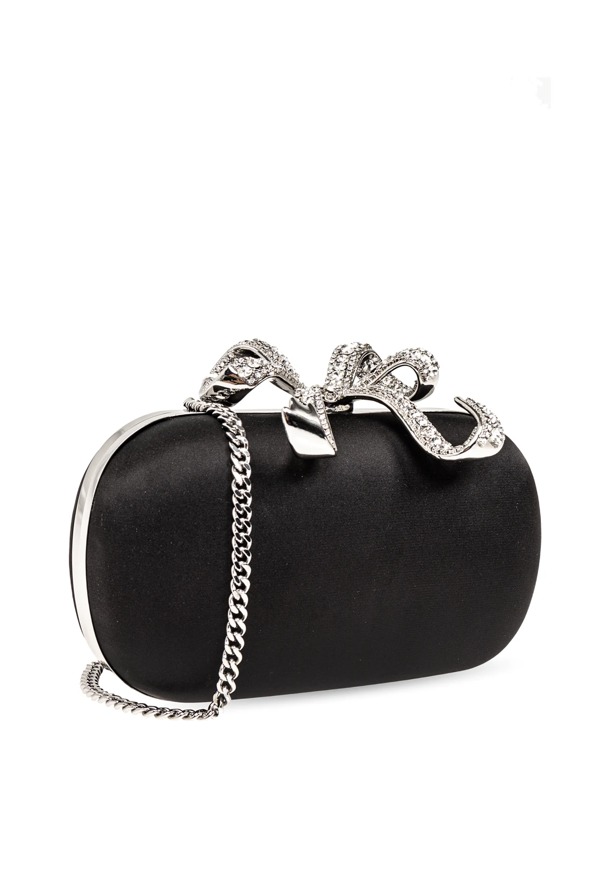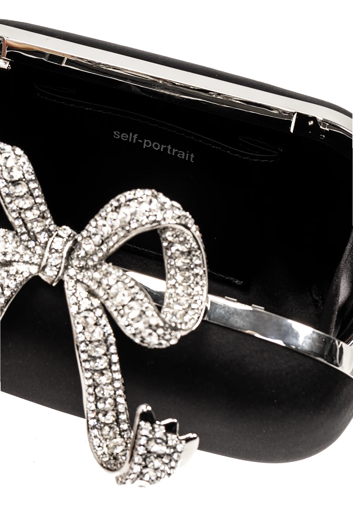 Introducing the exquisite Satin Shoulder Bag 'Bow' by Self Portrait, a masterpiece of elegance and sophistication. Crafted with a sleek, cylindrical silhouette, this bag is defined by its flat bottom, ensuring a compact yet elegant appearance that captivates at first glance. The lustrous satin fabric envelops the bag, offering a smooth and shiny surface that accentuates its high-class aesthetic. The front of the bag is adorned with a large, decorative bow encrusted with sparkling stones, serving as the centerpiece that adds a touch of refinement. This bag comes with a long, metal chain strap, providing both elegance and functionality. Concealed under the ornate bow lies a metal, presumably silver clasp, ensuring your belongings are secure while adding to the bag’s exquisite design. Inside, the bag is likely lined with a luxurious material, typical of high-end handbags, although not visible in the photos provided. The Self Portrait logo discreetly placed inside the lid signifies the brand's mark of quality and exclusivity. Whether showcased on its own or as part of a complete ensemble, this black satin shoulder bag effortlessly complements elegant and evening wear, making it a versatile addition to any sophisticated wardrobe. Why Purchase This Product? Elegantly designed with a unique, richly adorned bow, setting it apart from ordinary accessories. The smooth, shiny satin surface and cylindrical shape offer a sleek, high-class aesthetic. Features a functional and stylish metal chain strap for shoulder wear. Secured with a concealed, elegant metal clasp under the decorative bow. Embodies the Self Portrait brand's hallmark of luxury and exclusivity.