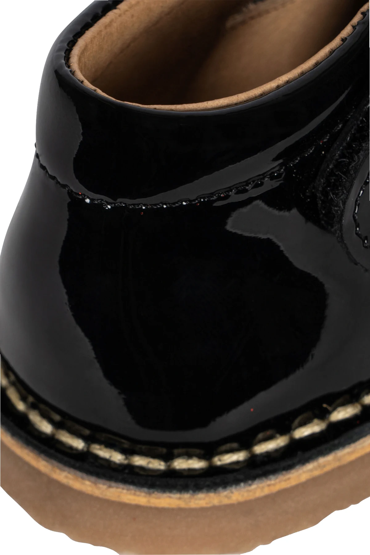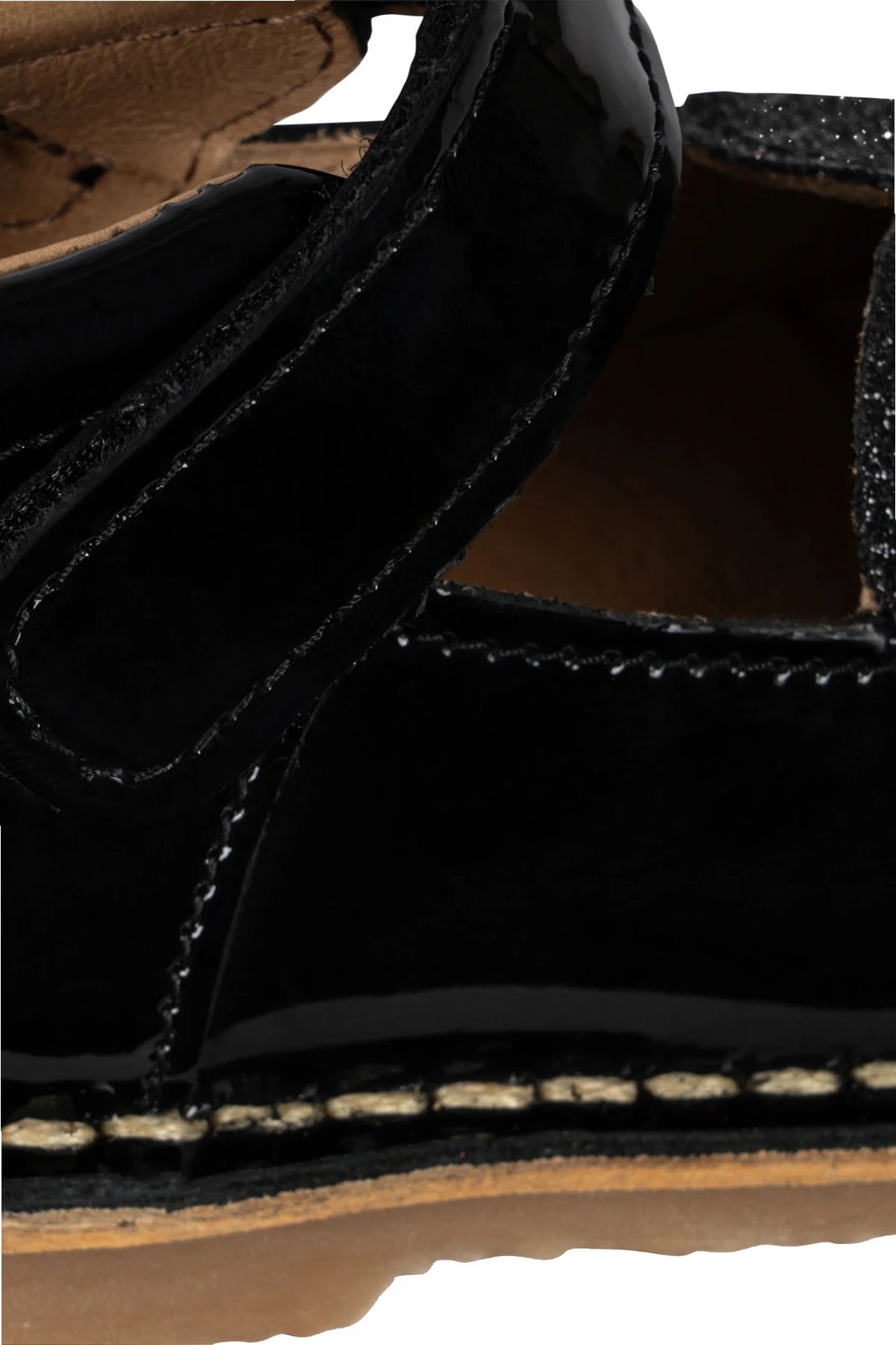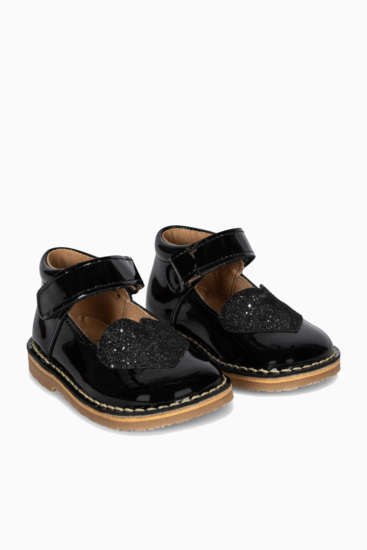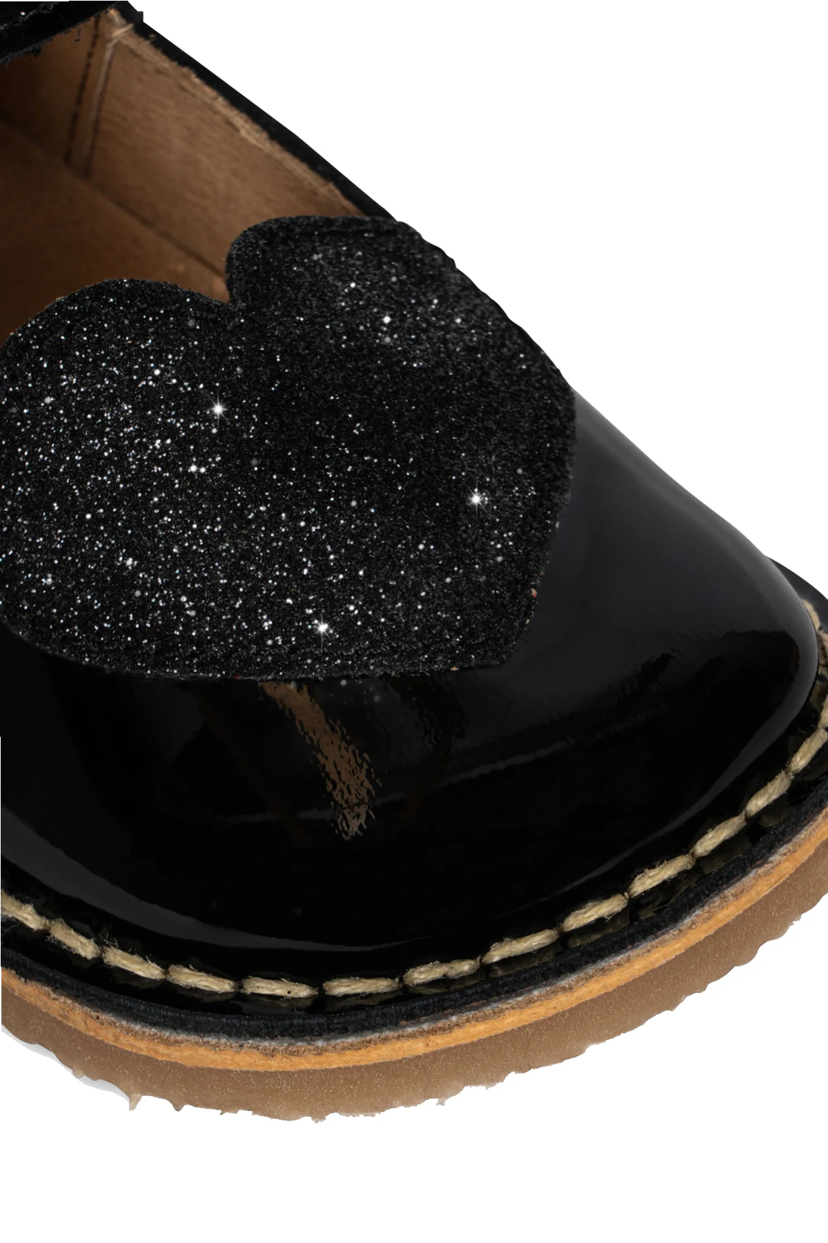 Black ‘Minnie’ shoes from Konges Slojd. Made of patent leather, this pair sits on a brown rubber sole and features velcro fastening and heart detailing with a glitter finish.