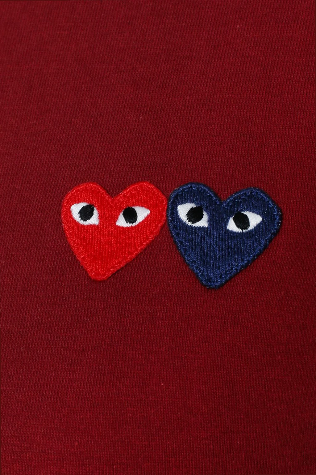 Maroon cotton T-shirt from Comme des Garçons Play. Red and navy heart-shaped patches on the front. Round neck. Short sleeves.