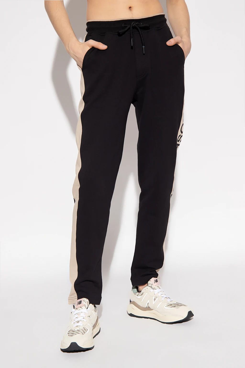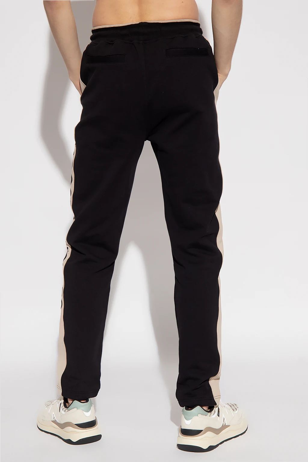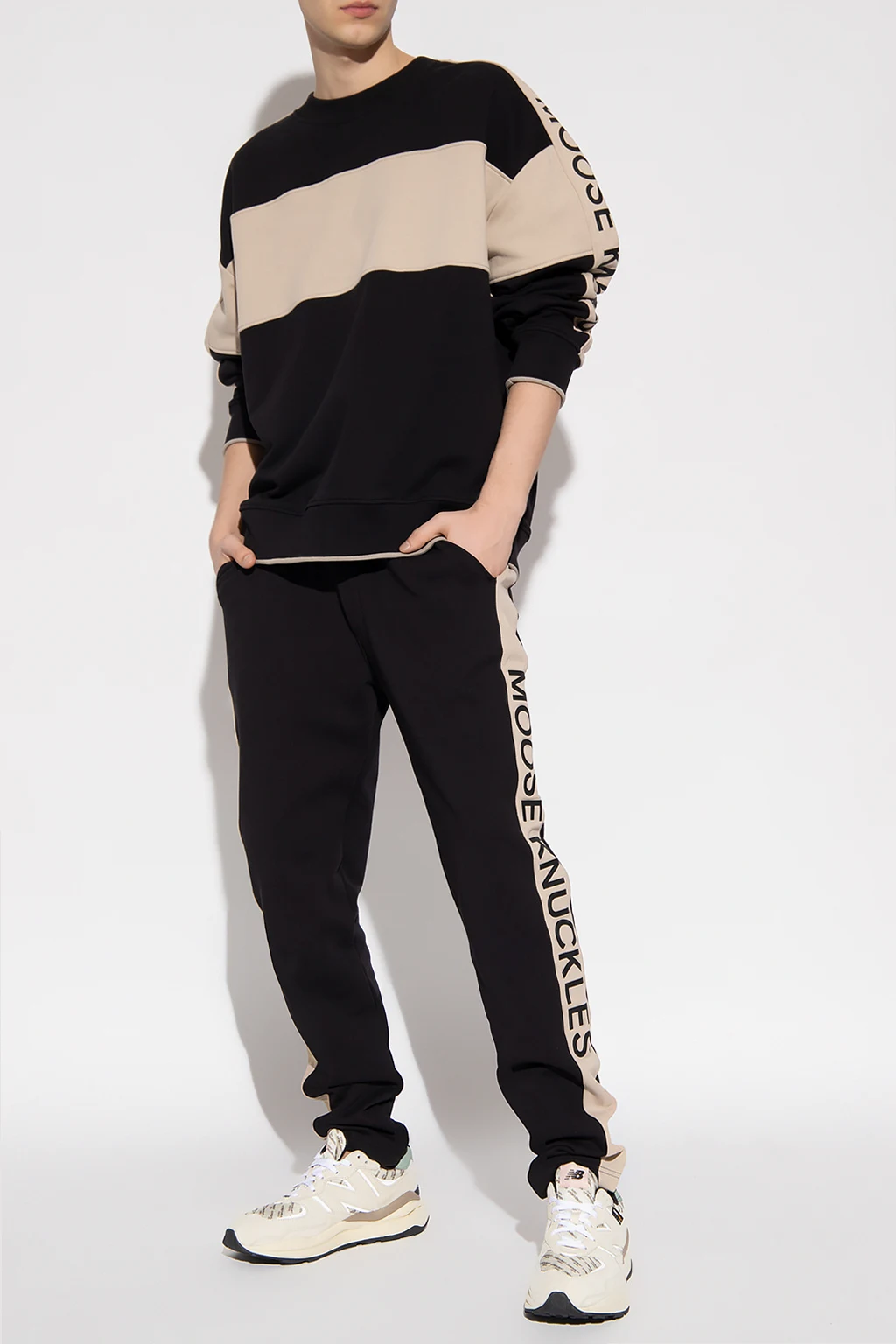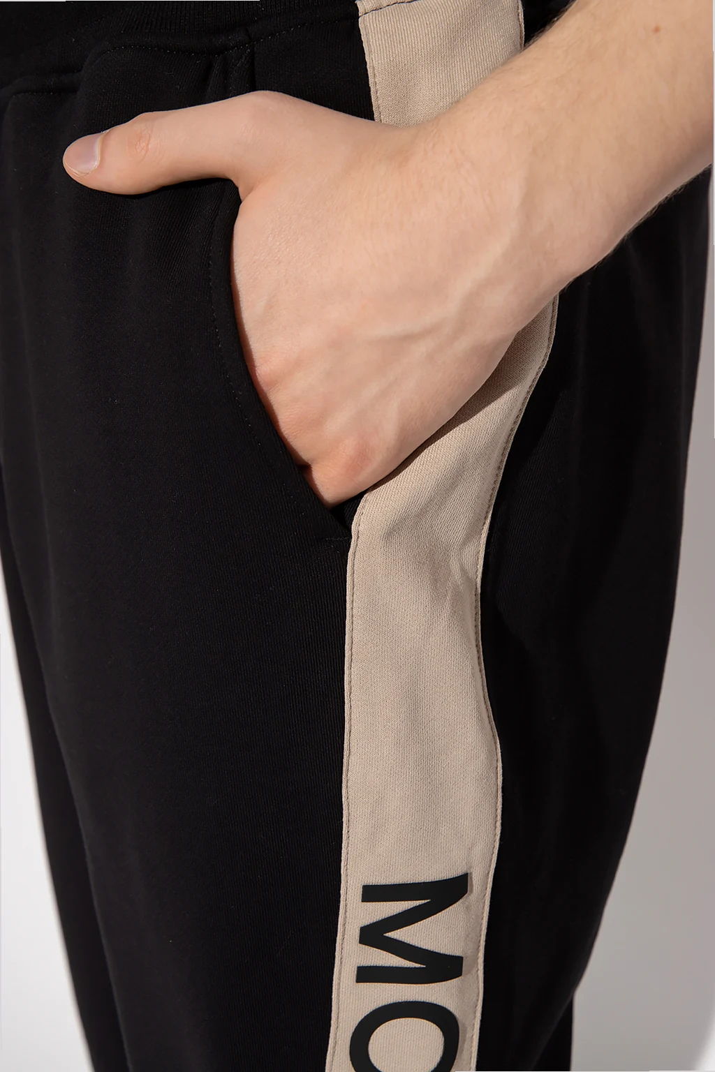 Black ‘Wabasso’ sweatpants from Moose Knuckles. Distinguished by beige sides panels accompanied by a black logo appliqué, this pair features a drawstring waistband and four slip pockets.