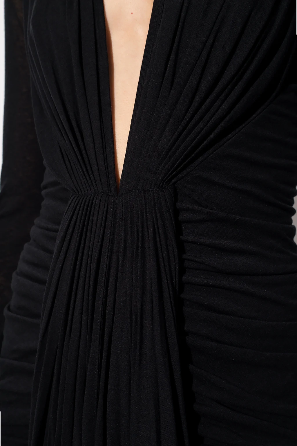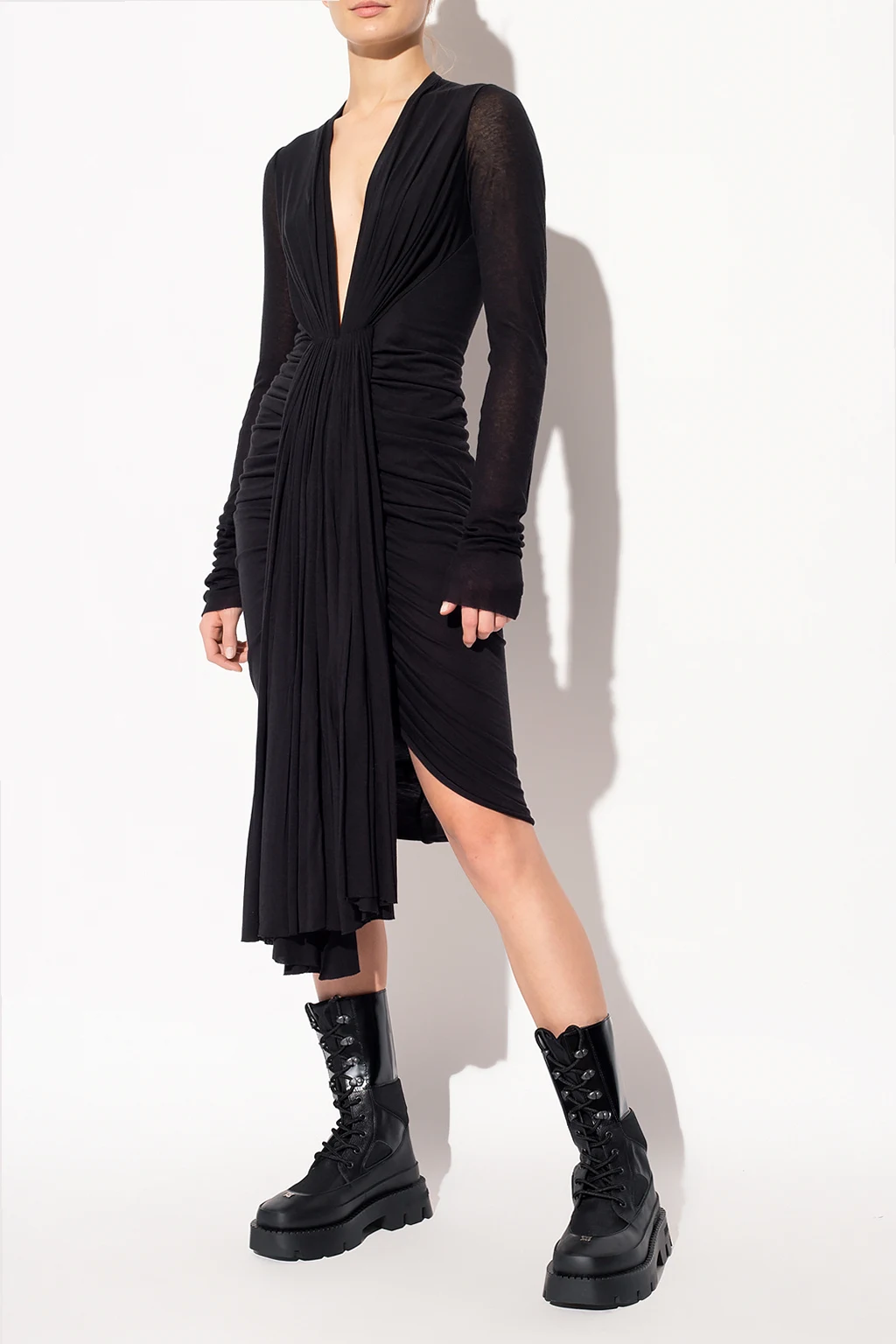 Black dress from Rick Owens Lilies. Cut with an asymmetrical silhouette, this style features a plunging V-neckline, distinctive gathers, long sleeves and raw hems.