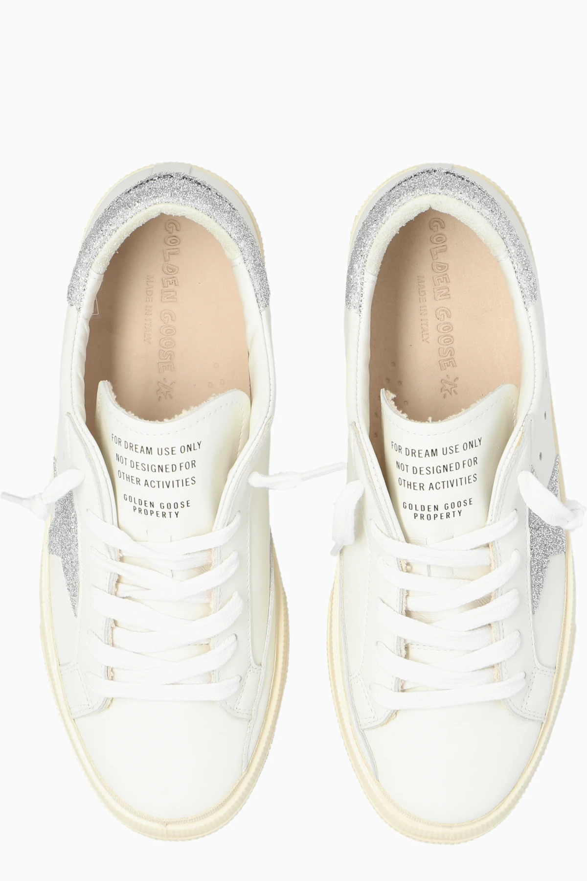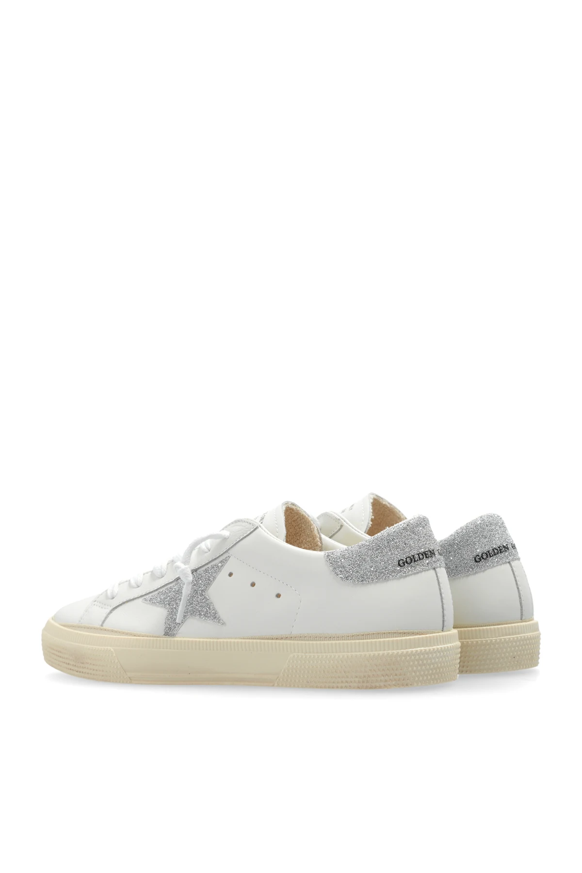 Introducing the \'May\' Sports Shoes from the exclusive collection by Golden Goose Kids. Crafted with meticulous attention to detail, these sneakers epitomize the perfect blend of sophistication and modernity. The classic low-profile silhouette is adorned with a signature silver glitter star on the side, complemented by a matching glitter panel on the heel. Impeccably made from pristine white leather, these shoes are a testament to Golden Goose\'s commitment to luxury and quality. Notable details include a gold \"GOOD/MAY\" inscription on the rear side of the sole and the \"GOLDEN GOOSE\" branding on the tongue. Inside, the beige lining features English inscriptions, enhancing the shoe\'s exclusive appeal. The rubber sole in light beige ensures durability and traction, while the white laces maintain the shoe\'s classic sneaker aesthetic. Why Choose These Shoes? Elegant design with signature Golden Goose elements High-quality white leather for ultimate comfort and style Distinctive silver glitter star and heel panel Durable light beige rubber sole Exclusive branding and detailing