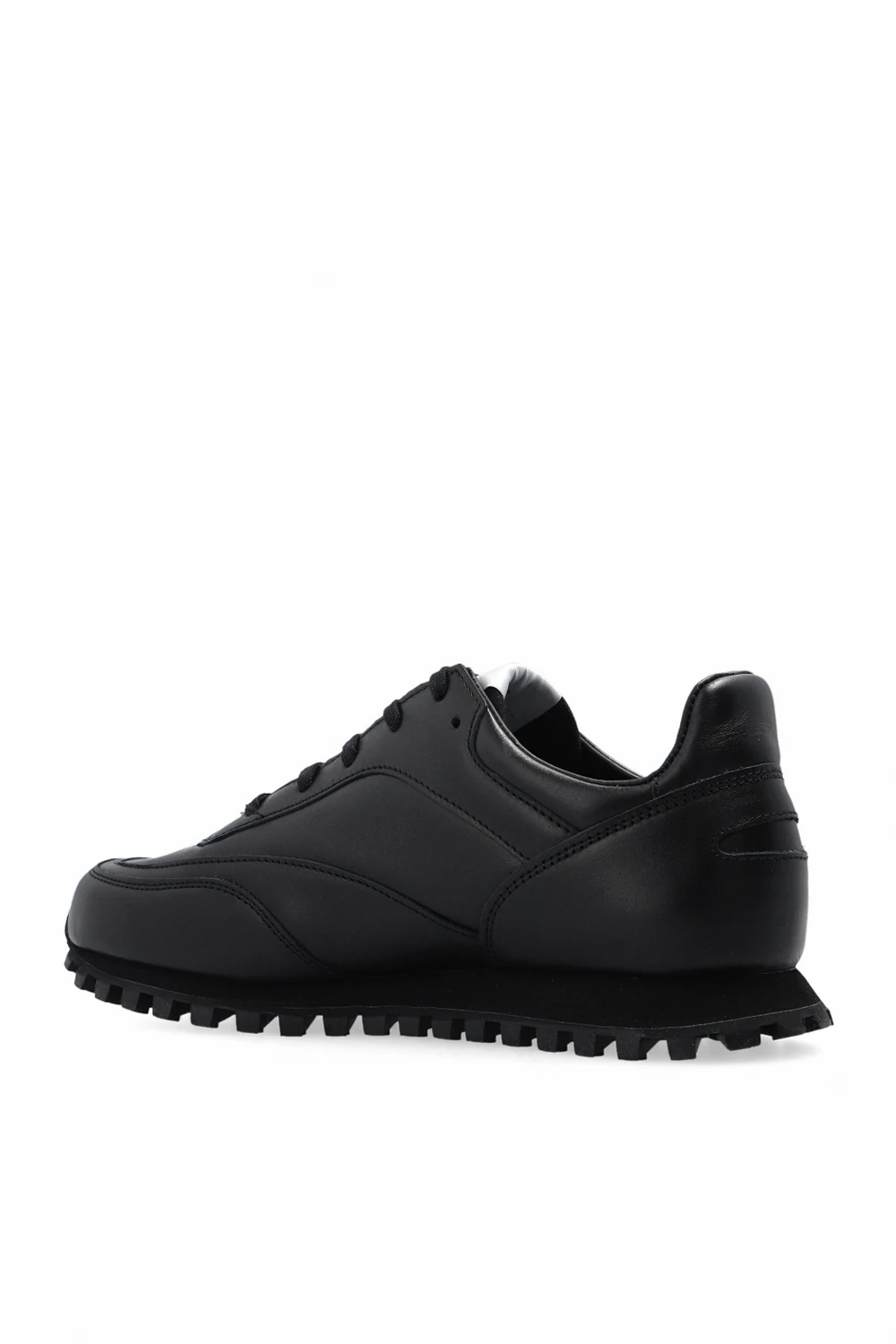 Black ‘Spalwart’ sneakers from Comme des Garcons. Made of leather, this lace-up pair features is decorated with a logo patch and black rubber sole.