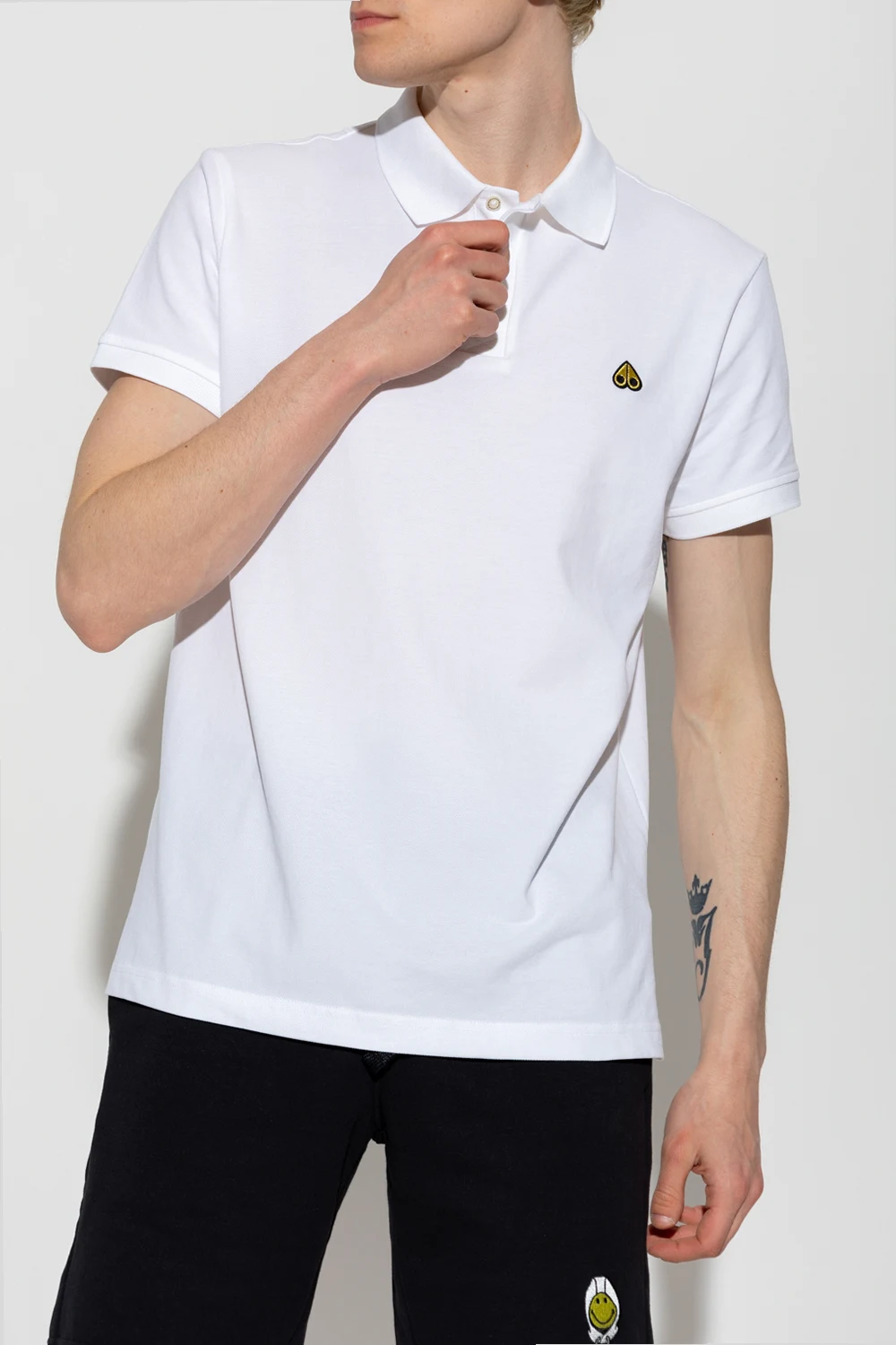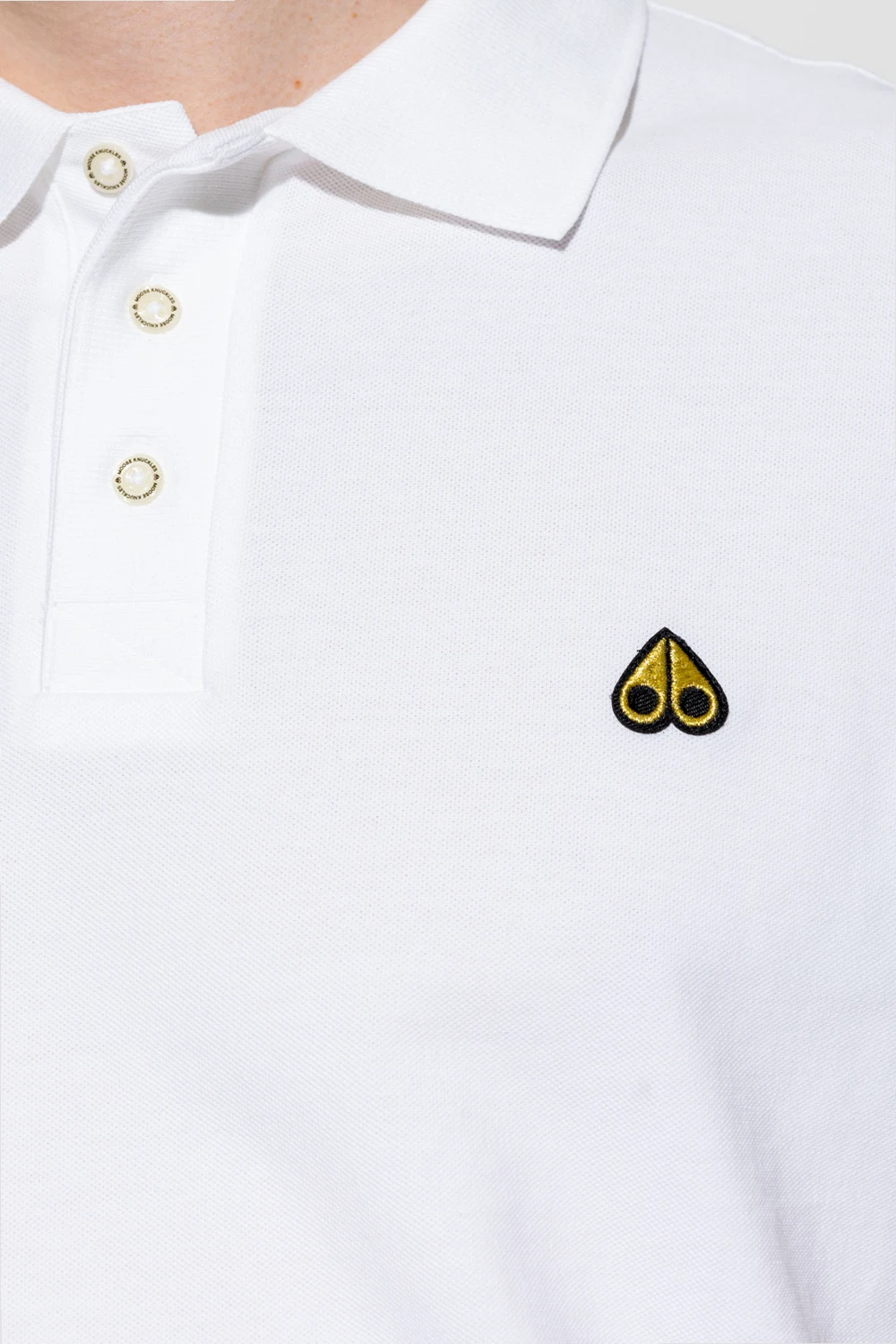 White polo shirt from Moose Knuckles. Crafted from cotton, this garment features a gold-tone and black logo patch, buttons with a collar and short sleeves with ribbed trims.
