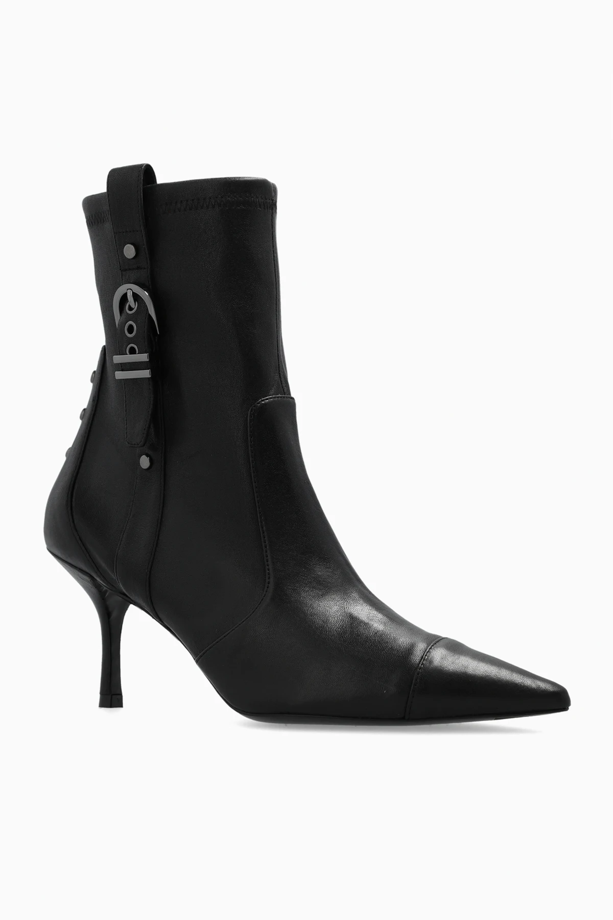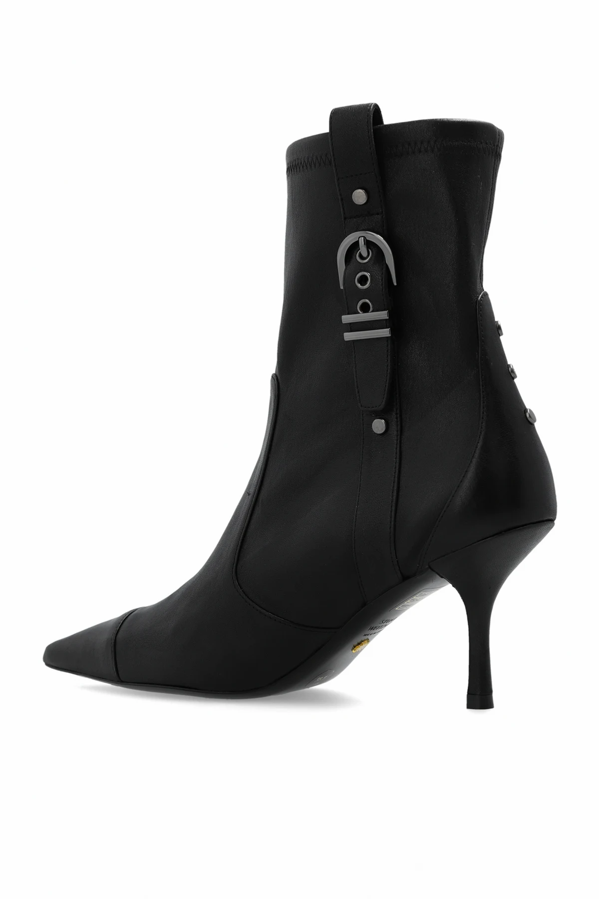 Black ‘Strt’ heeled ankle boots from Stuart Weitzman. Crafted from leather with a slip-on silhouette, this model sits on a black leather sole and features a pointed toe, decorative studs and buckle straps.