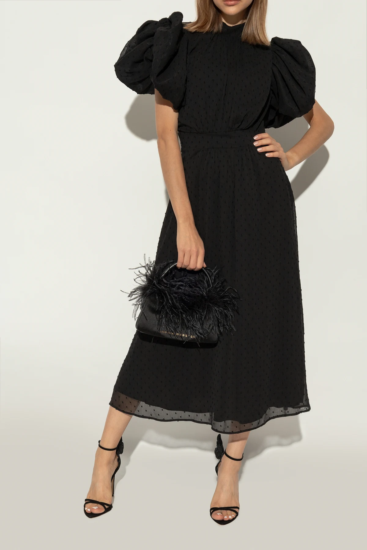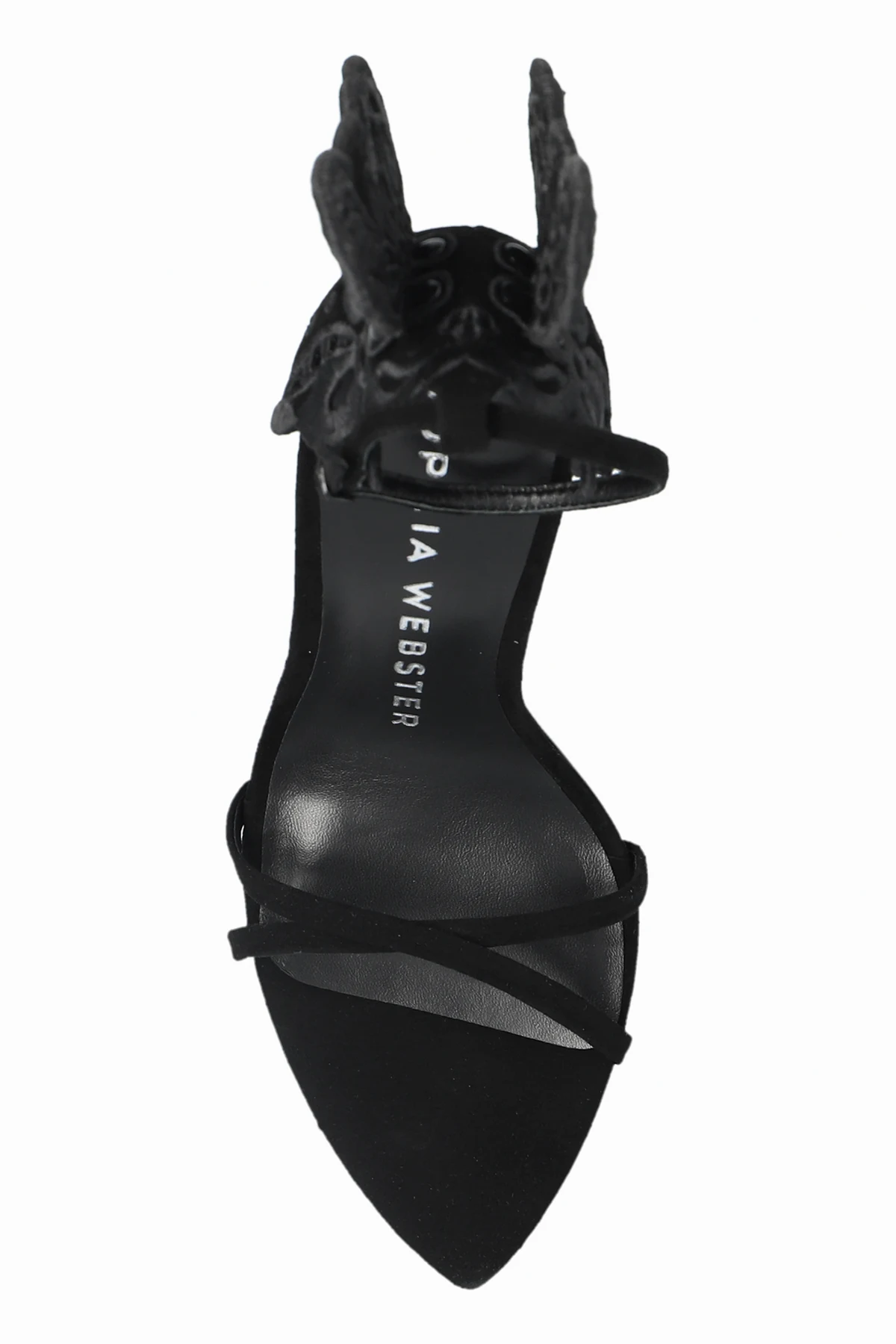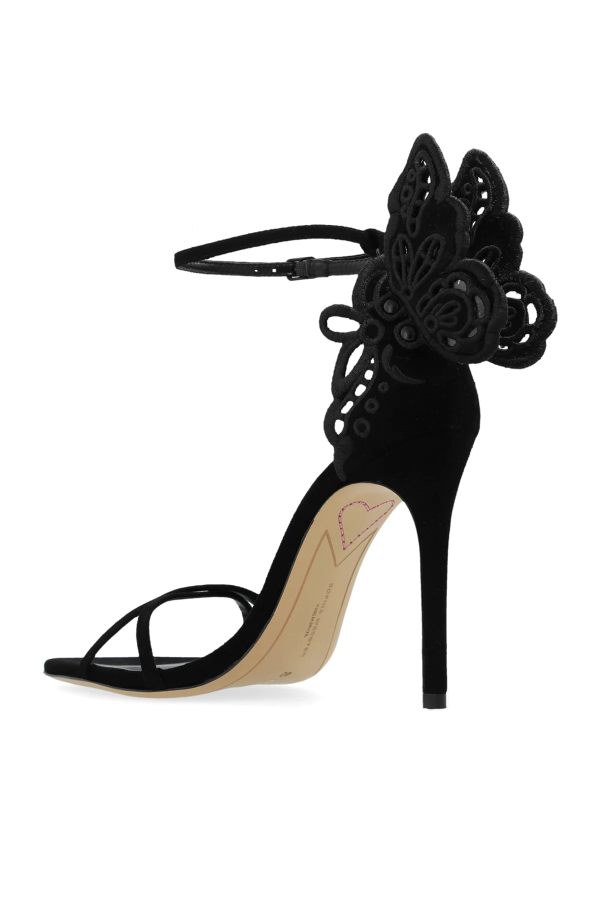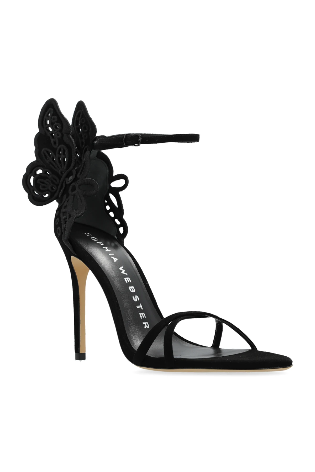 Introducing the exquisite Chiara heeled sandals by renowned designer Sophia Webster. These elegant women\'s shoes epitomize sophistication and unique craftsmanship. Crafted from high-quality black leather, the Chiara sandals feature a stunning high stiletto heel and delicate front straps that secure the foot with grace. A distinctive touch is the ornate, three-dimensional butterfly wing pattern adorning the heel, making these sandals a true statement piece. The inner sole, also in black, prominently displays the designer\'s logo, ensuring both comfort and a touch of luxury. The ankle strap comes with an adjustable buckle, providing stability and a custom fit for every wearer. The dominant black color enhances the sandals\' versatility and elegance, making them perfect for formal occasions or evening outings. As showcased in the accompanying images, these sandals paired with a mid-calf black dress, highlight their sophisticated appeal and adaptability to various styles. Why Choose This Product? High-quality black leather for an elegant appearance. Unique three-dimensional butterfly wing design on the heel. Comfortable inner sole with the designer\'s logo. Adjustable ankle strap for a perfect fit. Versatile and suitable for formal and evening wear.