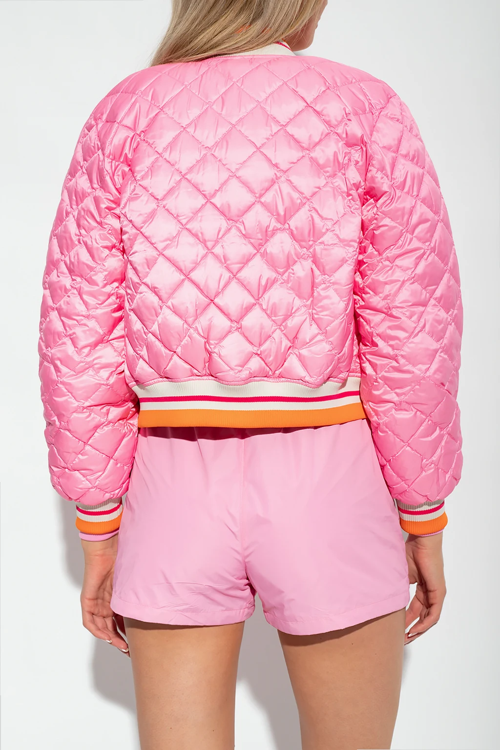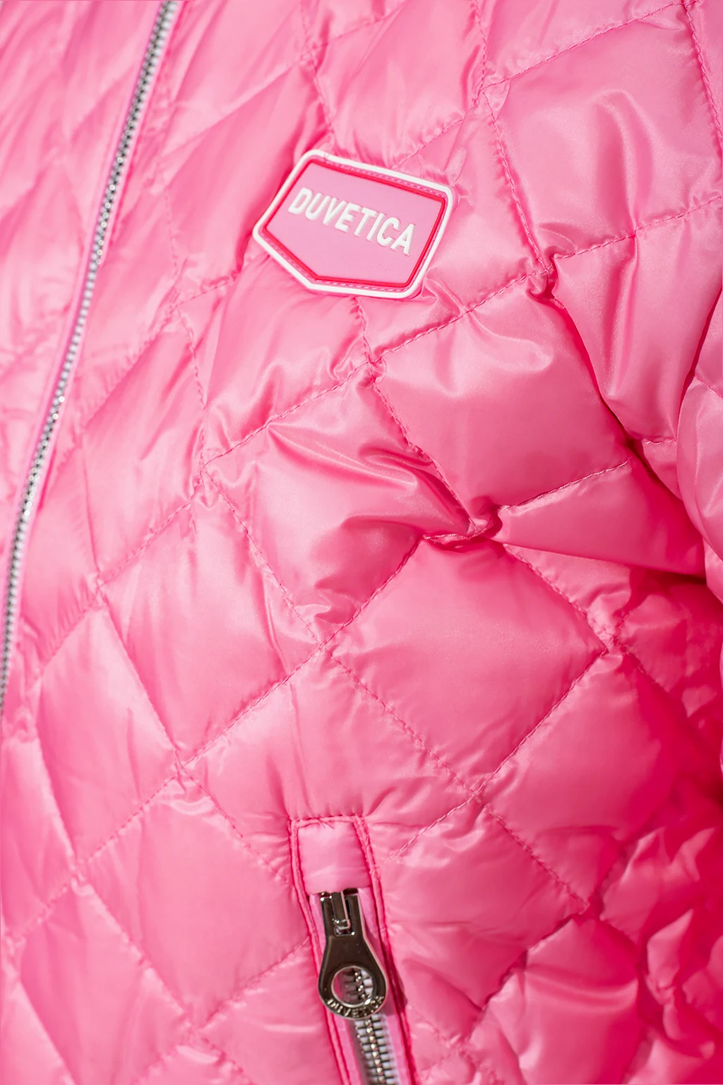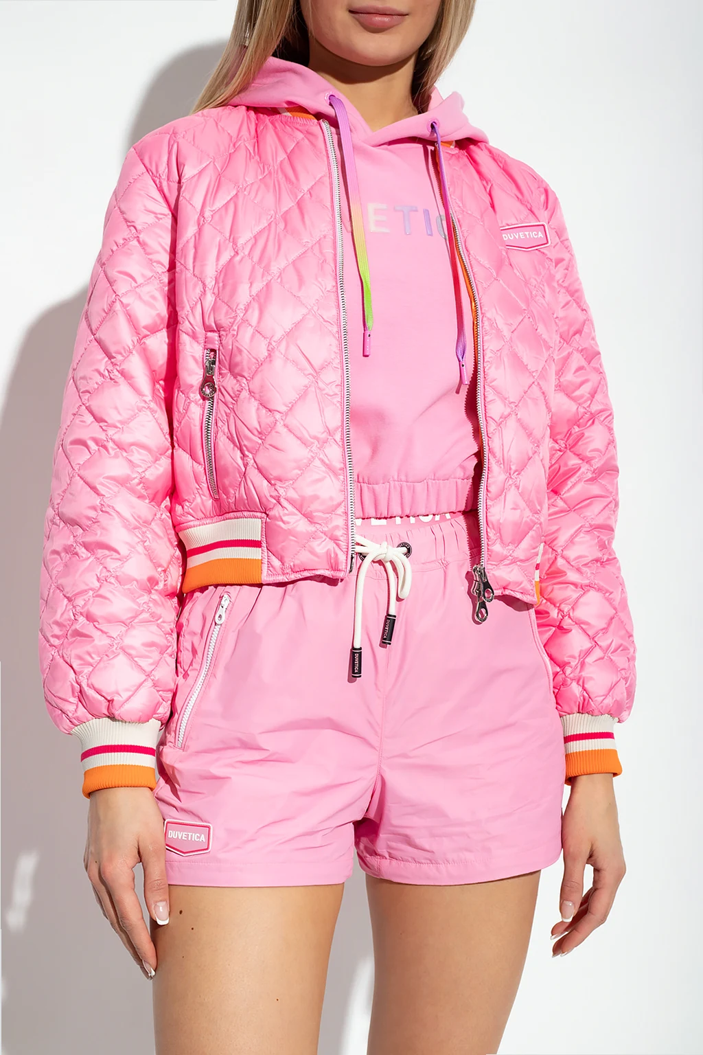 Pink ‘Scaglia’ quilted bomber jacket from Duvetica. Emblazoned with a rubber logo patch, this style fastens with a two-way zipper and features two front zip pockets and ribbed trims with colourful stripes on the edges.
