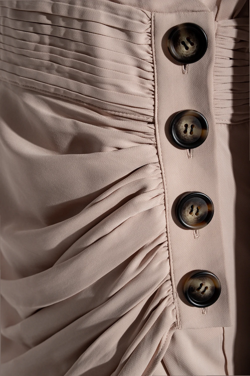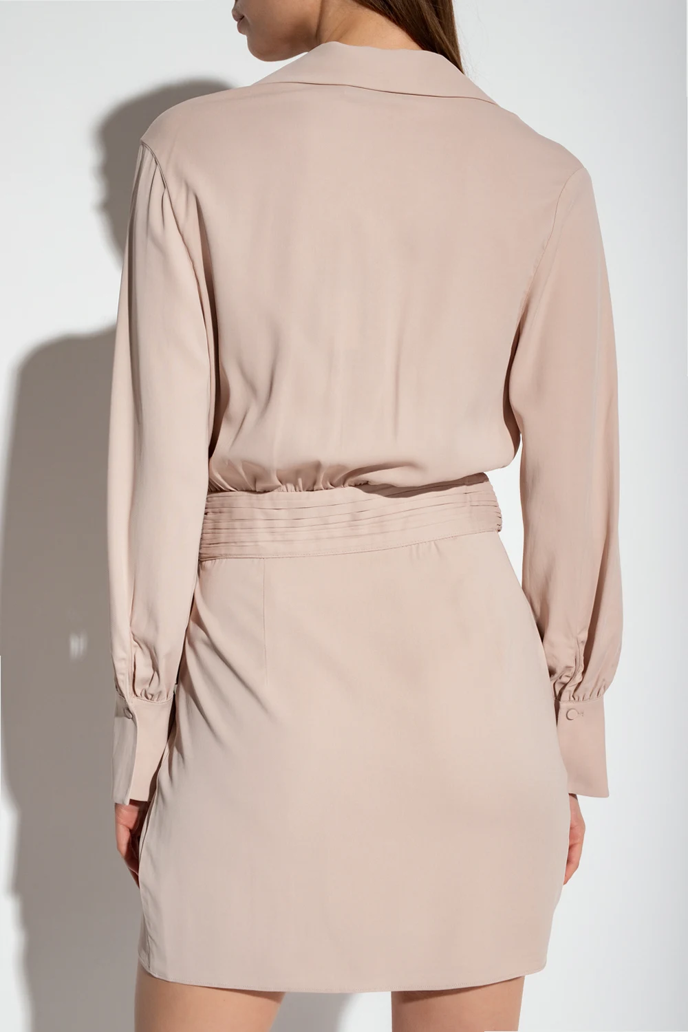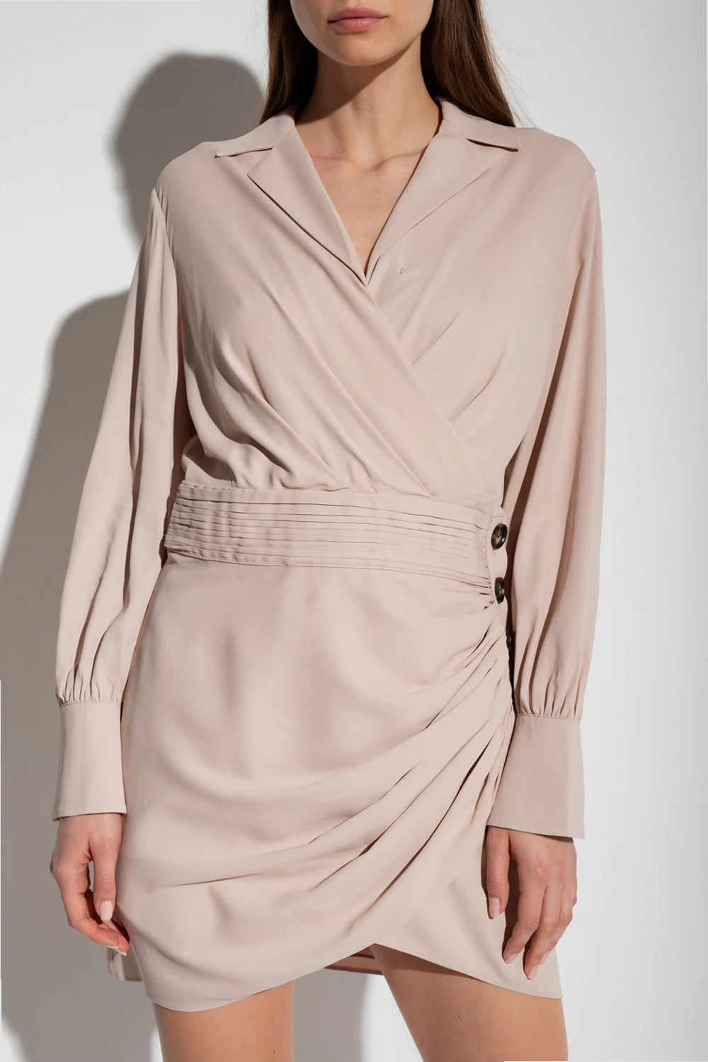 Short, blush pink wrap-over dress with button fastenings from Self Portrait. This garment is complete with a collar, draped details and long sleeves with button cuffs.