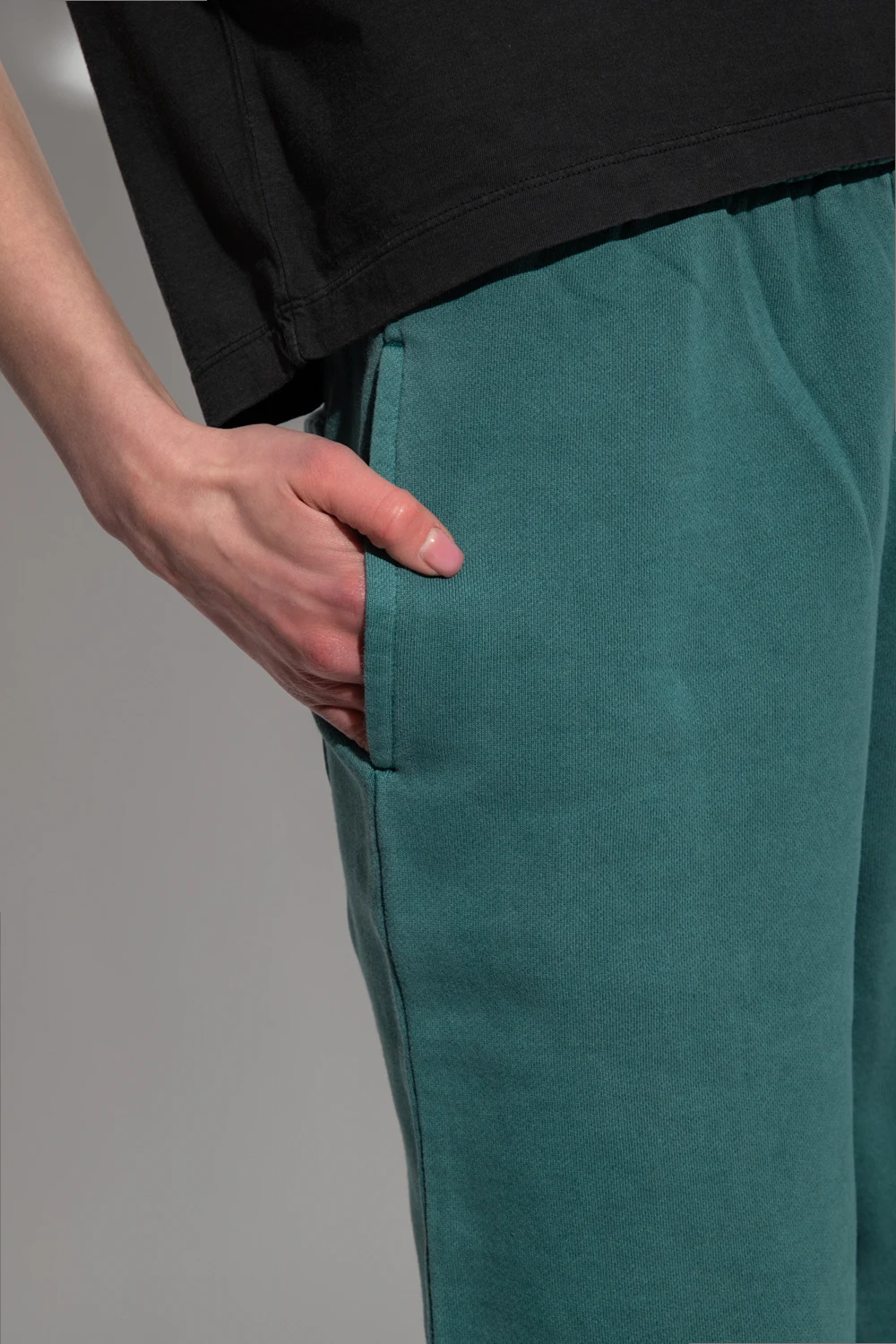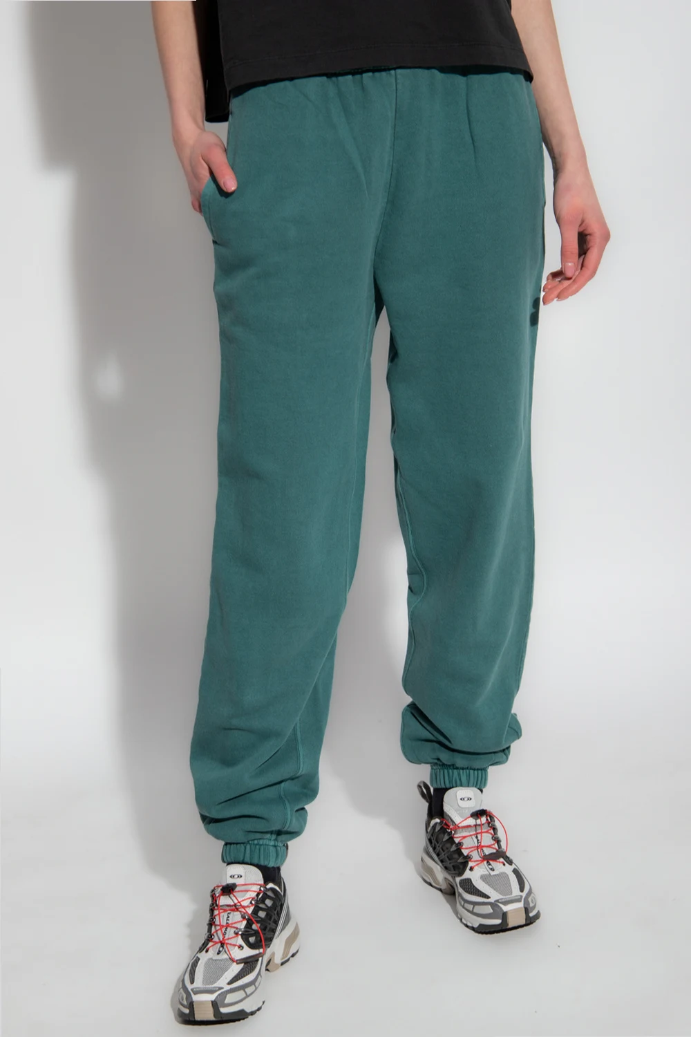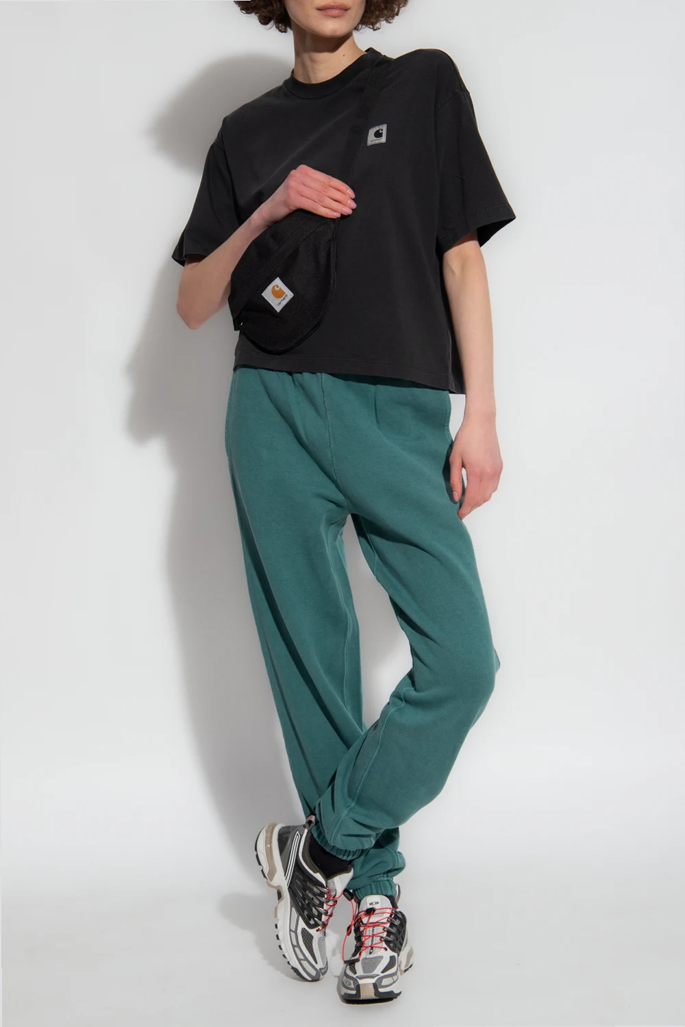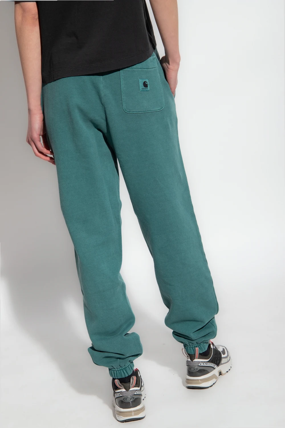 Green ‘Nelson’ trousers from Carhartt WIP. Made of cotton, this pair features a drawstring waist, three slip pockets, elasticated cuffs and a logo patch at the back