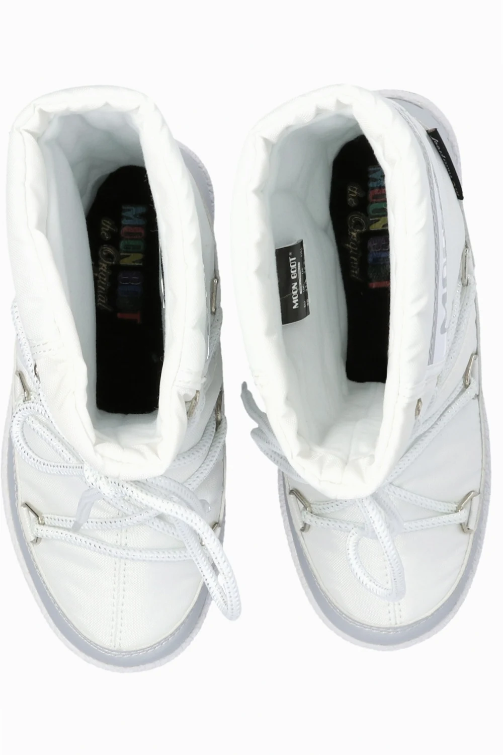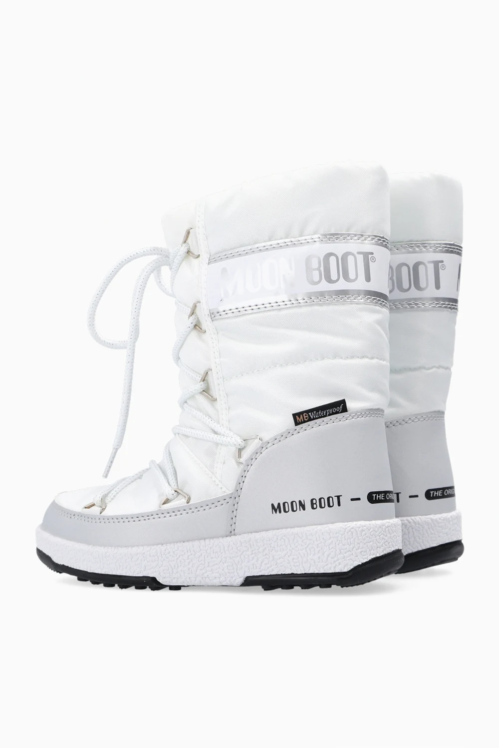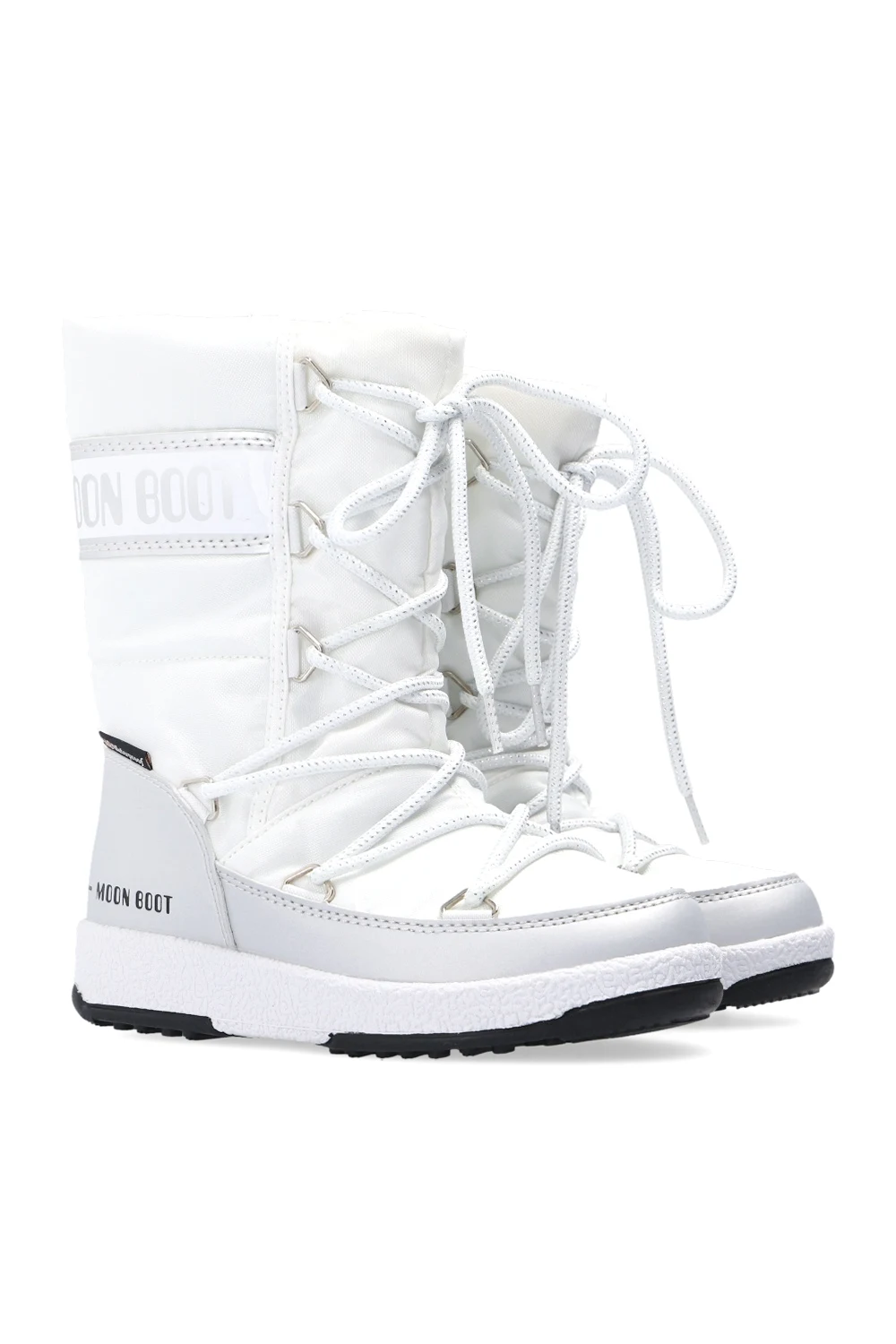 White and silver-tone ‘JR Girl Quilted WP’ snow boots from Moon Boot Kids. Designed with a waterproof upper, this lace-up pair sits on a black rubber sole and showcases a patch and printed black and silver-tone logo for the brand recognition.