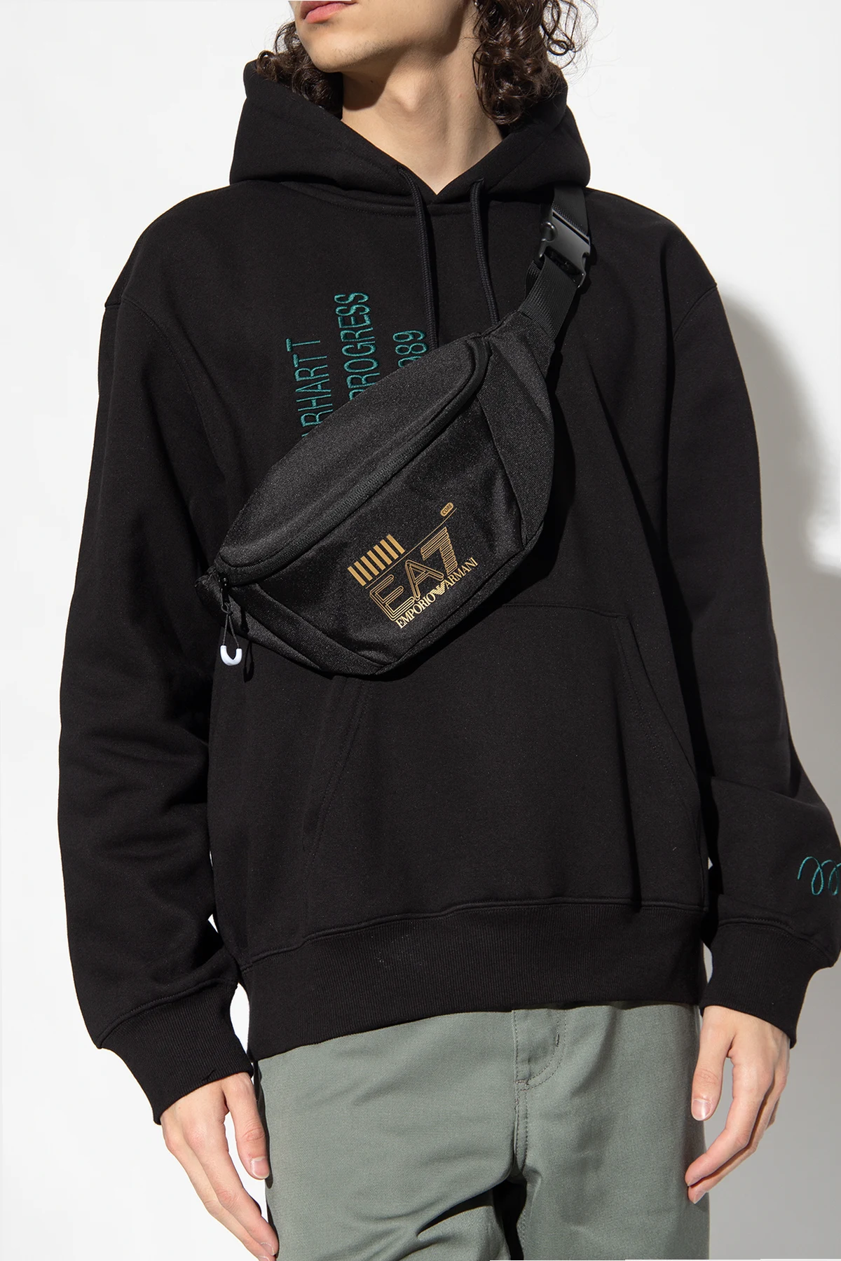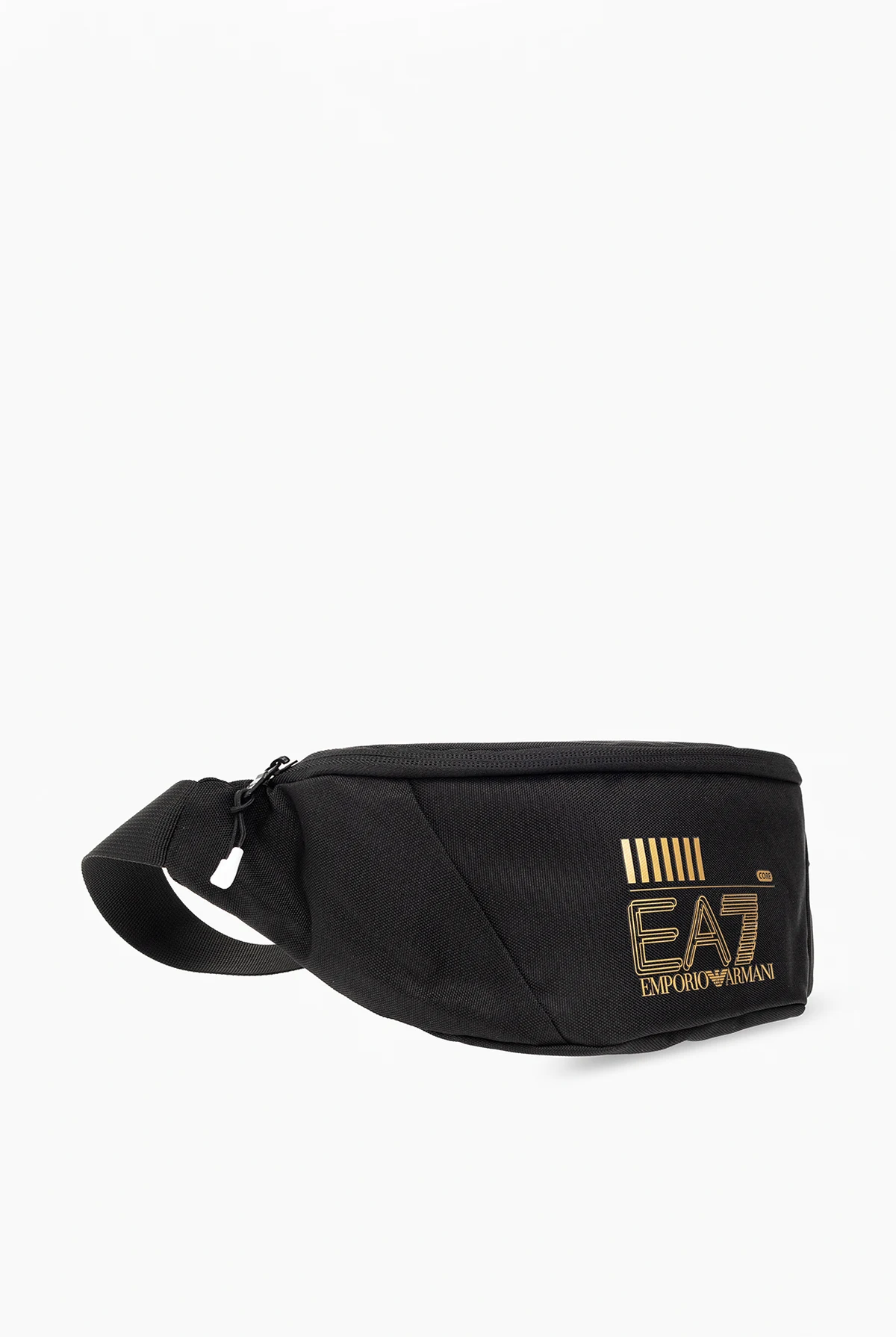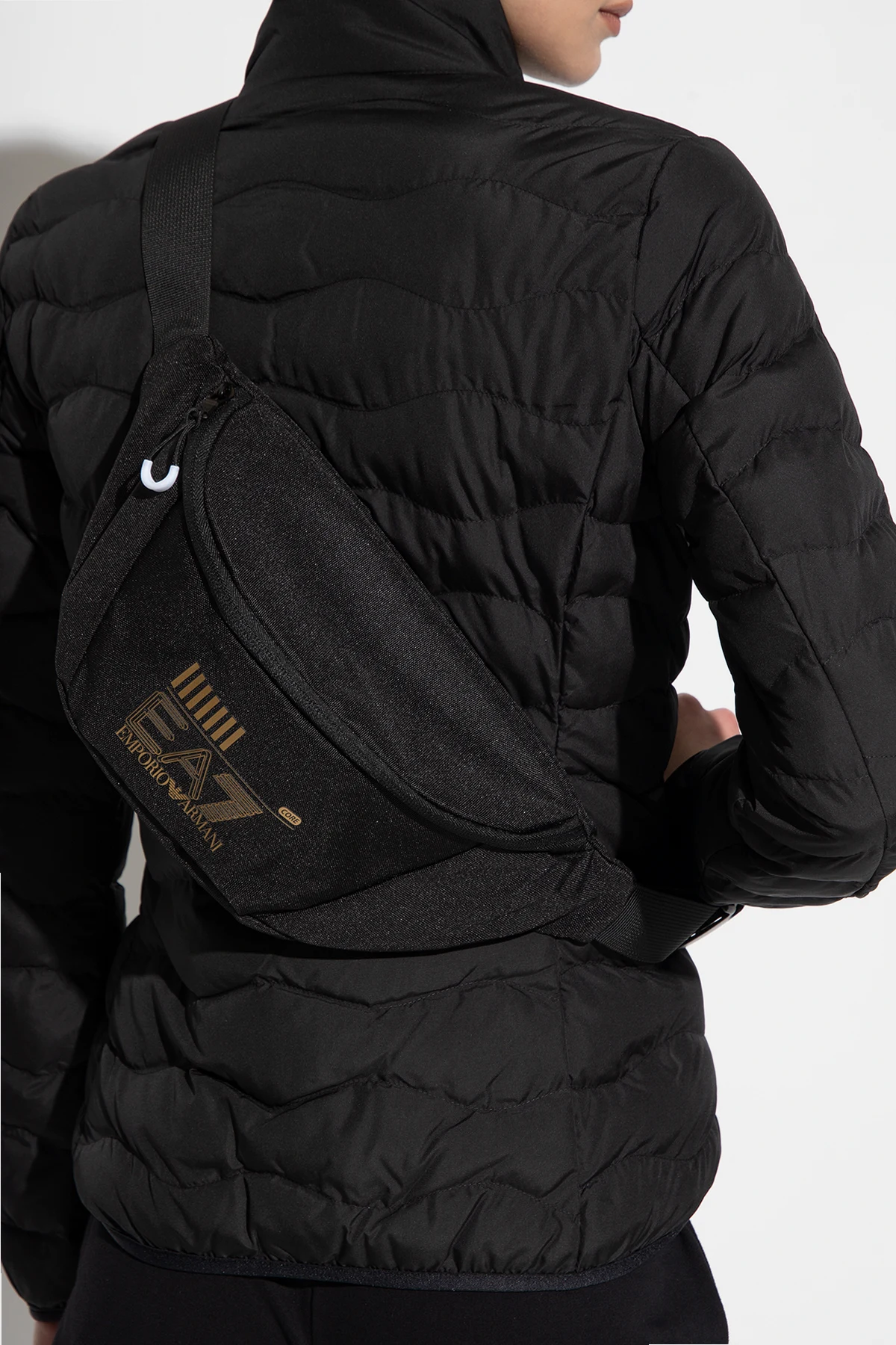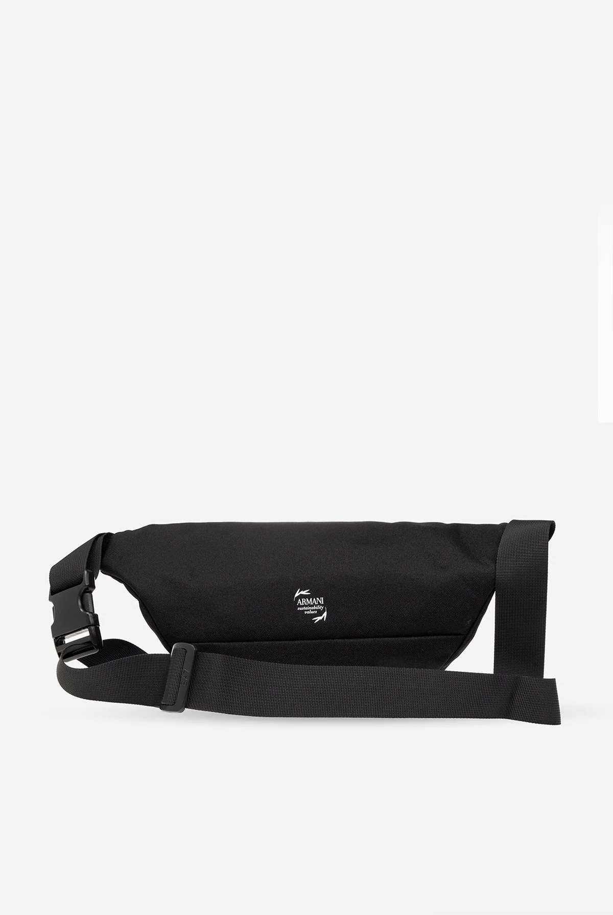 Black belt bag from EA7 Emporio Armani, the ‘Sustainable’ collection. Fastened with a zip, this model is decorated with a gold-tone logo print and complete with an adjustable belt, one internal compartment and black metal hardware.