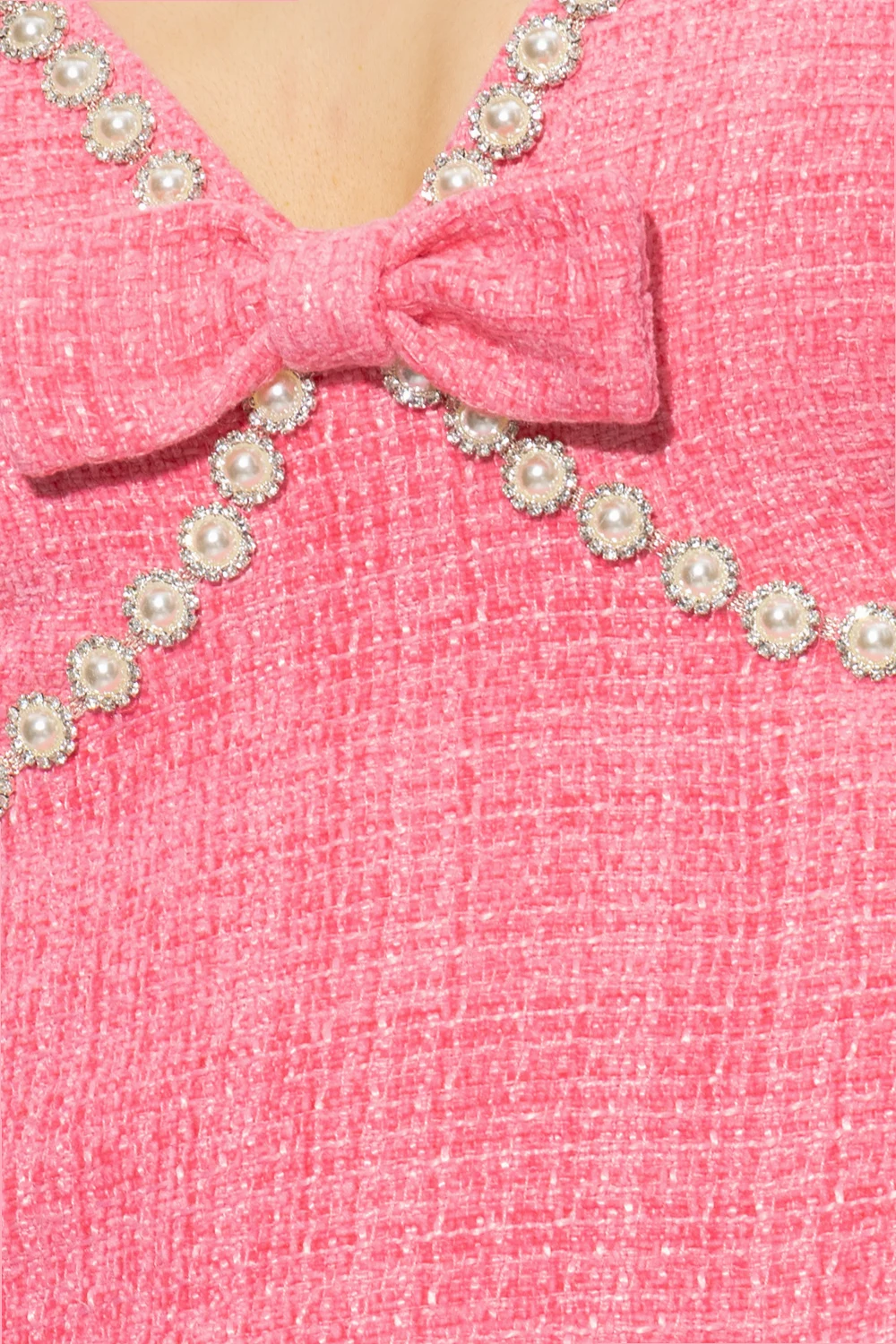 Pink sleeveless mini dress from Self Portrait. Made of boucle fabric, this fitted design features a concealed back zip and hook, V-neck with a decorative bow chain with crystals and faux pearl as well as a slit on the front.