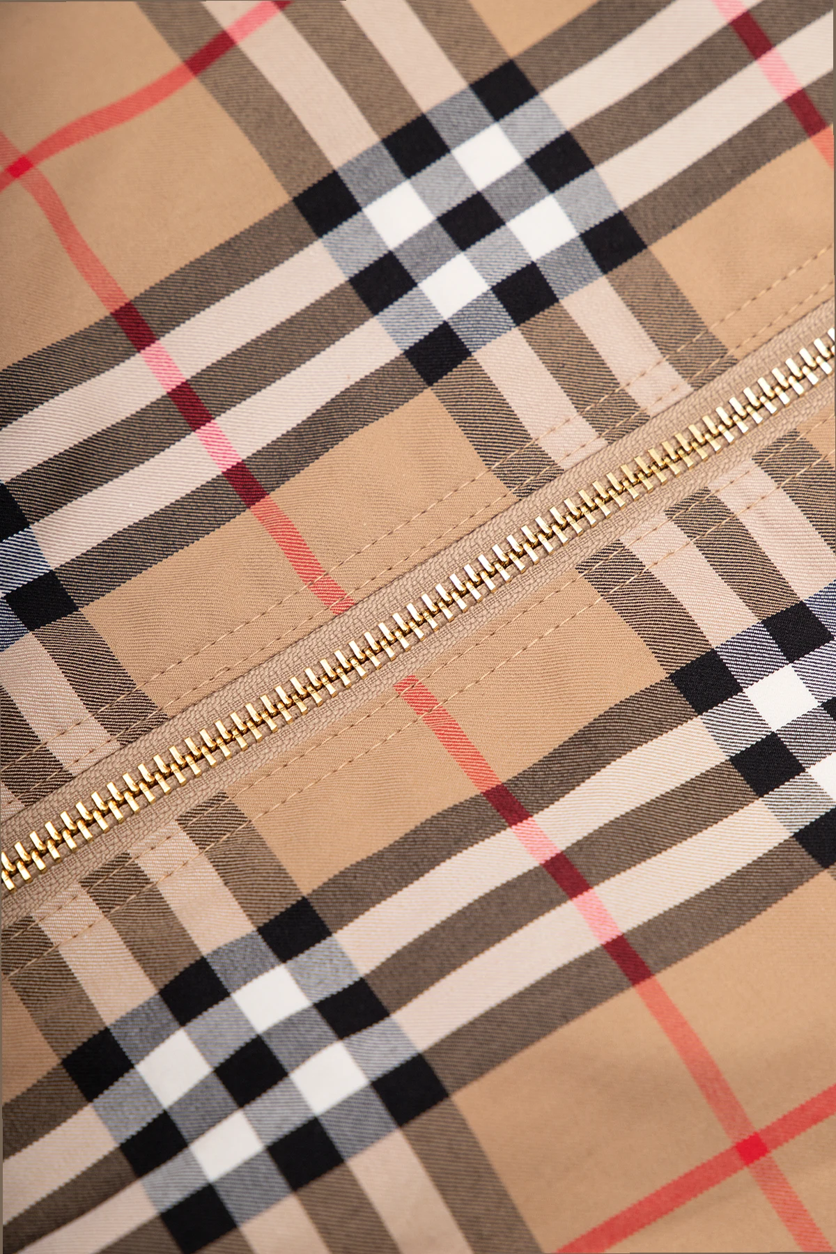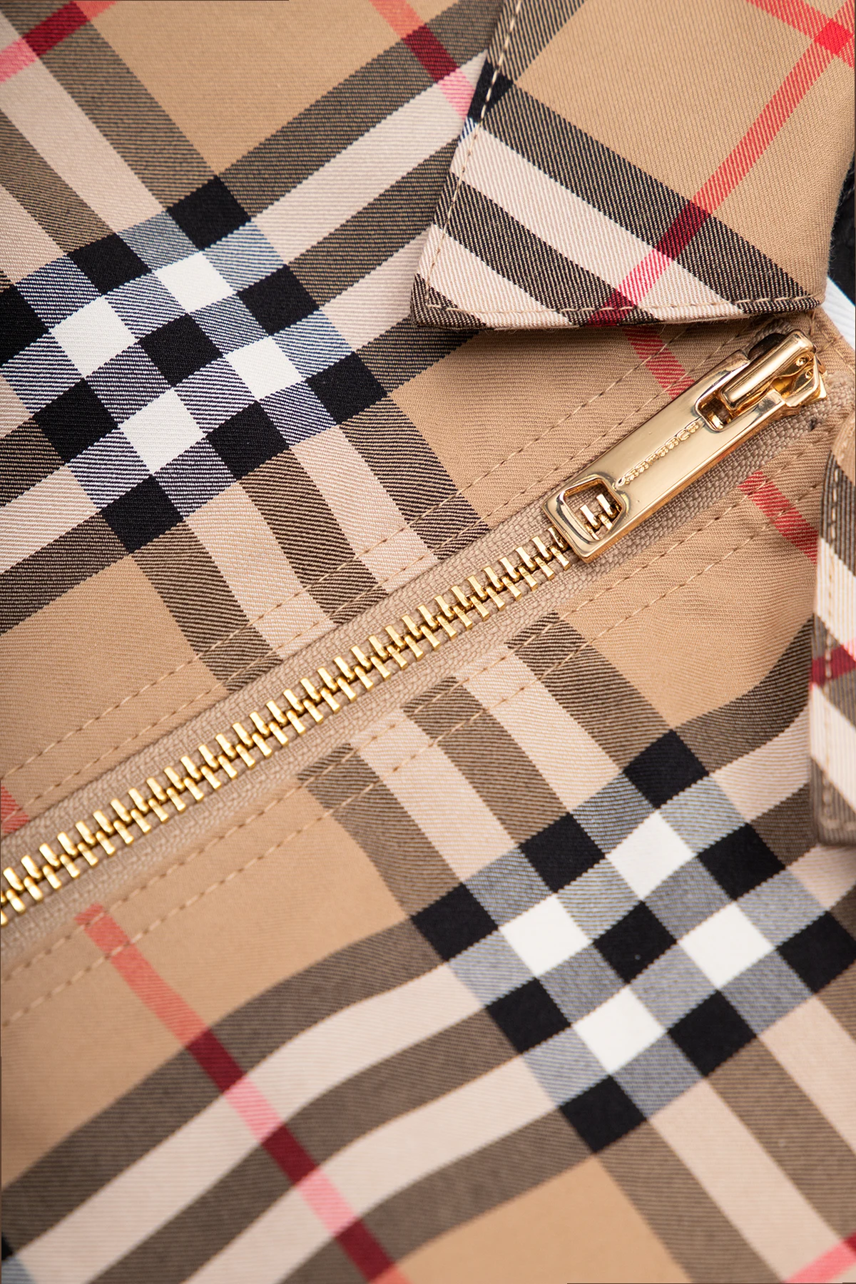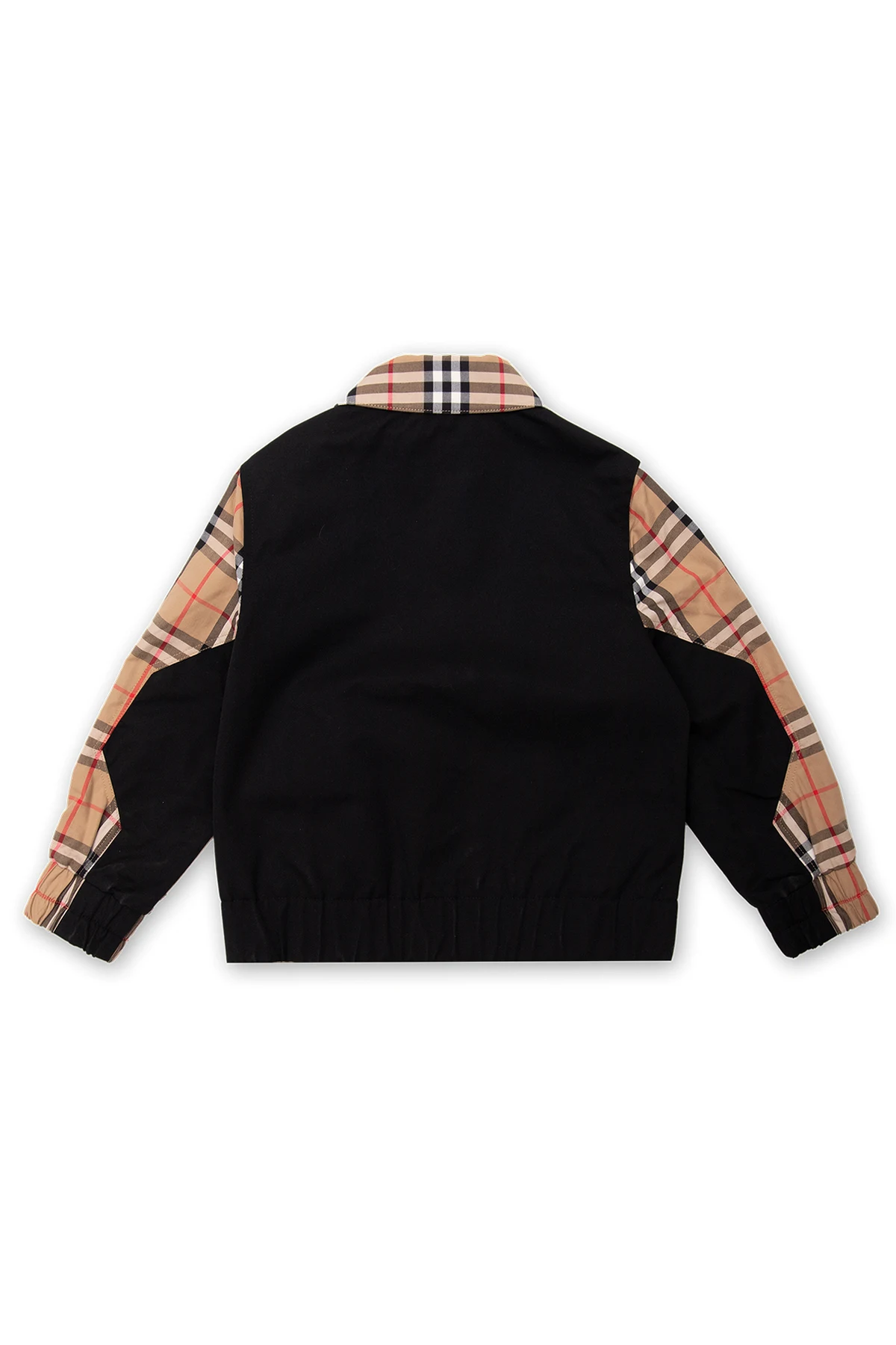 Beige and black jacket from Burberry Kids. Made of cotton, this style fastens with a gold-tone zipper and showcases the brand\'s signature colourful check pattern. It is complete with two front pockets with snaps and ribbing on the bottom hem and long sleeves.