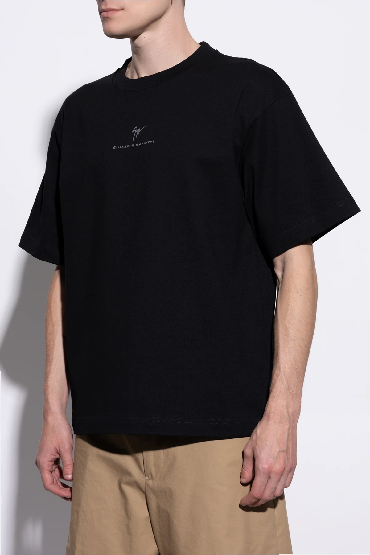 Introducing the Black Cotton T-shirt with Embroidered Logo from the exclusive collection of esteemed Italian designer Giuseppe Zanotti. Exuding sophistication, this garment captivates with its classic cut, featuring short sleeves and a timeless crew neck. The shirt\'s dominant black hue serves as a canvas for the meticulously embroidered \"Giuseppe Zanotti\" logo and the designer\'s signature, adding a touch of elegance. Crafted from the finest quality cotton, this t-shirt promises unparalleled comfort and durability. Embrace a minimalistic design that seamlessly transitions from casual to formal occasions, epitomizing versatility for the modern man. This t-shirt is a testament to Zanotti\'s legacy of meticulous craftsmanship and innovative design. Why Purchase This Product? Exclusive design by renowned designer Giuseppe Zanotti High-quality cotton for superior comfort Elegant embroidered logo for a touch of sophistication Versatile style suitable for various occasions