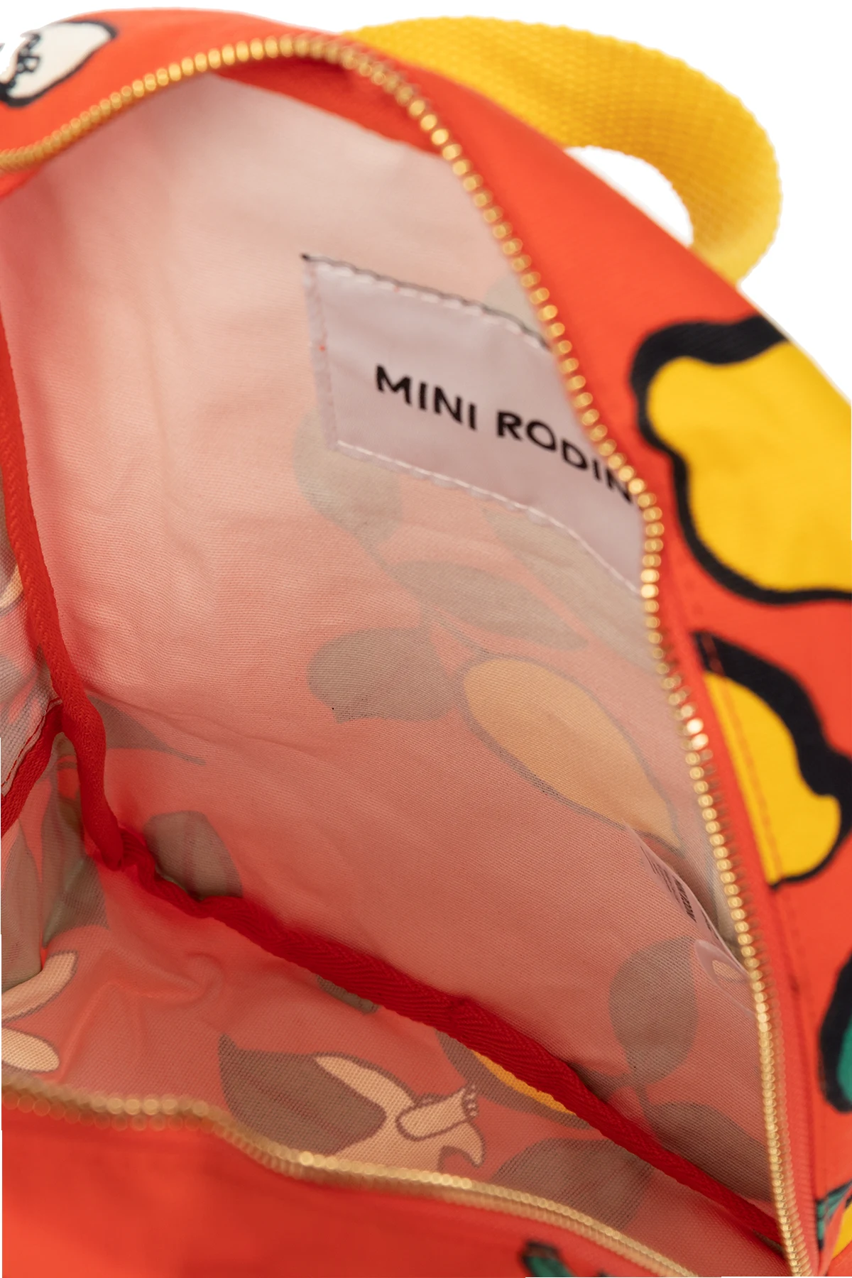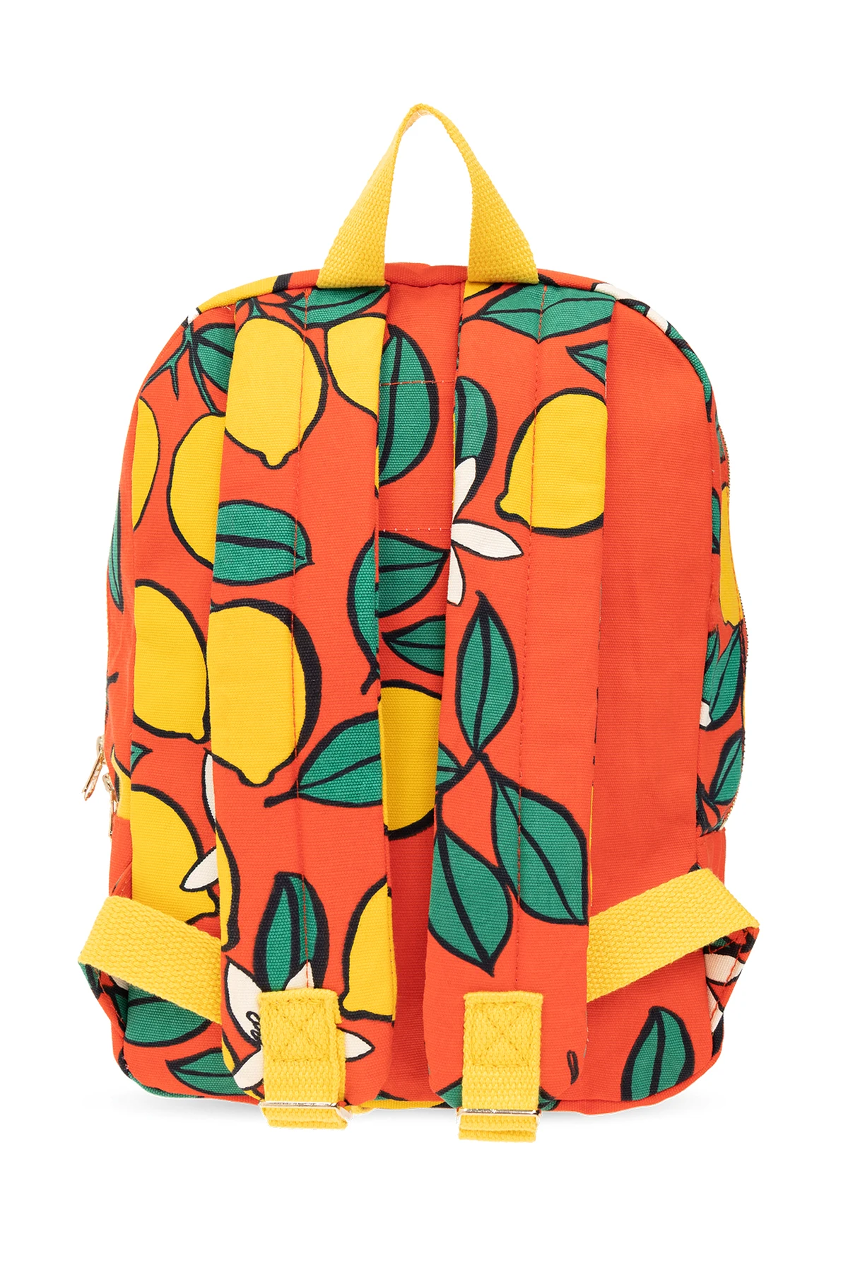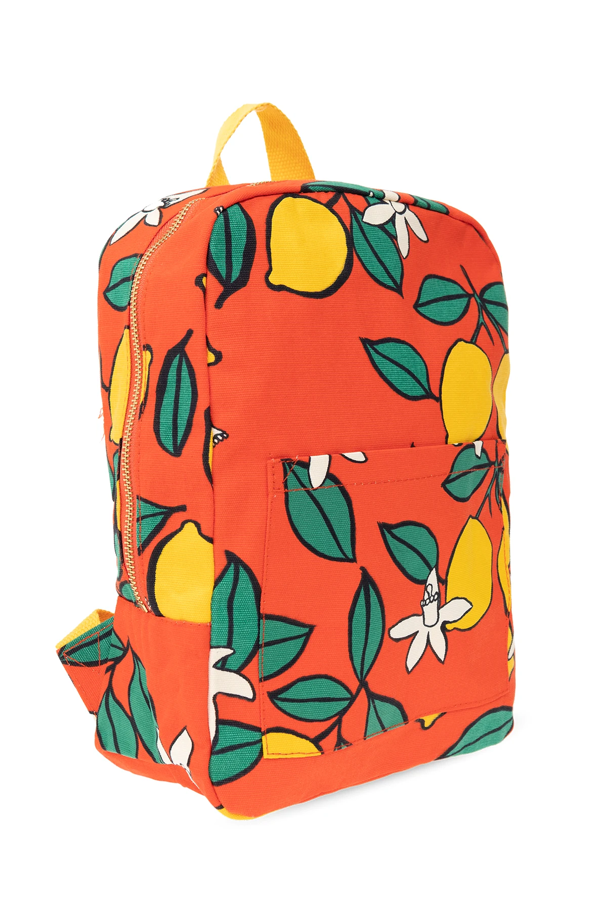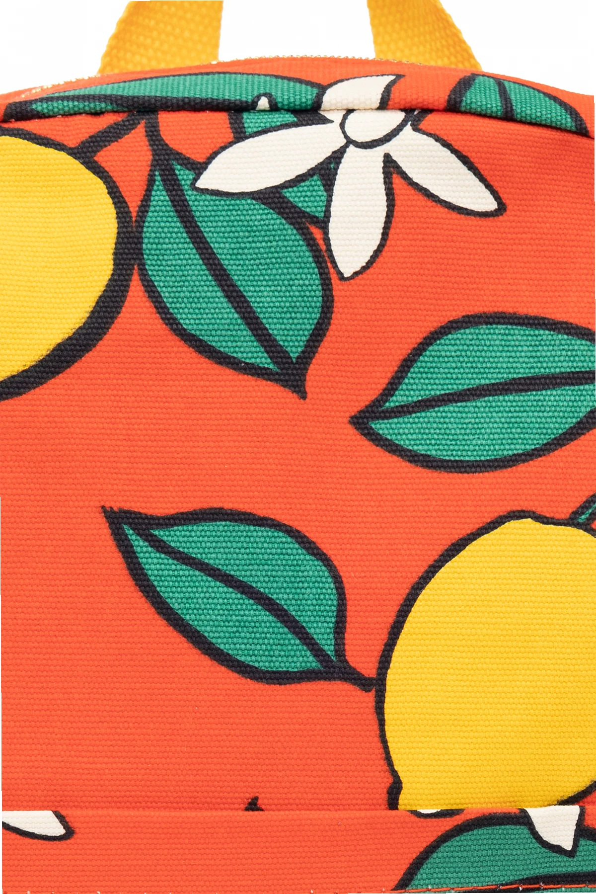 Red backpack from Mini Rodini. Crafted from organic cotton, this design fastens via a two-way zip and showcases a colourful pattern with lemons and flowers. It is complete with a half-round handle, adjustable shoulder straps, one slip pocket on the front, gold-tone metal hardware and one internal compartment.