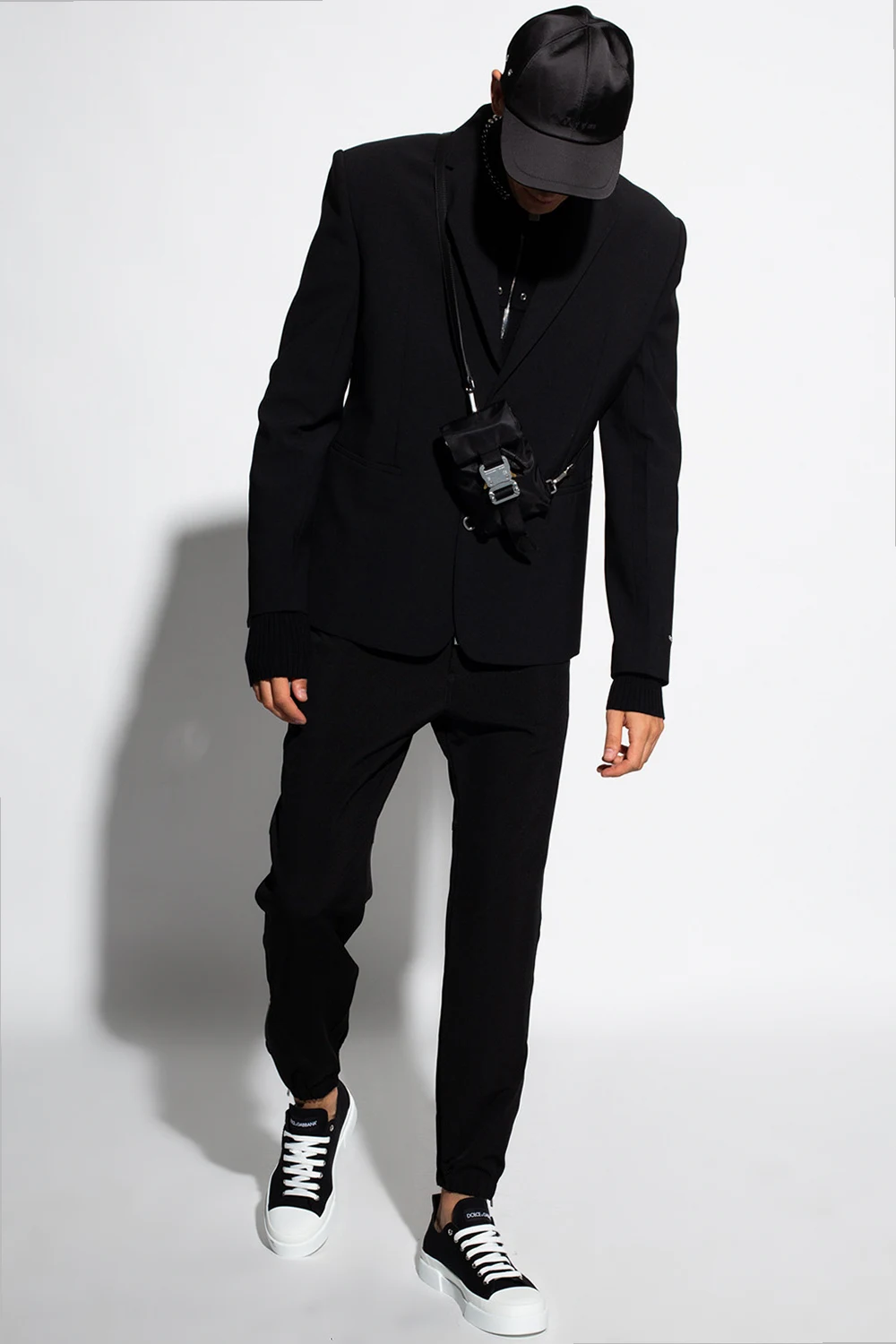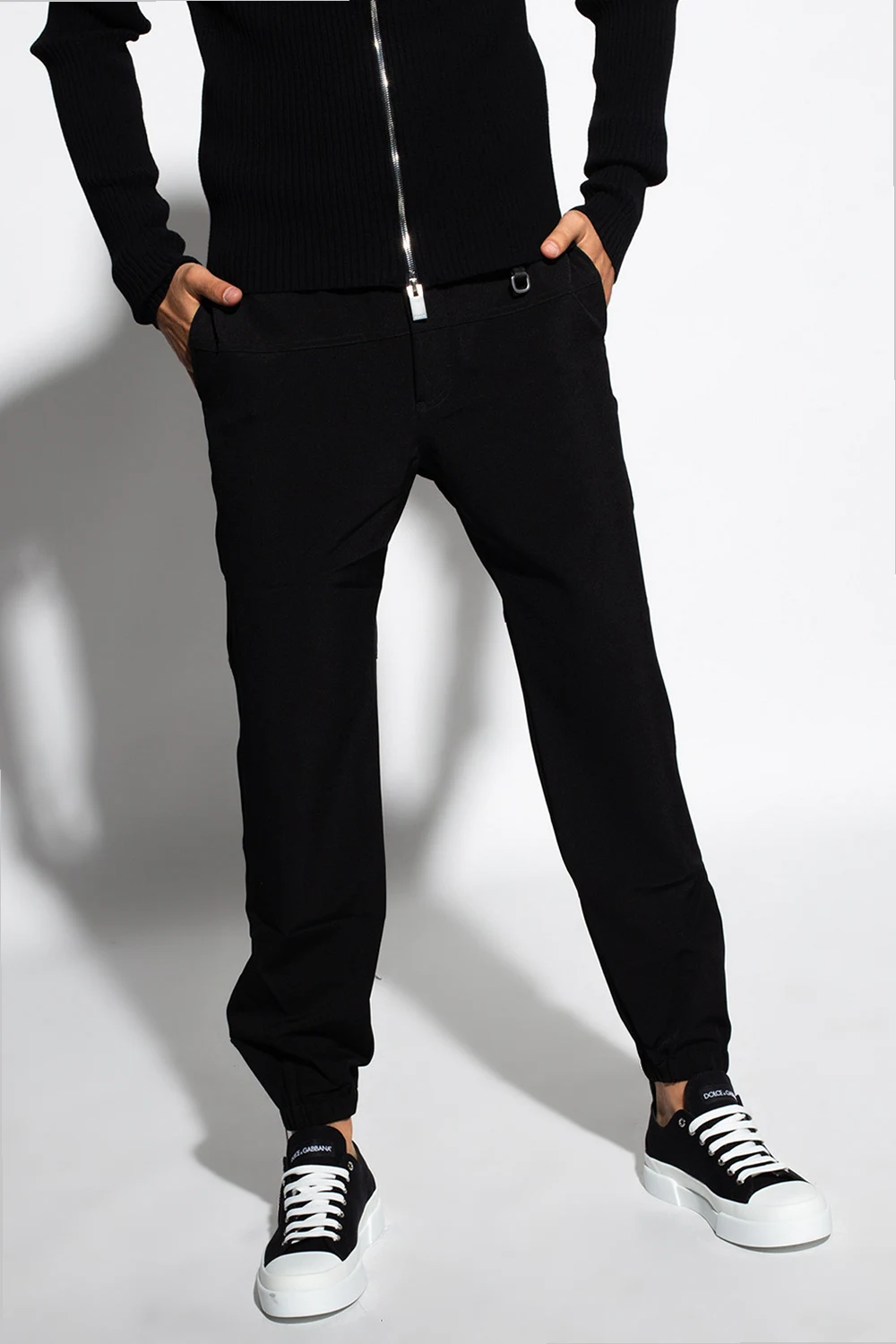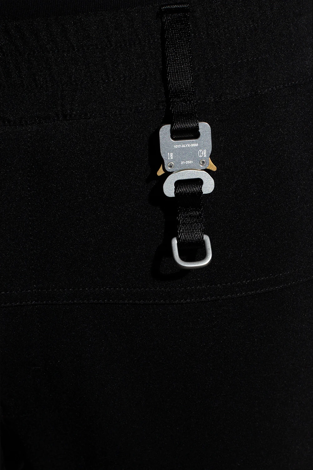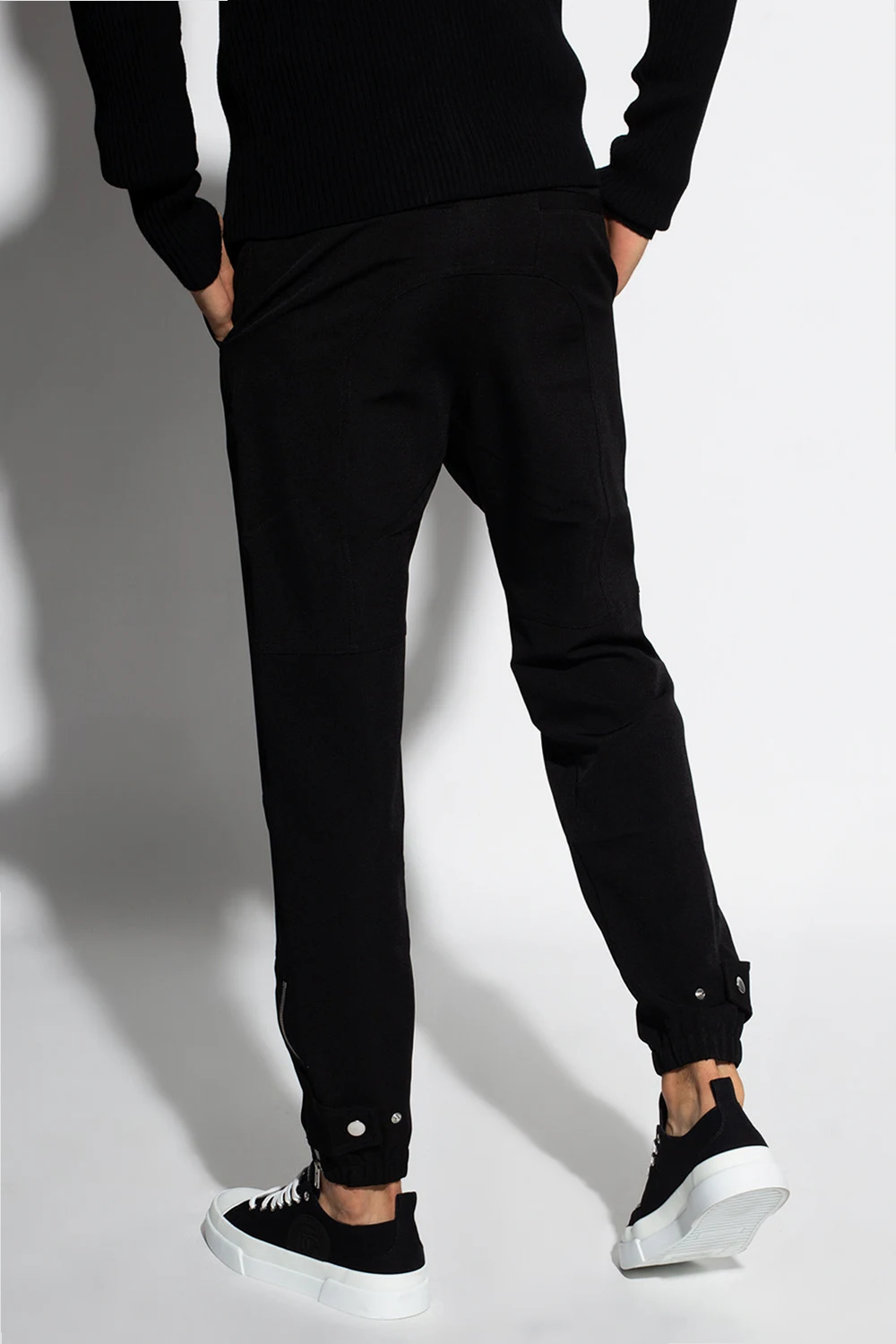 Black sweatpants from 1017 ALYX 9SM. Fastened with a zip, this pair features an elastic waistband, four slip pockets, metal appliqué with the label’s signature rollercoaster buckle and elasticated cuffs with zip and snap fastenings.