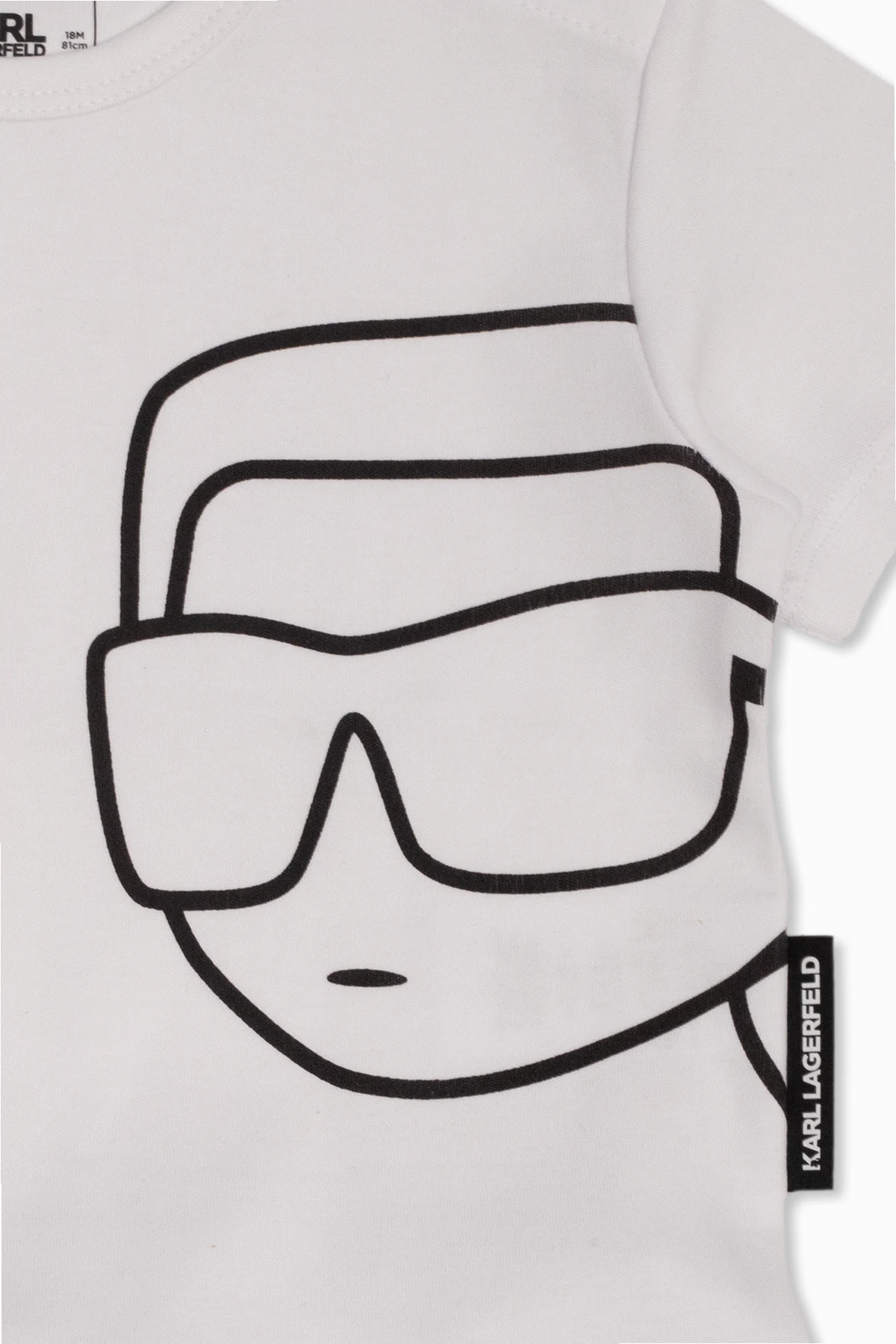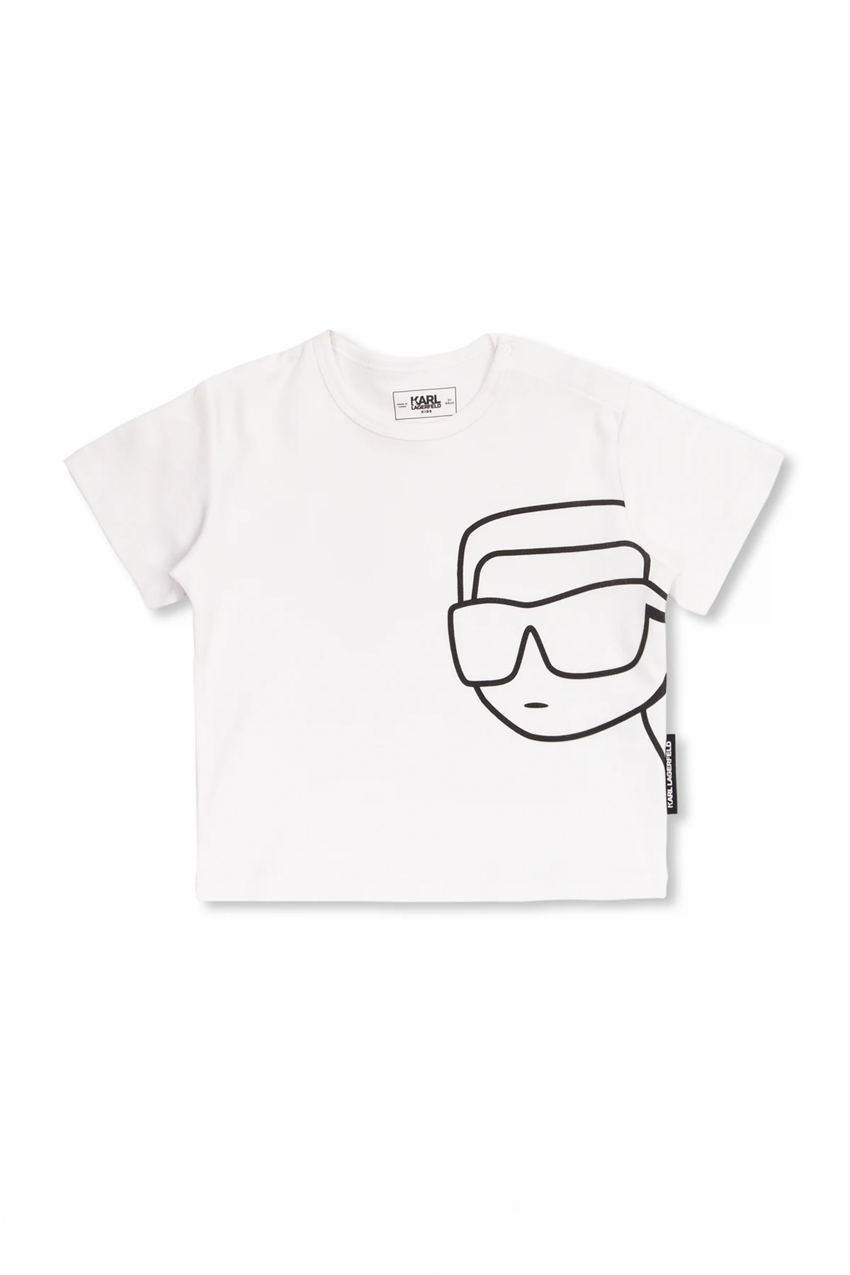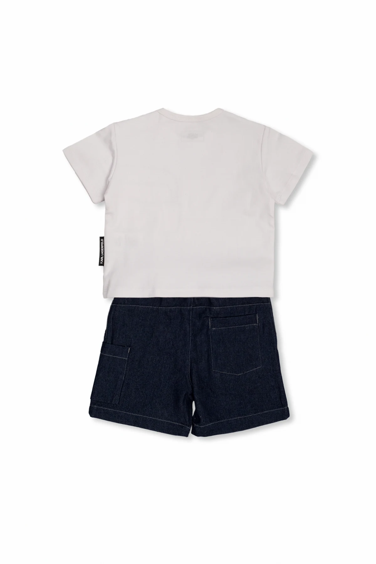 T-shirt and shorts set from Karl Lagerfeld Kids. The white T-shirt features snap fastenings at the shoulder, a black logo print, crew neck and short sleeves. The navy denim shorts are complete with a black elastic waistband with a logo, snap closure, pleat details and four slip pockets.