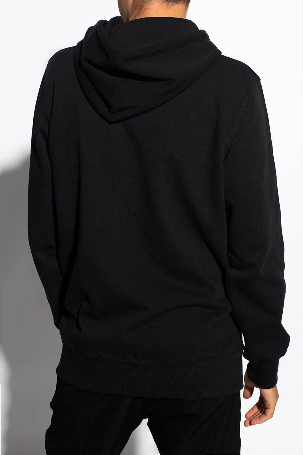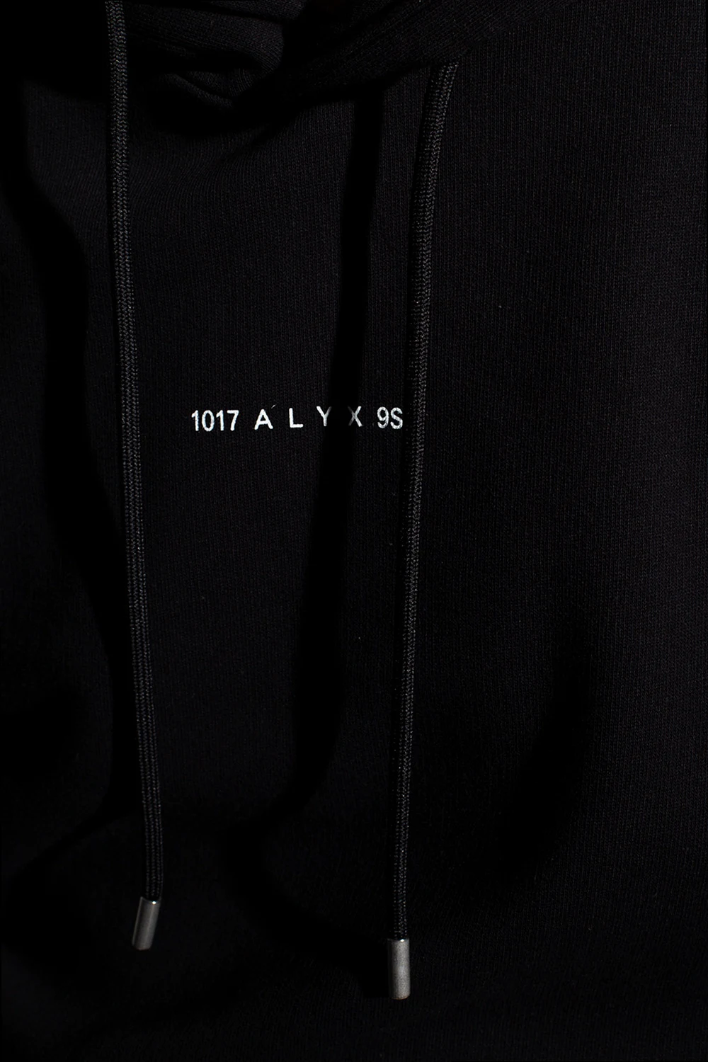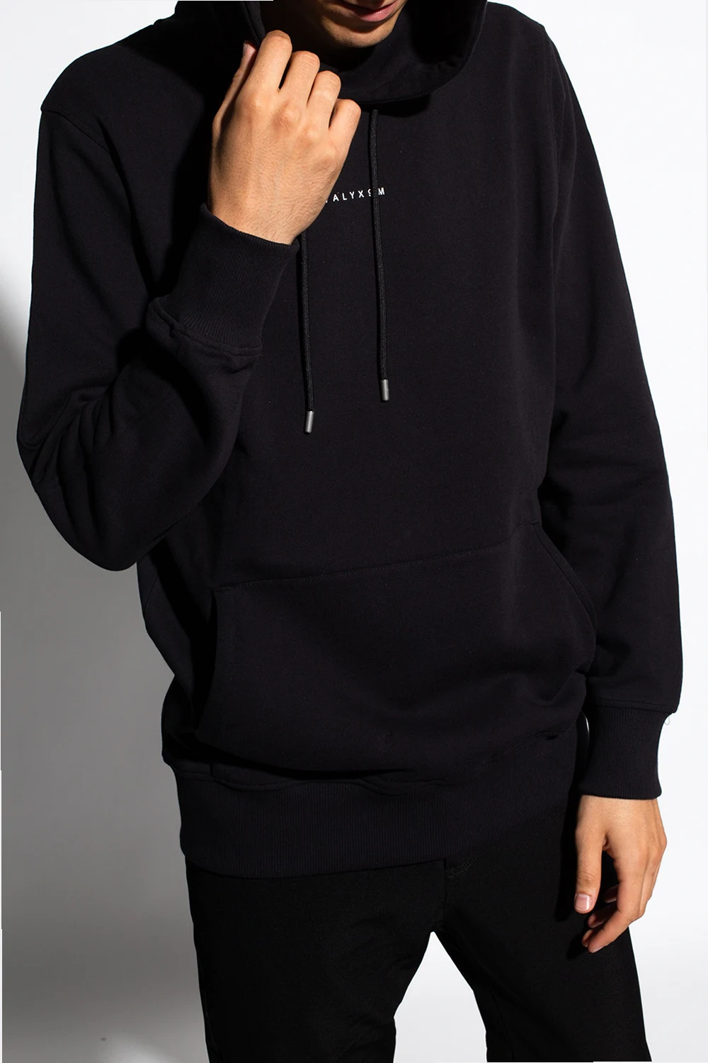 Black hoodie from 1017 ALYX 9SM. Crafted from cotton, this garment features a drawstring hood, white logo print, slip pocket and ribbed trims at the hem and cuffs.