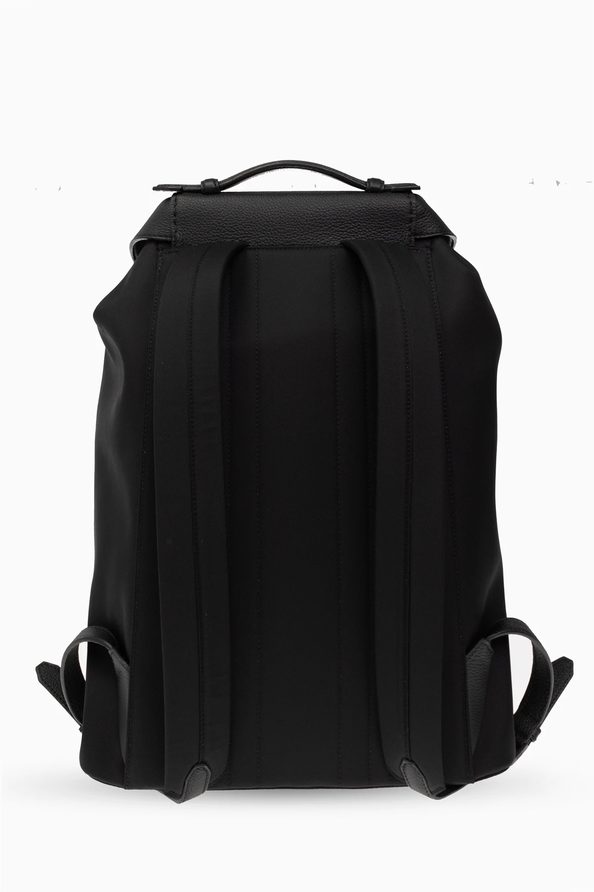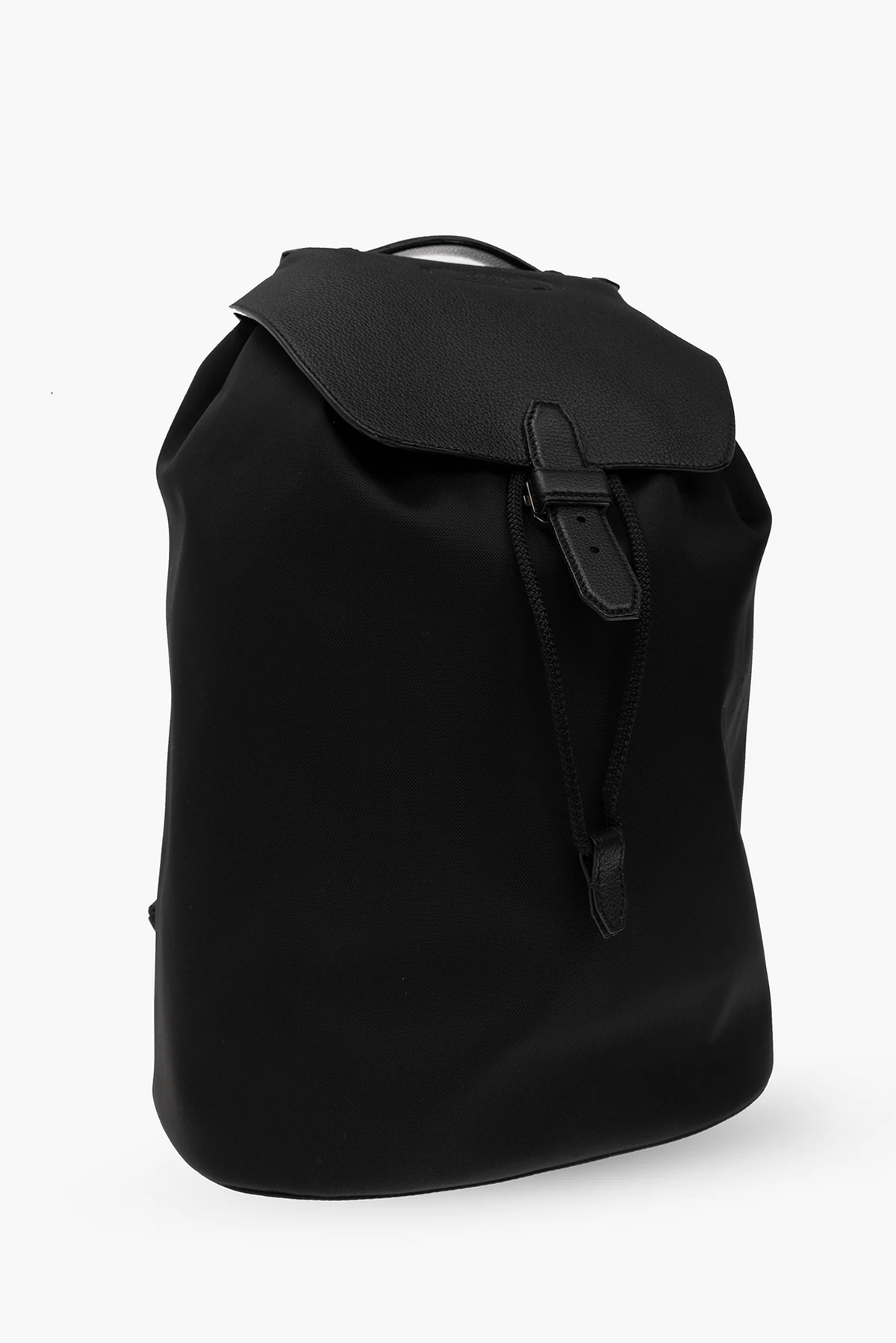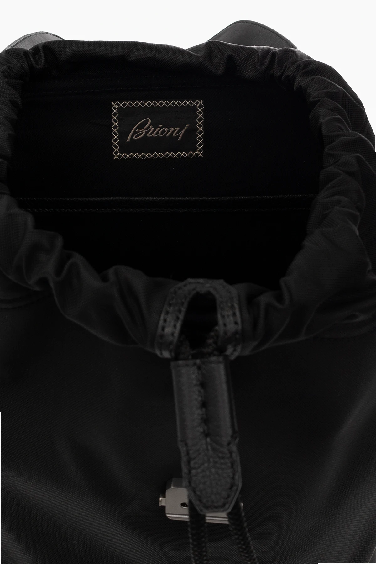 Black backpack from Brioni. Crafted from fabric and trimmed with leather, this design cinches closed with drawstrings, fastens with a snap and features an embossed logo on the front, adjustable shoulder straps, one handle and one internal compartment with a slip pocket.