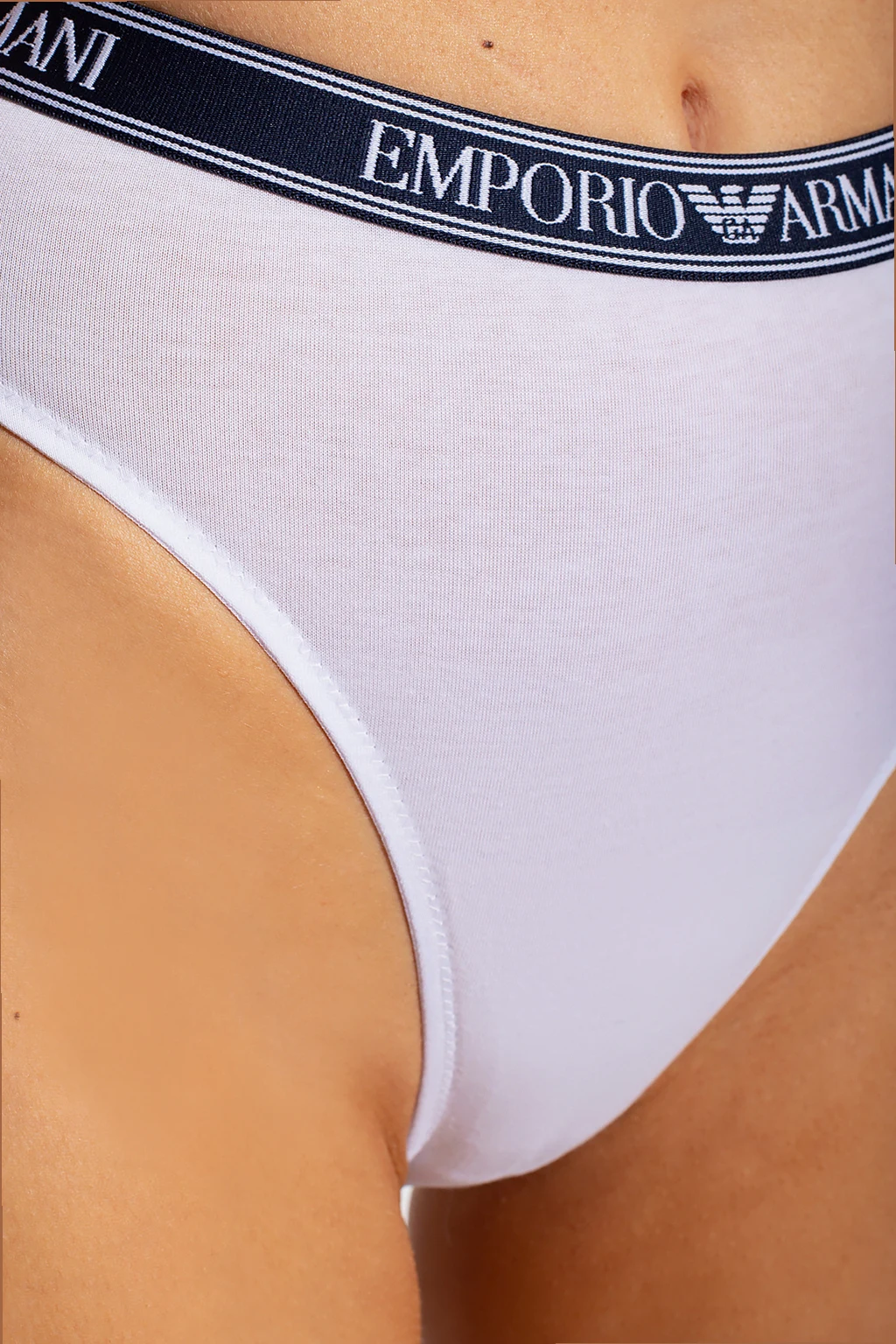 White briefs from Emporio Armani. Made of cotton with a high-rise waist, this pair features a navy blue waistband with an embroidered black logo.