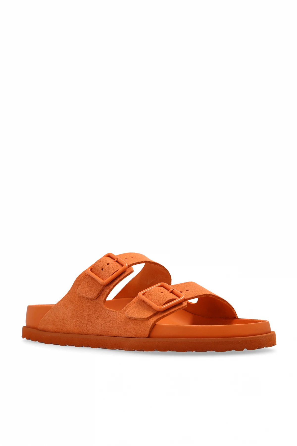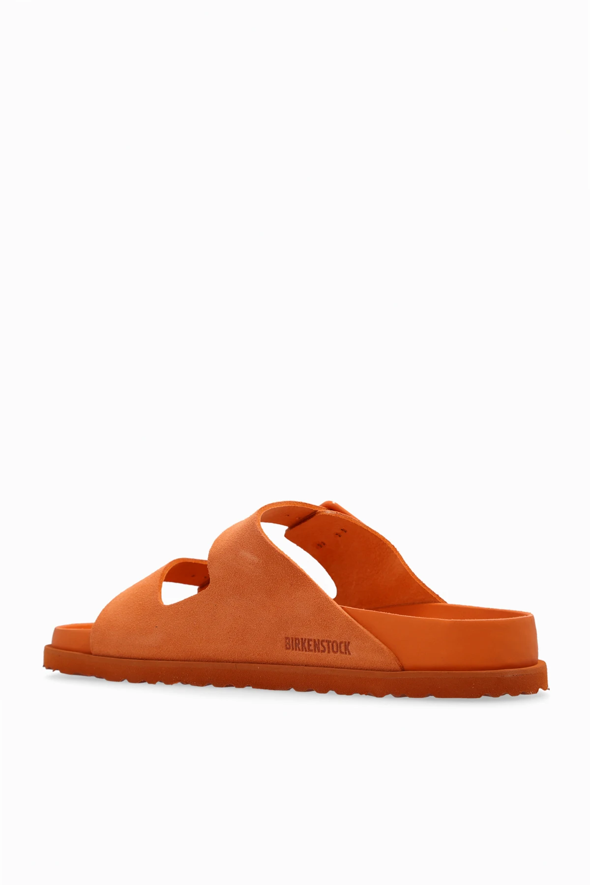 Introducing the ‘Arizona Avantgarde’ Slides by Birkenstock 1774, a fusion of traditional craftsmanship and contemporary flair. Crafted with precision, these slides feature a vibrant orange hue that captures the essence of modern elegance. The luxurious suede upper, paired with adjustable straps adorned with signature buckles, ensures a bespoke fit and underscores the brand’s commitment to quality and design. The interior, lined with supple leather, promises unmatched comfort and durability. Meanwhile, the innovative sole, a blend of natural cork and EVA foam, offers resilience and support, making every step a testament to the wearer\'s discerning taste. The subtle inclusion of the brand’s logo on the strap not only signifies authenticity but also serves as a hallmark of luxury. Why Purchase the ‘Arizona Avantgarde’ Slides? Vibrant Aesthetic: The striking orange color adds a bold touch to any ensemble. Customizable Comfort: Adjustable straps ensure a perfectly tailored fit. Luxurious Materials: Premium suede coupled with a leather lining offers supreme comfort. Unparalleled Support: Cork and EVA sole blend provides durability and cushioning. Iconic Branding: Signature logo detailing affirms the slides\' authenticity and heritage.