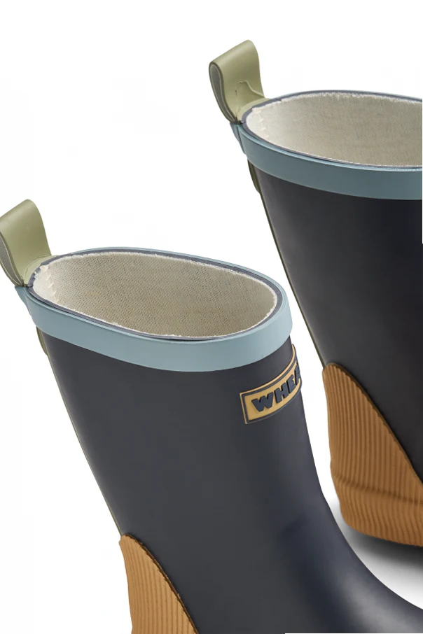 Crafted from premium, matte rubber, each pair promises unrivaled durability and protection against the elements. Inside, a light, softly insulated textile lining envelops little feet in cozy warmth. Subtle yet striking accents—a light blue trim, olive heel and grip details, and a honey-brown textured sole—underscore the boots’ unique character and sophisticated allure.