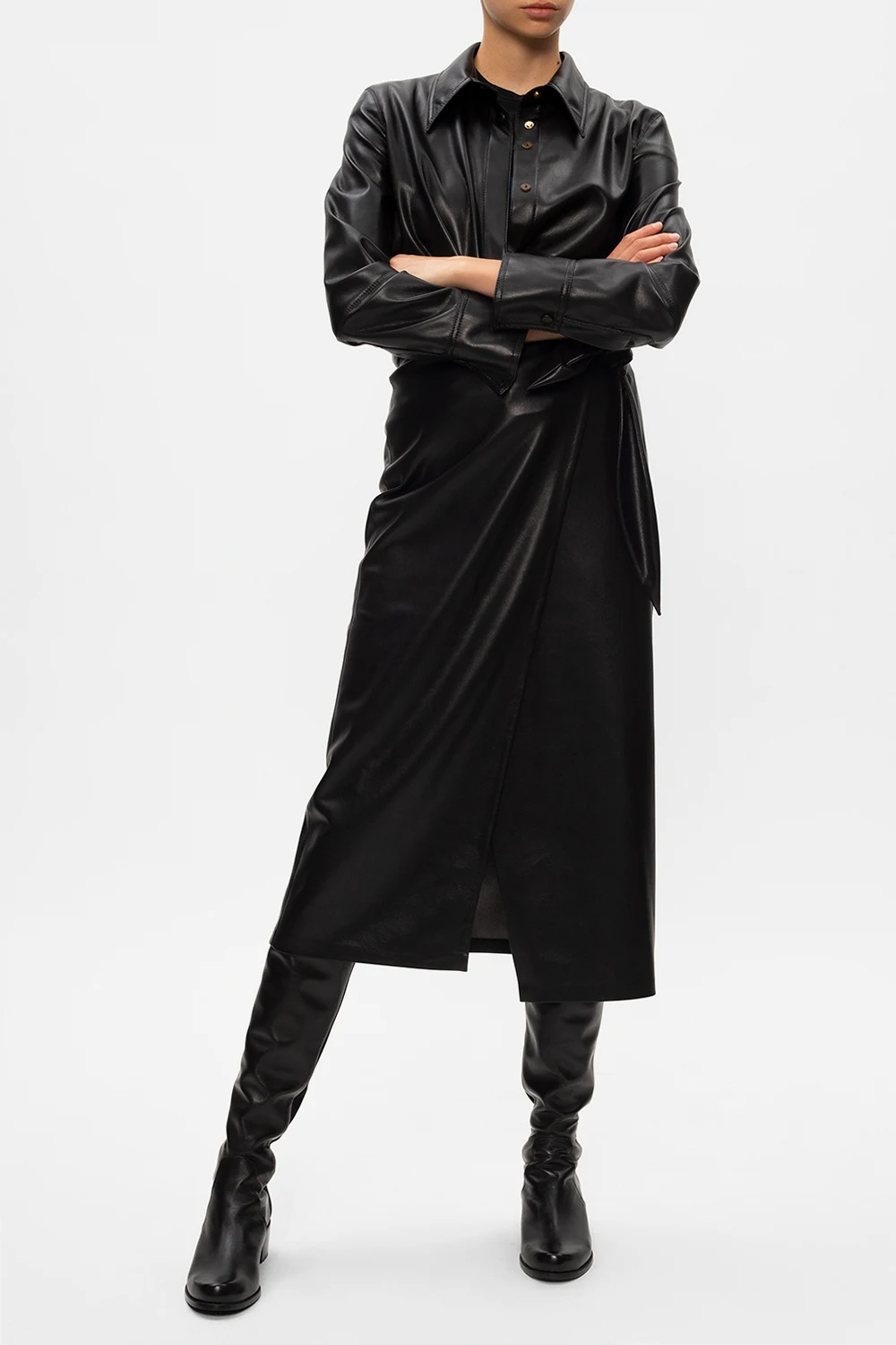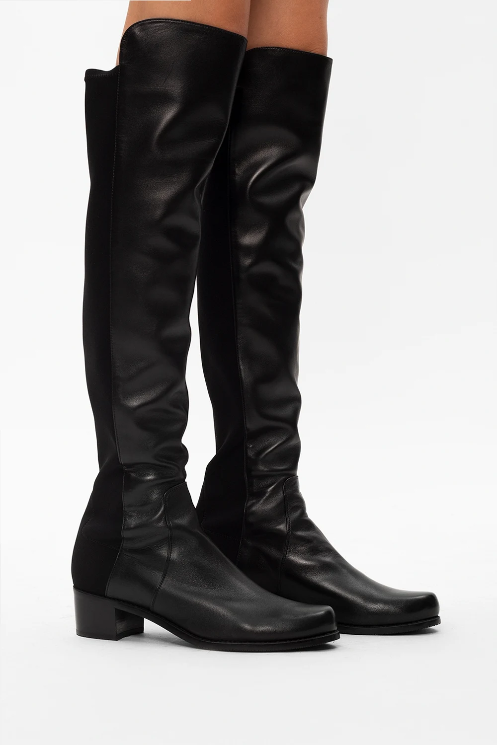 Black ‘Reserve’ heeled boots from Stuart Weitzman. Crafted from leather, this model employs elastic panels along the calves and a rubber sole at the base.