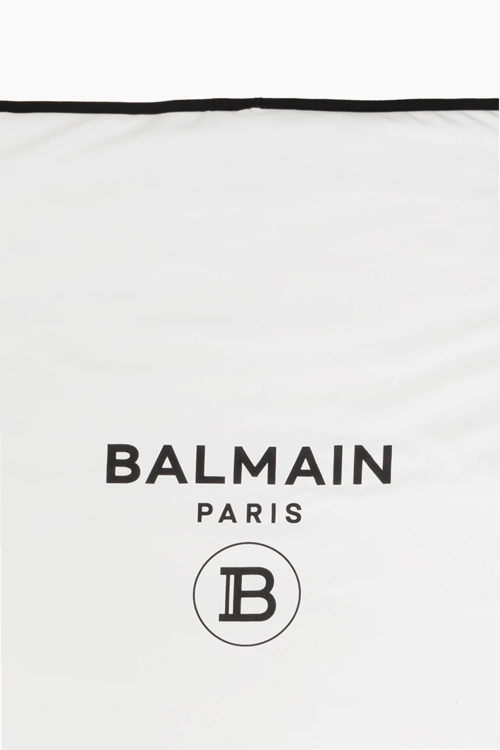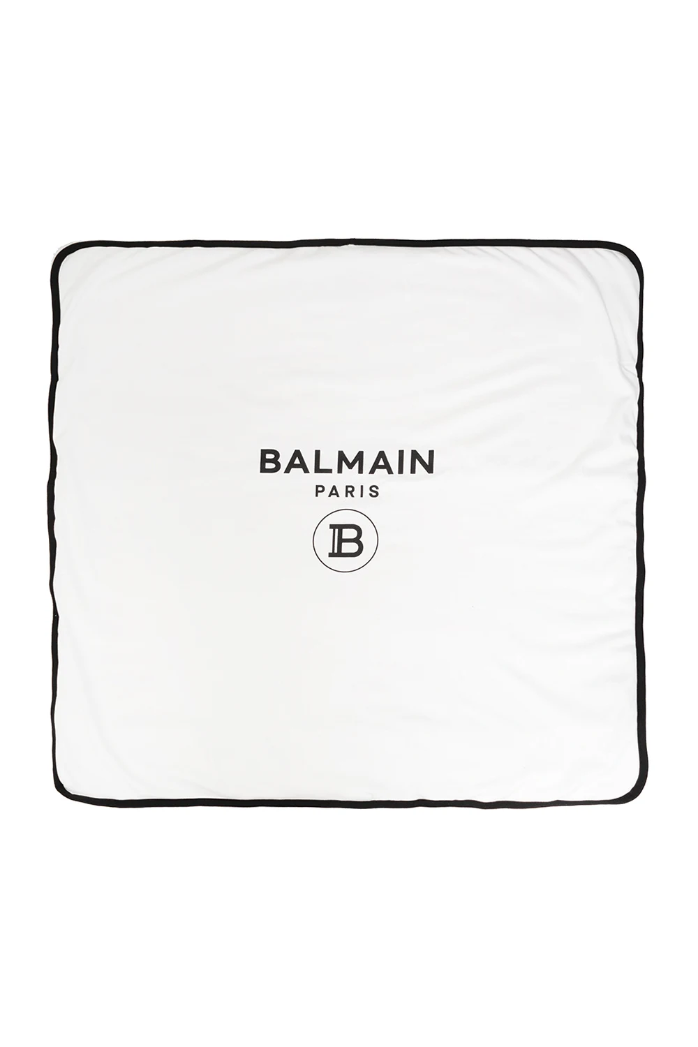 White baby blanket from Balmain Kids. Made of cotton, this item features a printed black logo and binding on the edges.
