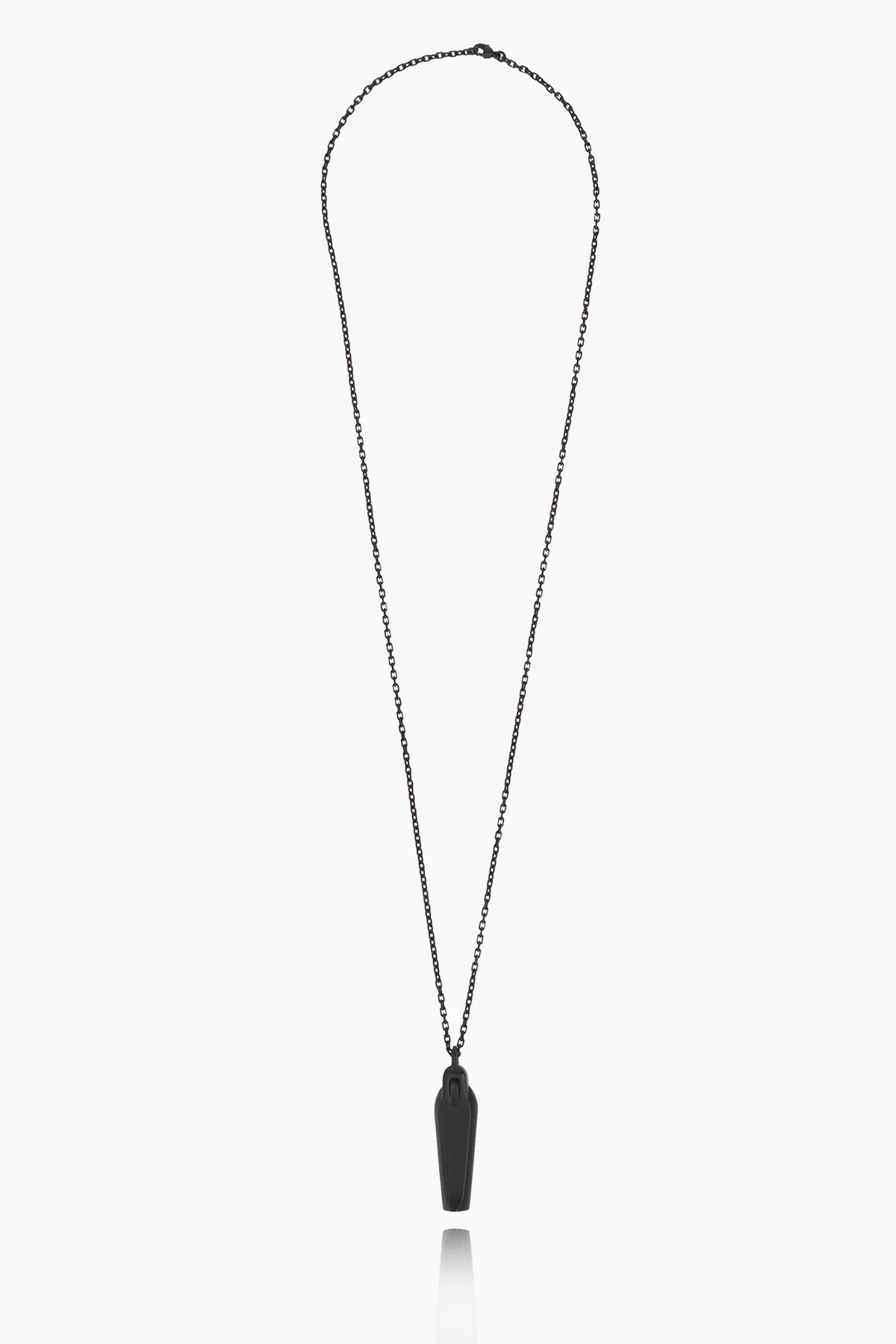 Black necklace from Rick Owens. Made of brass, this item features a sarcophagus pendant with an engraved logo as well as a lobster clasp closure.