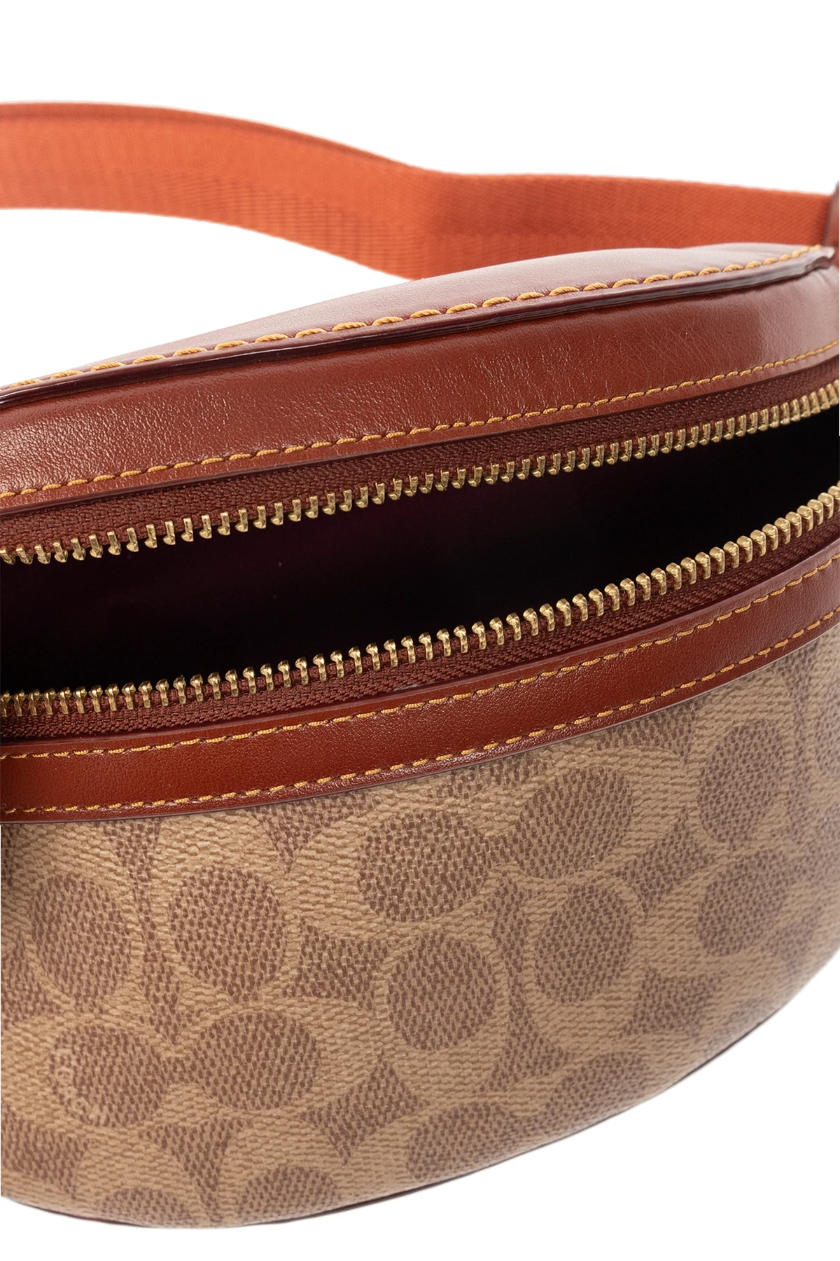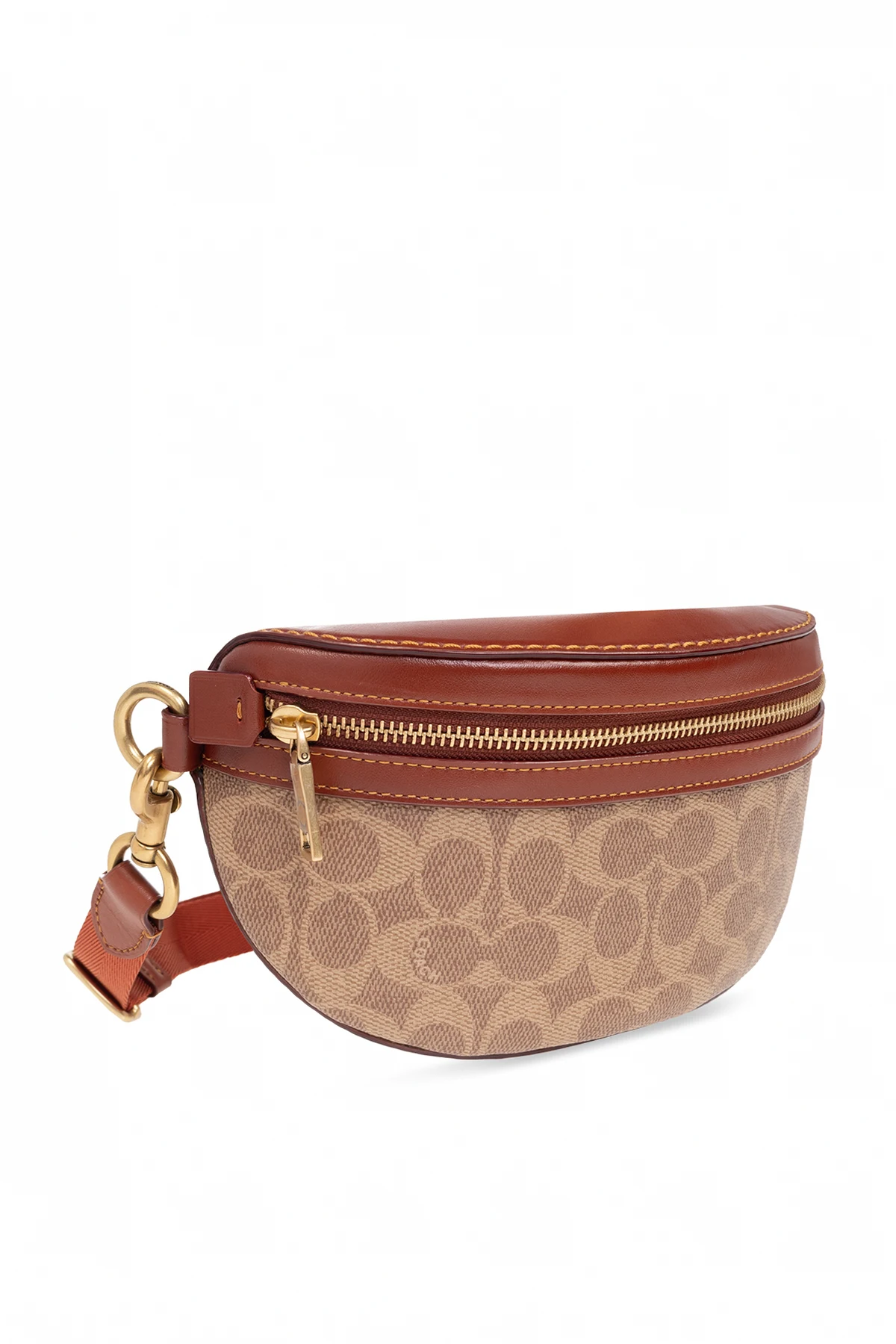 Beige and brown ‘Bethany’ belt bag from Coach. Made of canvas with a monogram and leather trims, this design features a zip fastening, zipped back pocket, adjustable strap, one internal compartment and gold-tone metal hardware.