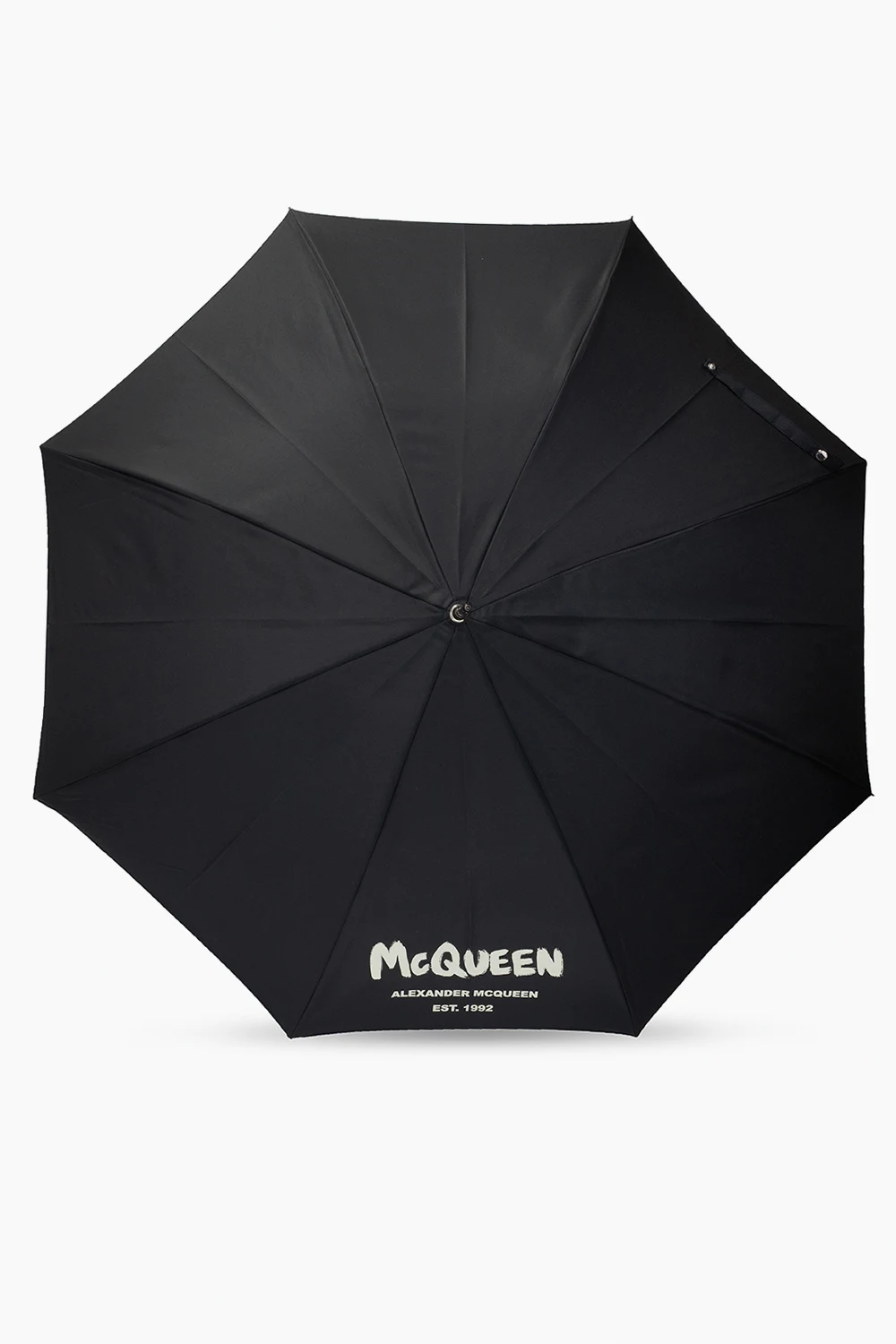 Black umbrella from Alexander McQueen. Embellished with a ‘McQueen Graffiti’ print in beige, this design features a leather-trimmed handle with an engrave logo.