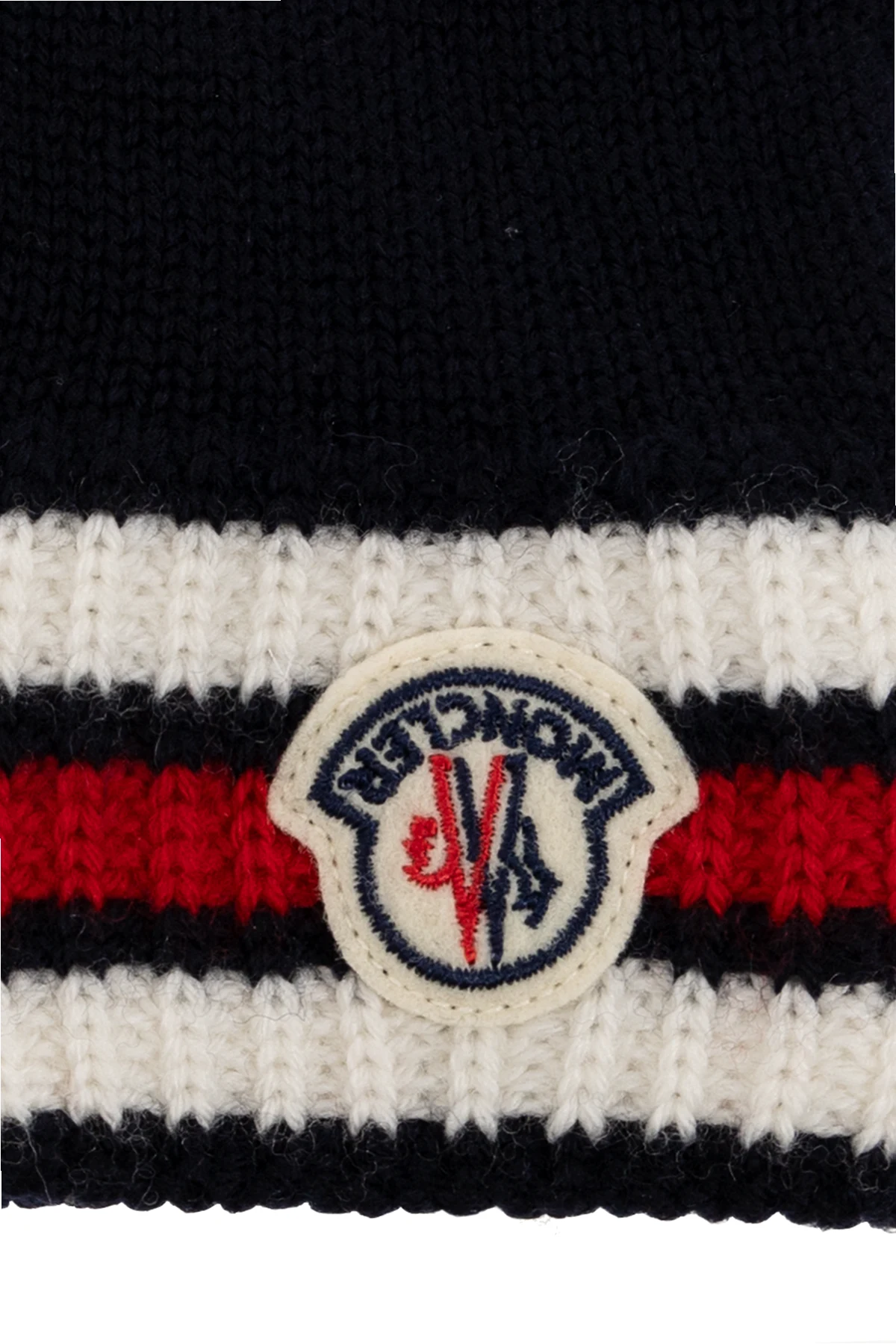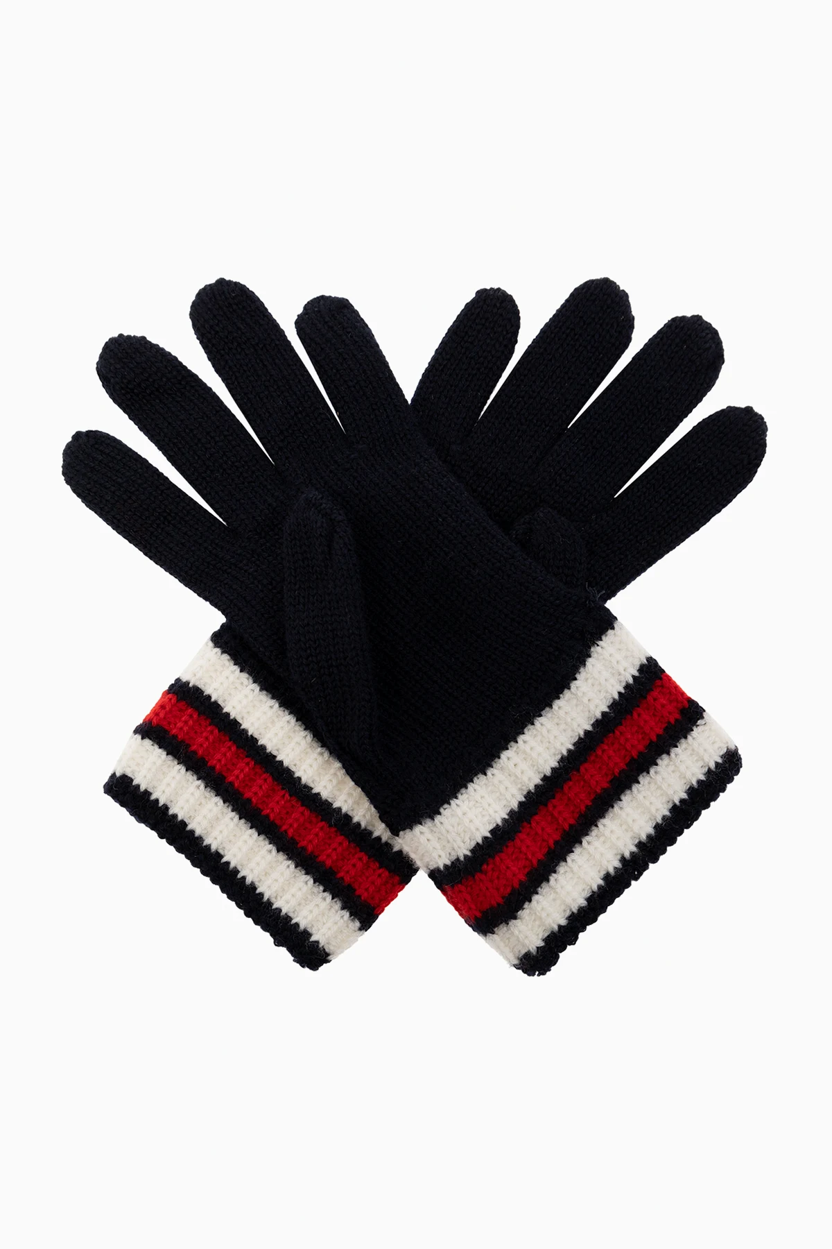 Navy, red and white gloves from Moncler Enfant. Made of virgin wool, this pair is enriched by a stripe pattern and logo patch.