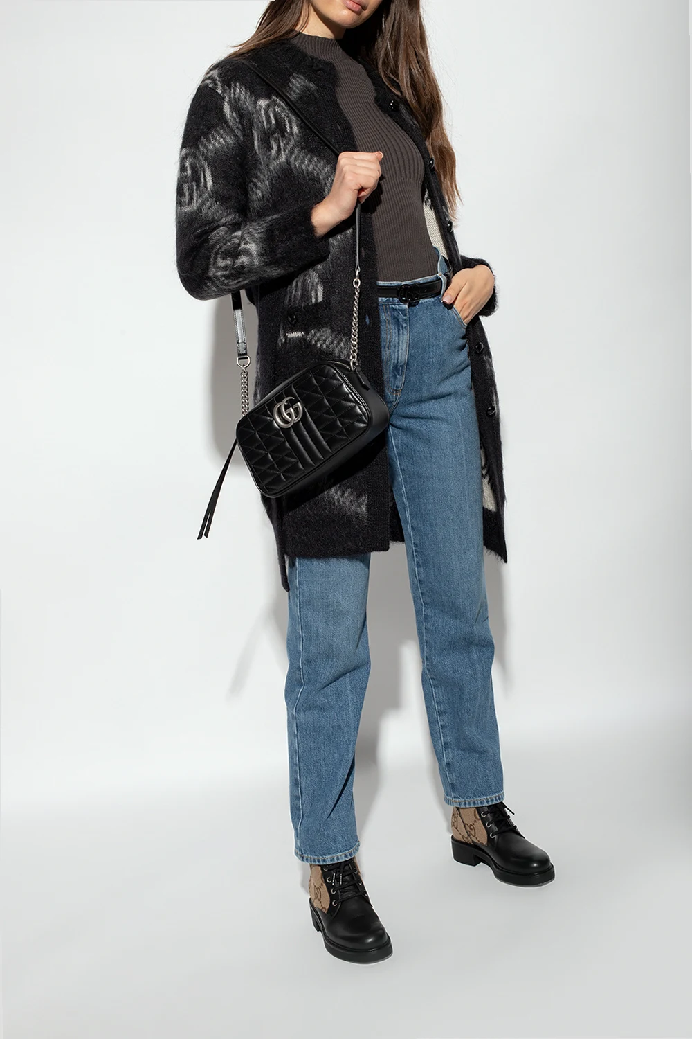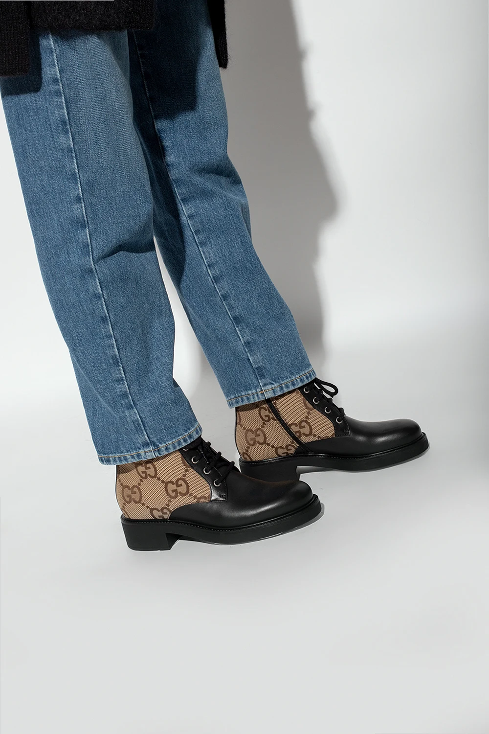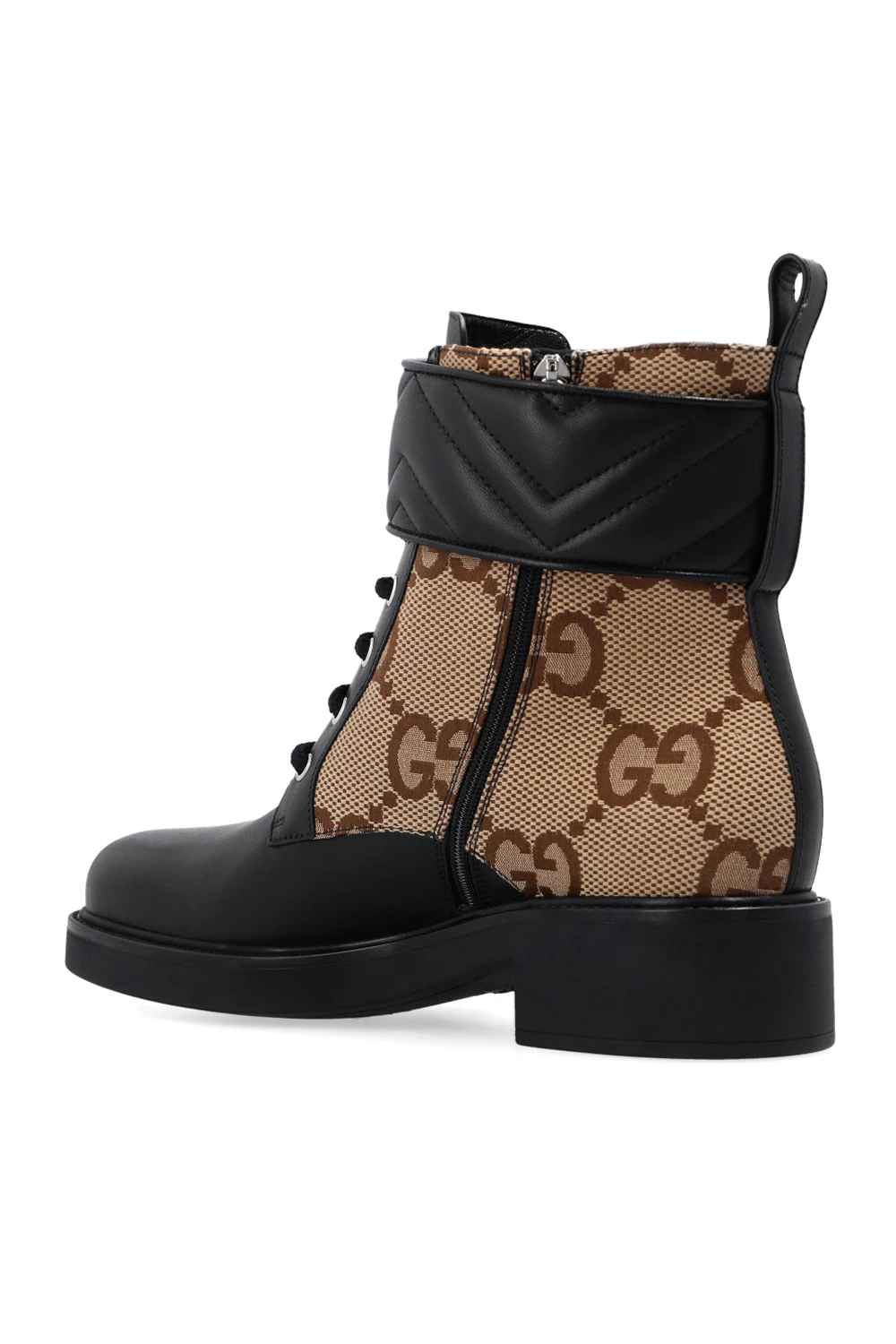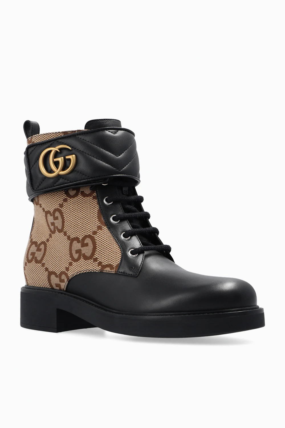 Black, beige and brown ankle boots from Gucci. Crafted from leather and GG Supreme canvas, this lace-up pair is complete with a zip, black quilted strap with hook-and-loop closure as well as a gold-tone logo.