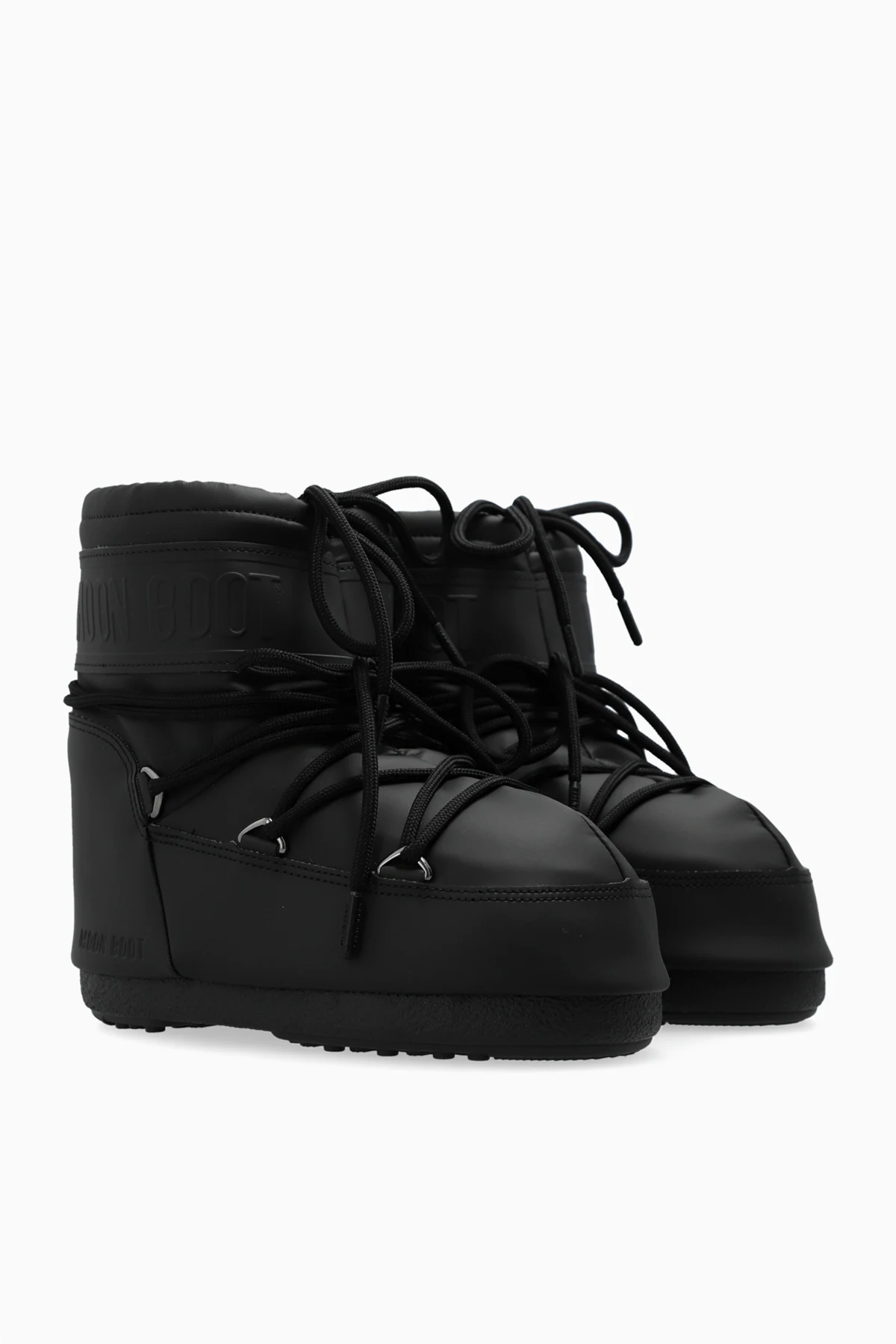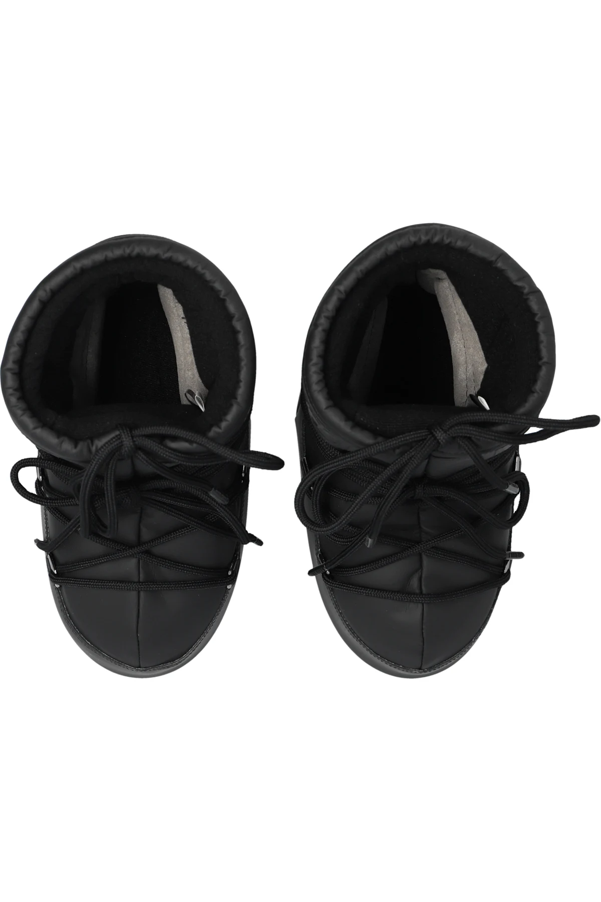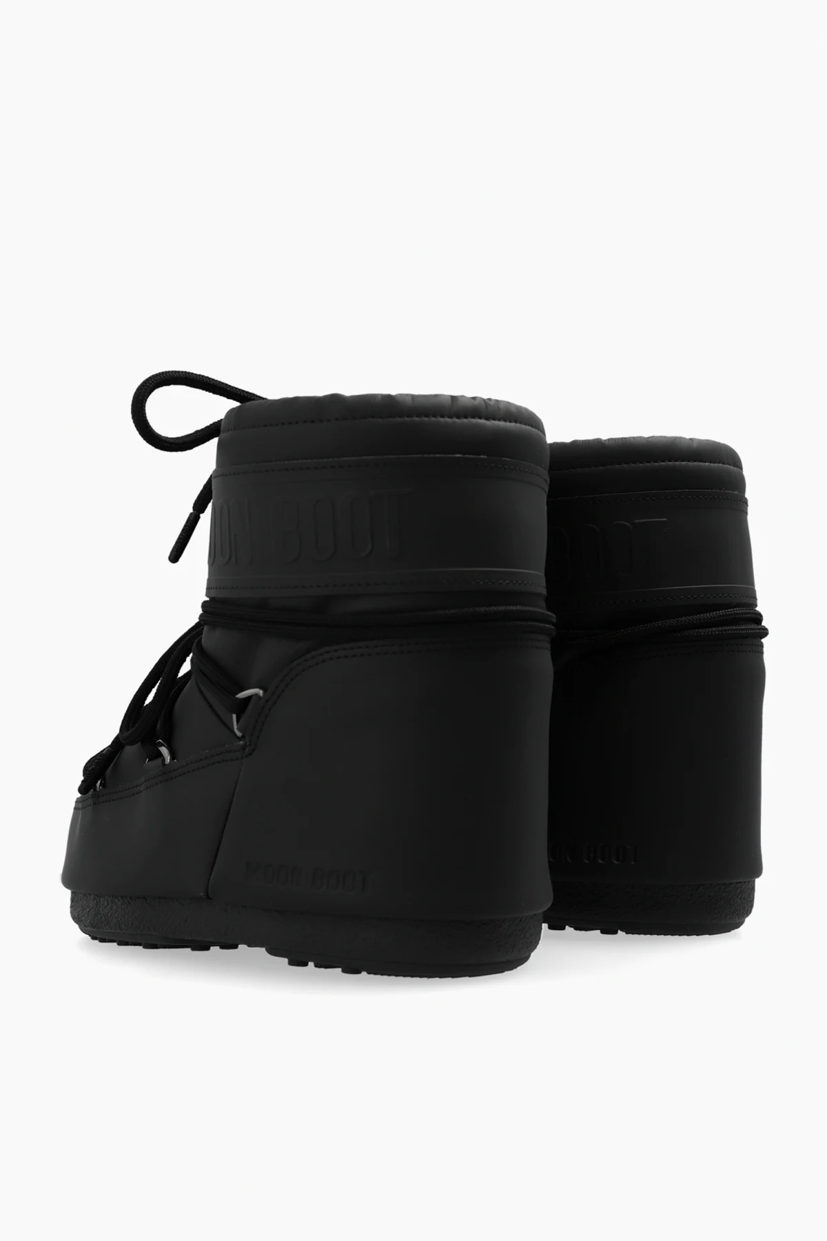 Introducing the \'Icon Low Rubber\' snow boots from the esteemed fashion house, Moon Boot Kids. These exquisite boots are meticulously crafted for children, combining both style and functionality. With a rounded shape and a broad shaft that extends just below the ankle, these boots ensure a snug and comfortable fit. The thick, robust sole is designed to provide exceptional insulation from the ground, making them ideal for winter conditions. Rendered in a sophisticated black hue, these boots exude elegance and timeless appeal. The upper part of the shaft features an embossed \"MOON BOOT\" logo, adding a subtle yet distinctive touch. The waterproof exterior is made from durable rubber, while the interior is lined with a soft insulating material, ensuring warmth and comfort. These snow boots are equipped with front laces, allowing for adjustable fit, and the rear logo ensures authenticity. Available in sizes 25-39, they cater perfectly to children\'s needs, providing both protection and style. Why Choose This Product? Elegant Design: All-black aesthetic with subtle branding. Superior Comfort: Soft, insulated interior for maximum warmth. Durable Construction: Waterproof rubber exterior and thick sole for excellent insulation. Adjustable Fit: Front laces for a customizable fit. Authenticity: Embossed \"MOON BOOT\" logo ensures genuine quality.