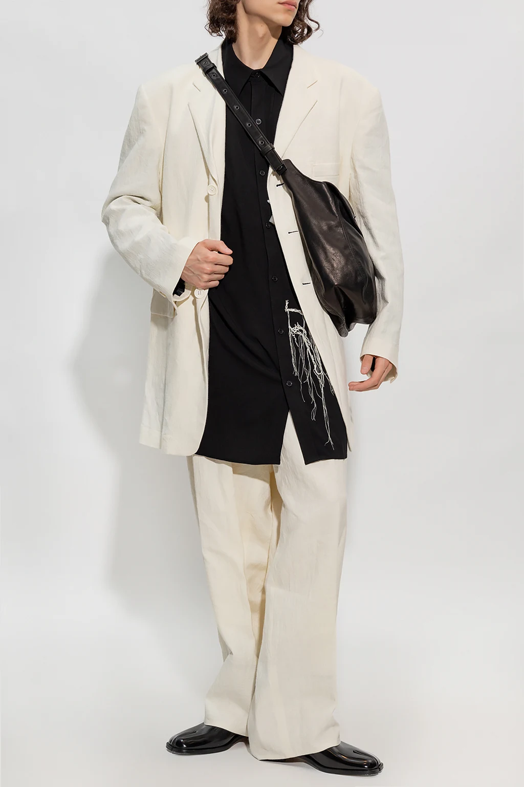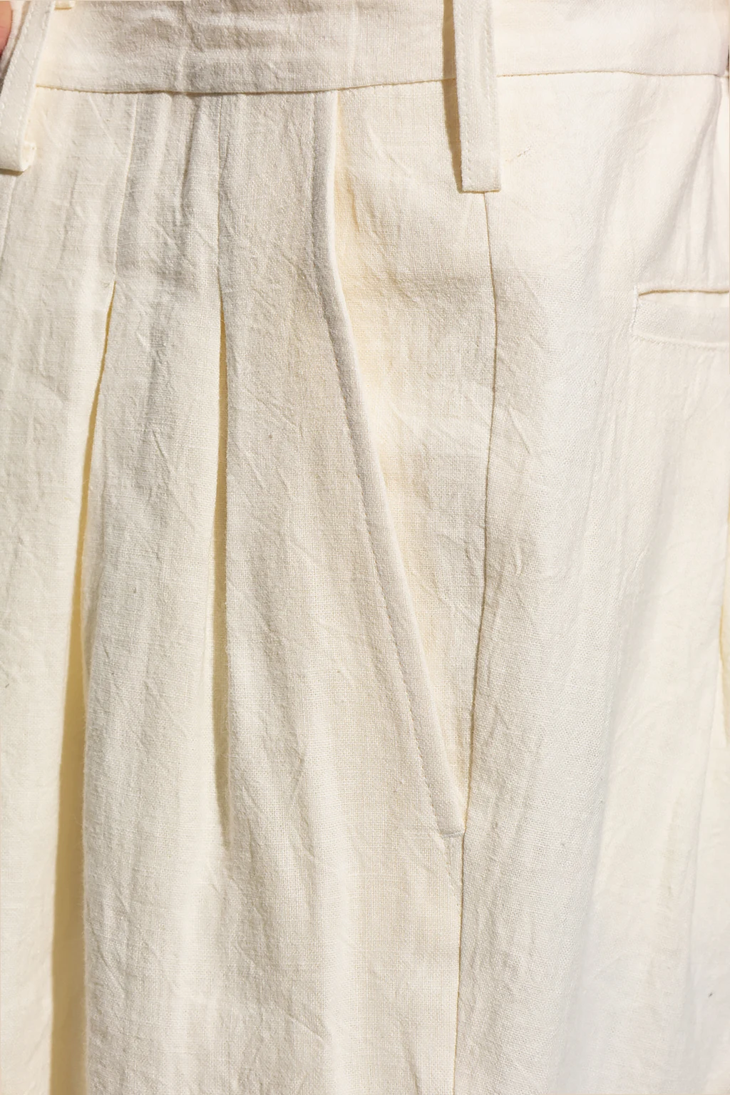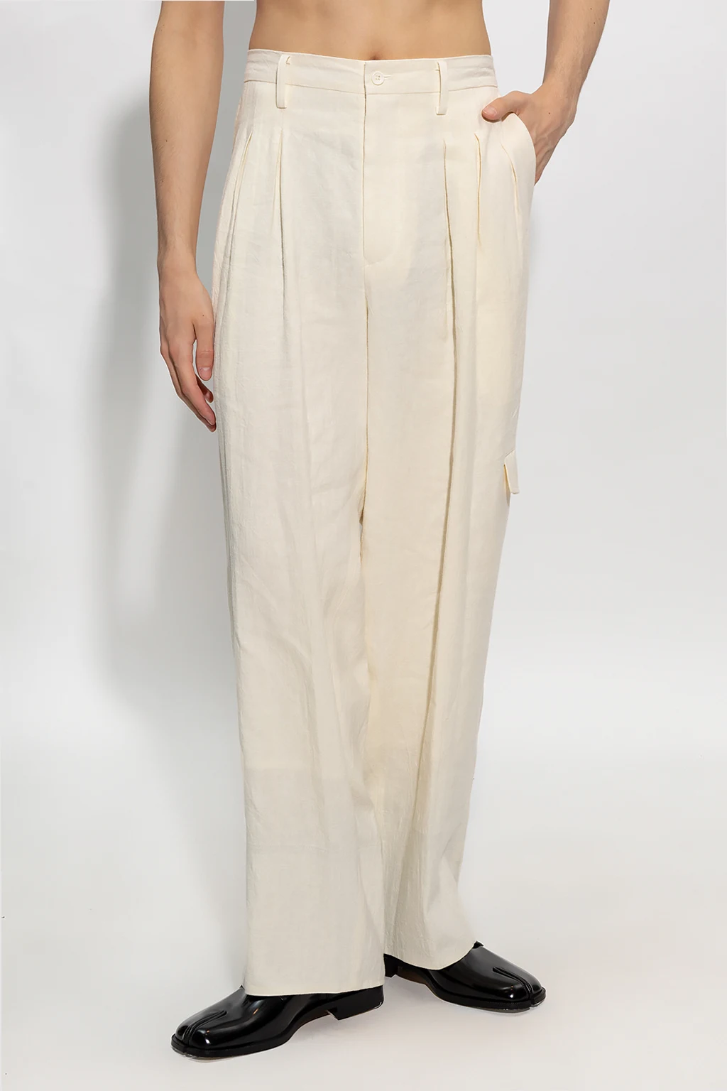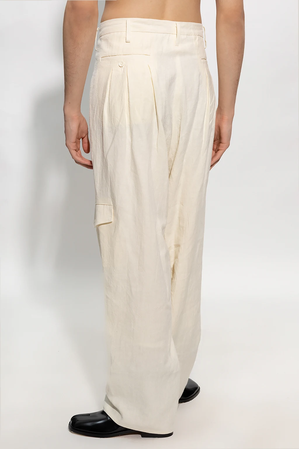 Cream trousers from Yohji Yamamoto. Made of linen, this pair falls with wide legs and features a zip fly with a button, two slip pockets and three buttoned pockets.
