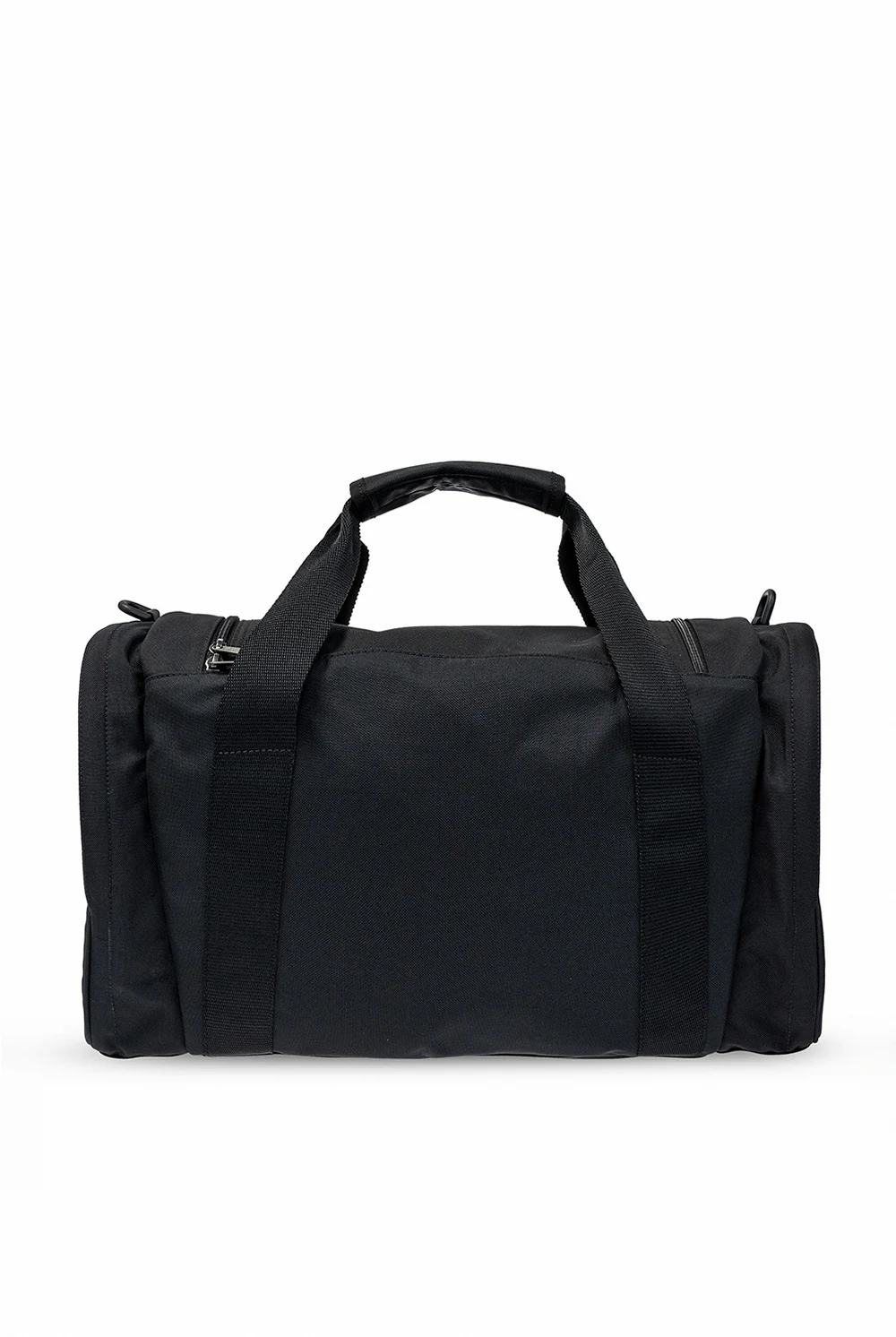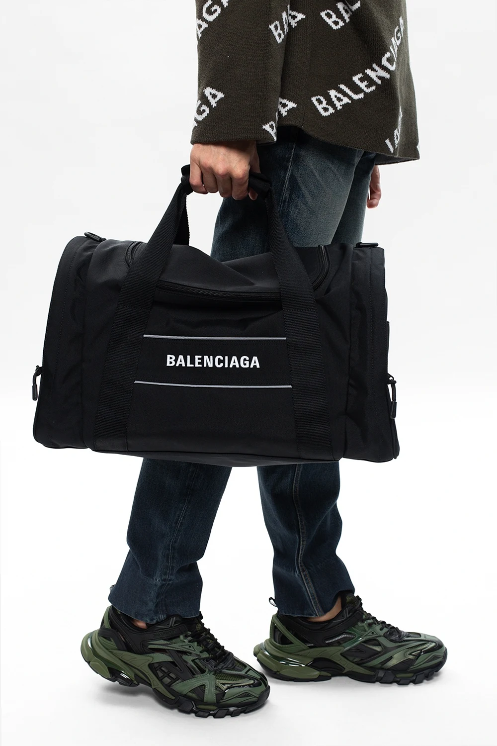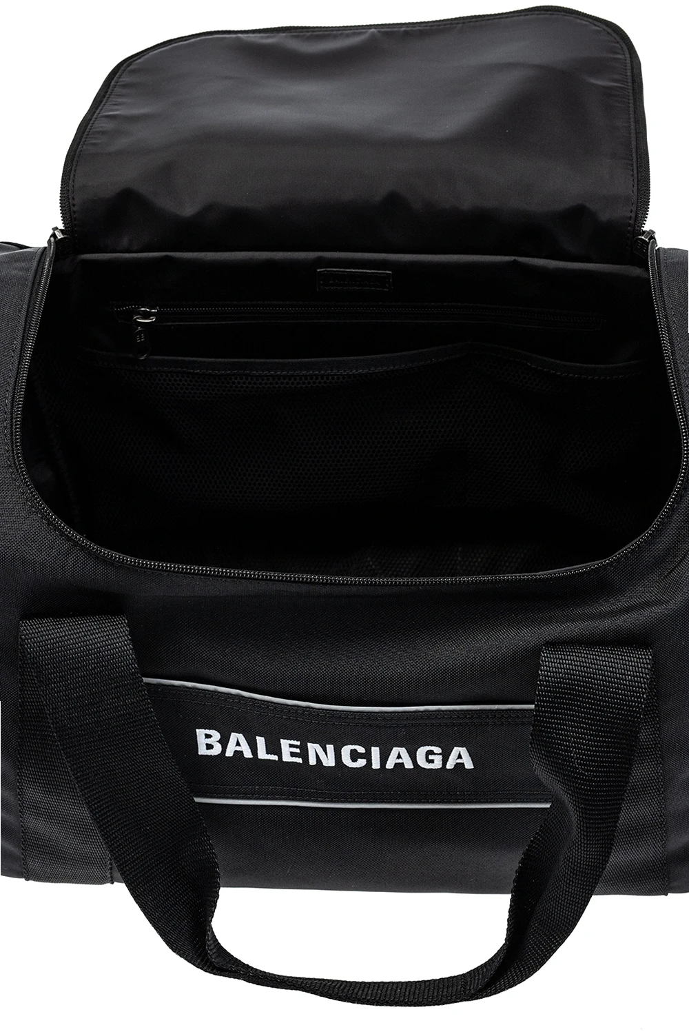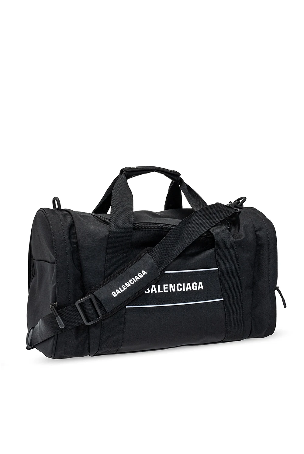 Black duffel bag from Balenciaga. Embroidered with the brand\'s logo in white, this gym bag fastens via zip closure and showcases reflective details, five external pockets, including three slip ones and two zipped ones, a detachable and adjustable shoulder strap, two half-round handles and interior with one compartment, one zip pocket and one mesh pocket.