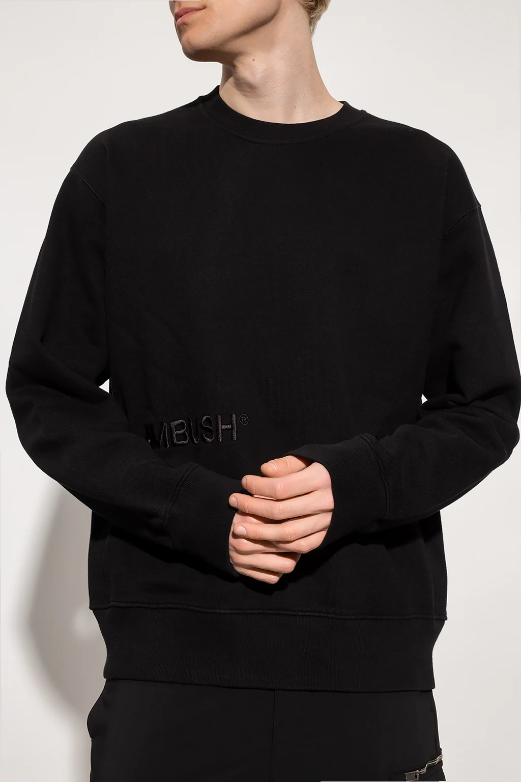 Black crewneck sweatshirt from Ambush. Crafted from cotton jersey, this style features an embroidered logo on the front and ribbed trims on the bottom hem and cuffs.