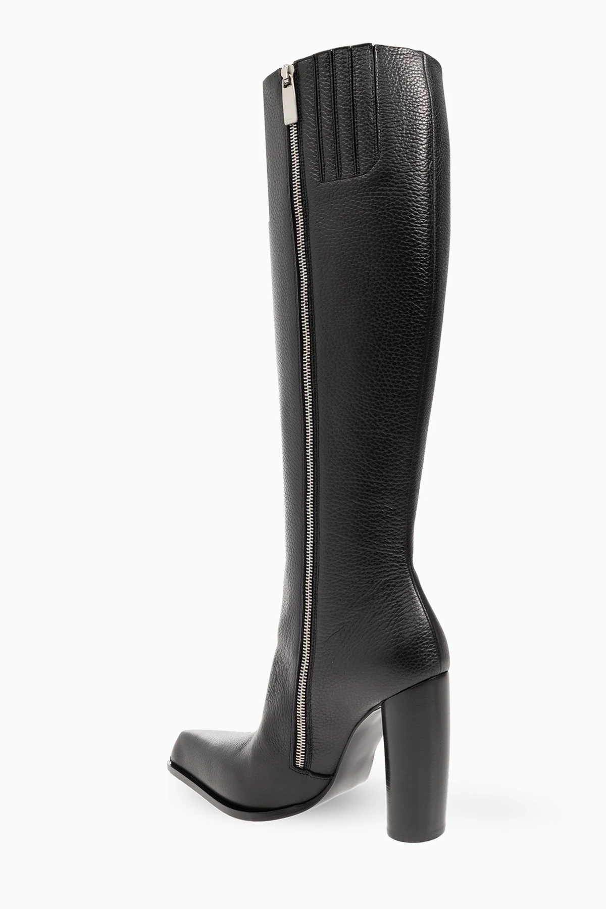 Black heeled boots from Off-White. Made of leather, this model sits on a black leather sole and features a pointed-toe silhouette and a side zip fastening.