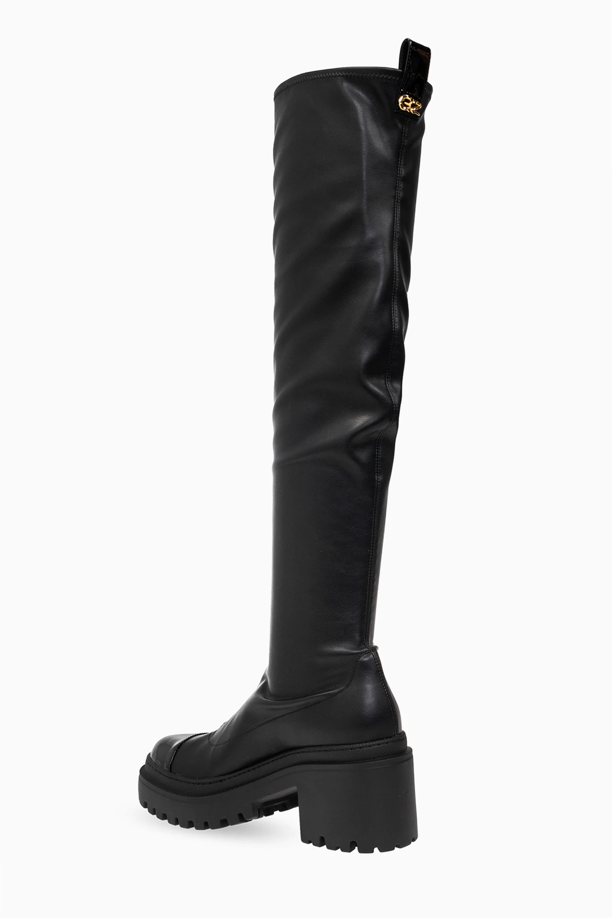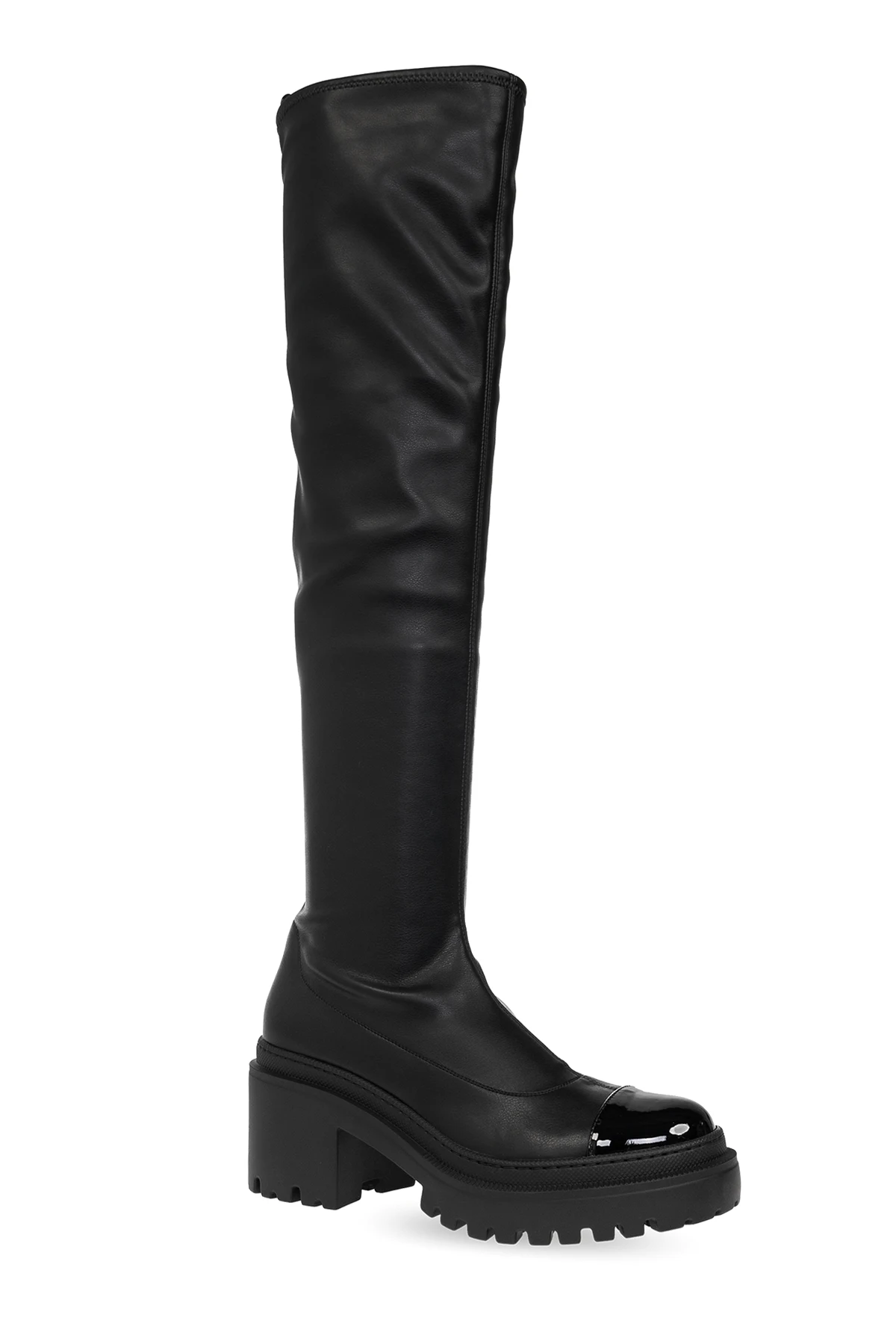 Black ‘Avela’ knee-high boots from Giuseppe Zanotti. Made of stretch faux leather, this slip-on pair features a glossy toe, pull tab at the back, a logo detail in gold-tone and a black rubber sole.