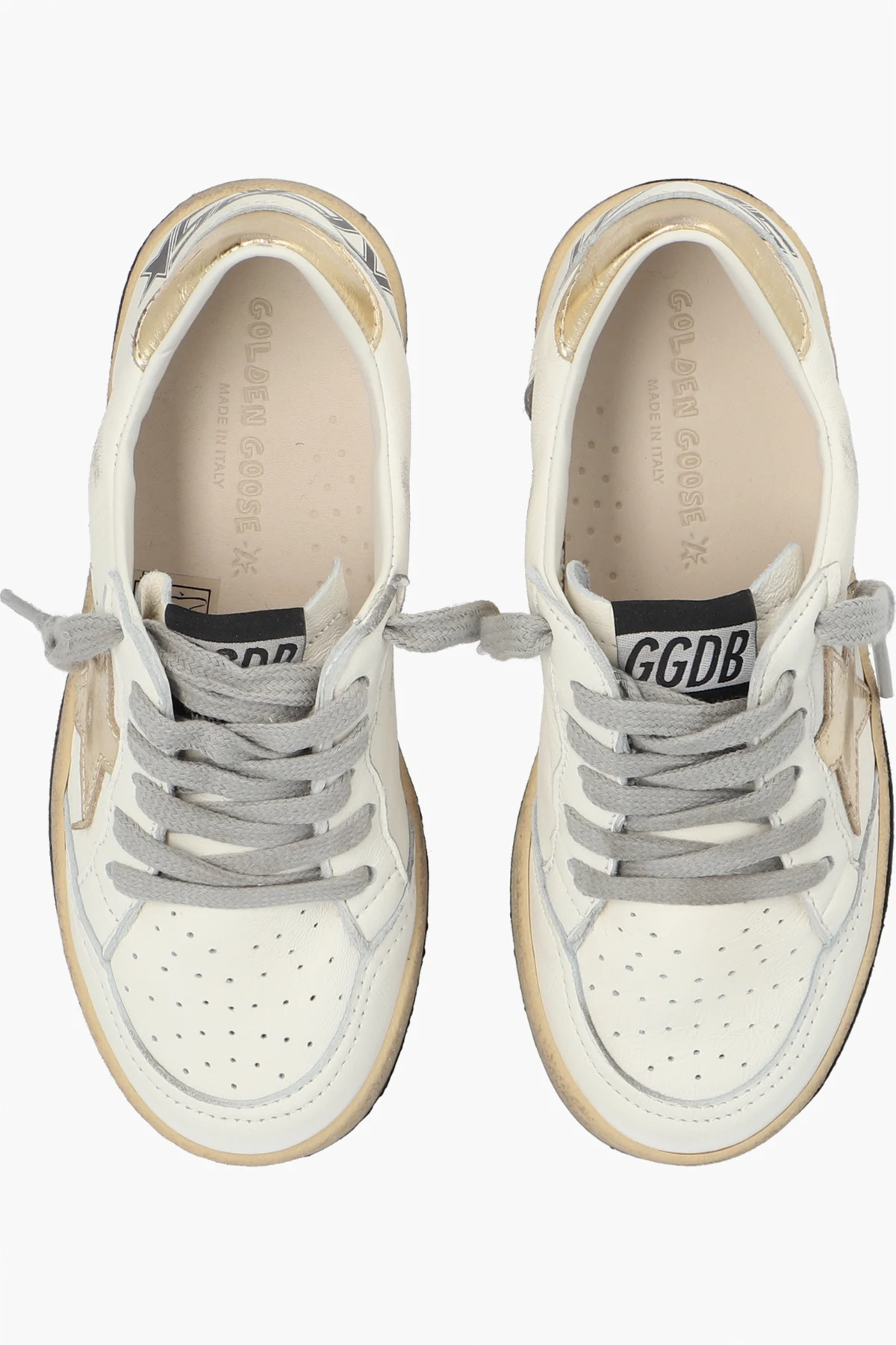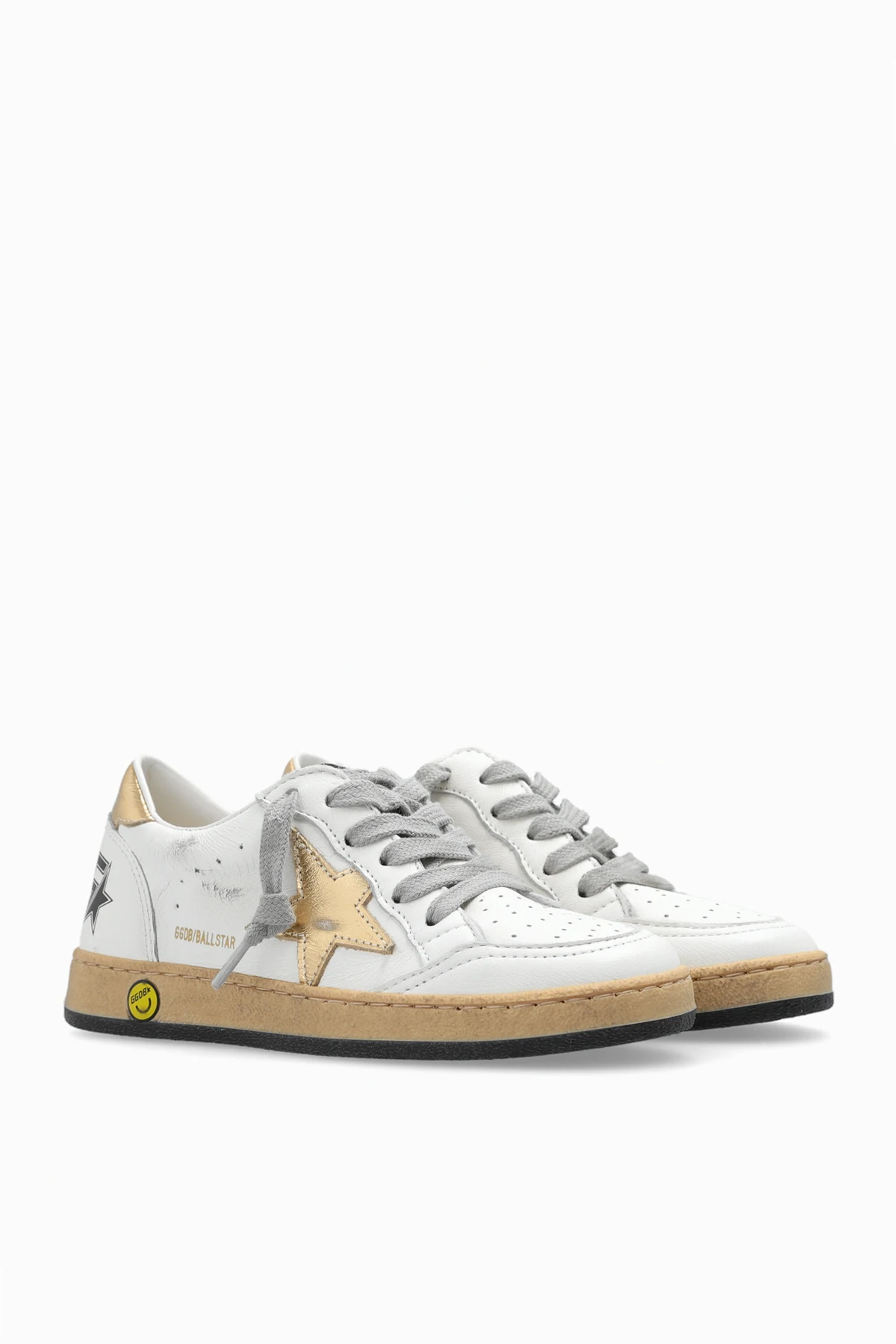 White ‘Ball Star New’ distressed sneakers with a vintage effect from Golden Goose Kids. Crafted from leather, this lace-up pair features black and gold-tone trimming, the brand\'s signature star patch on the side, perforations on the front and rubber sole in black and beige.