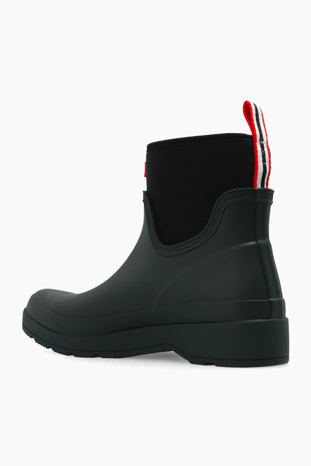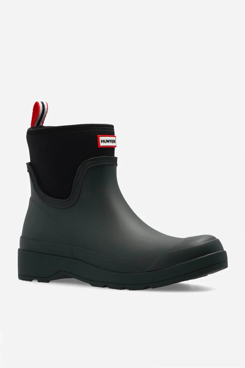 Dark green and black ‘Play’ rain boots from Hunter. Handcrafted from vegan rubber and stretchy neoprene, this design features 100% recycled polyester lining and insole, red, white and black logo patch and dark green rubber sole.