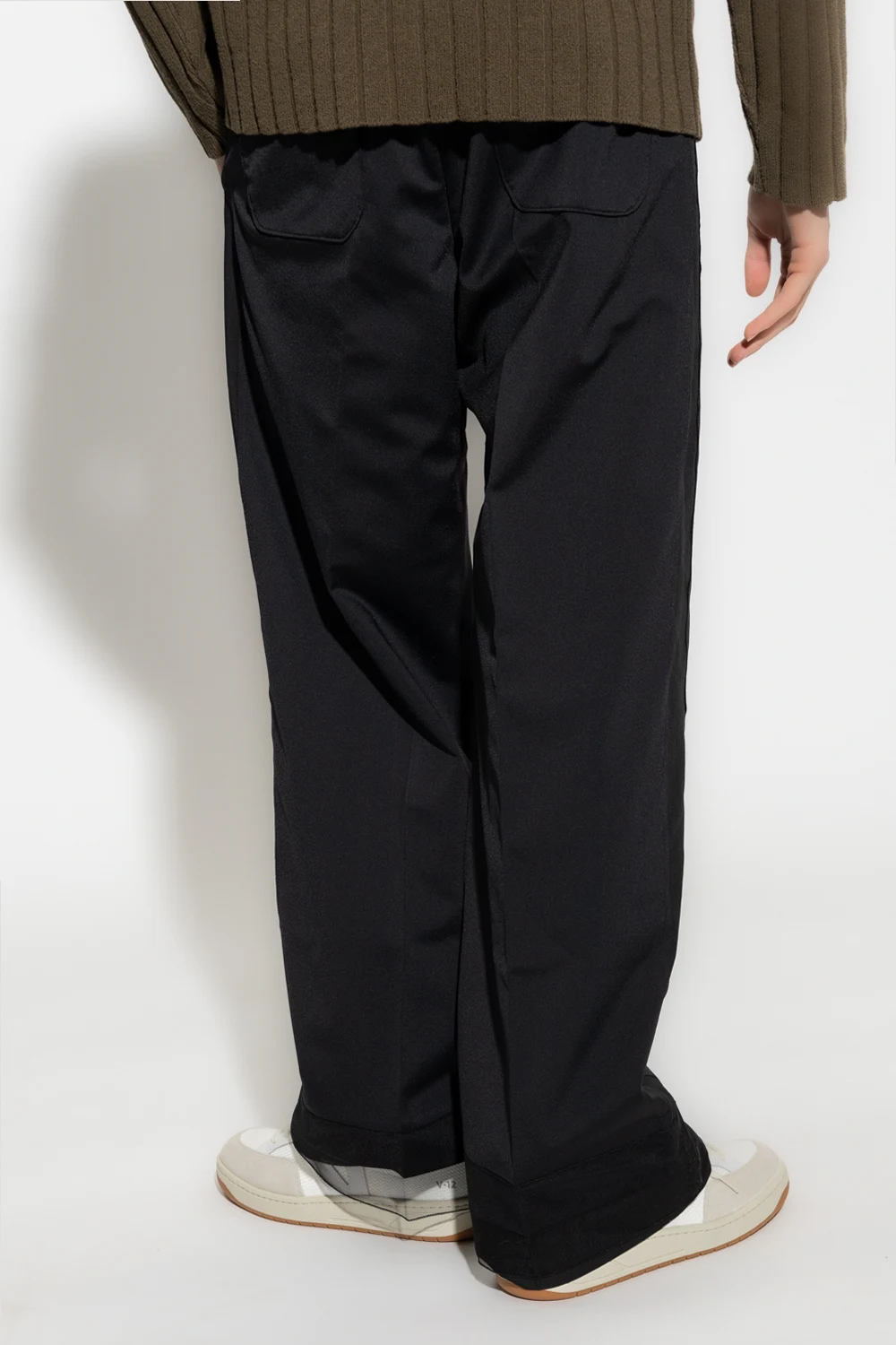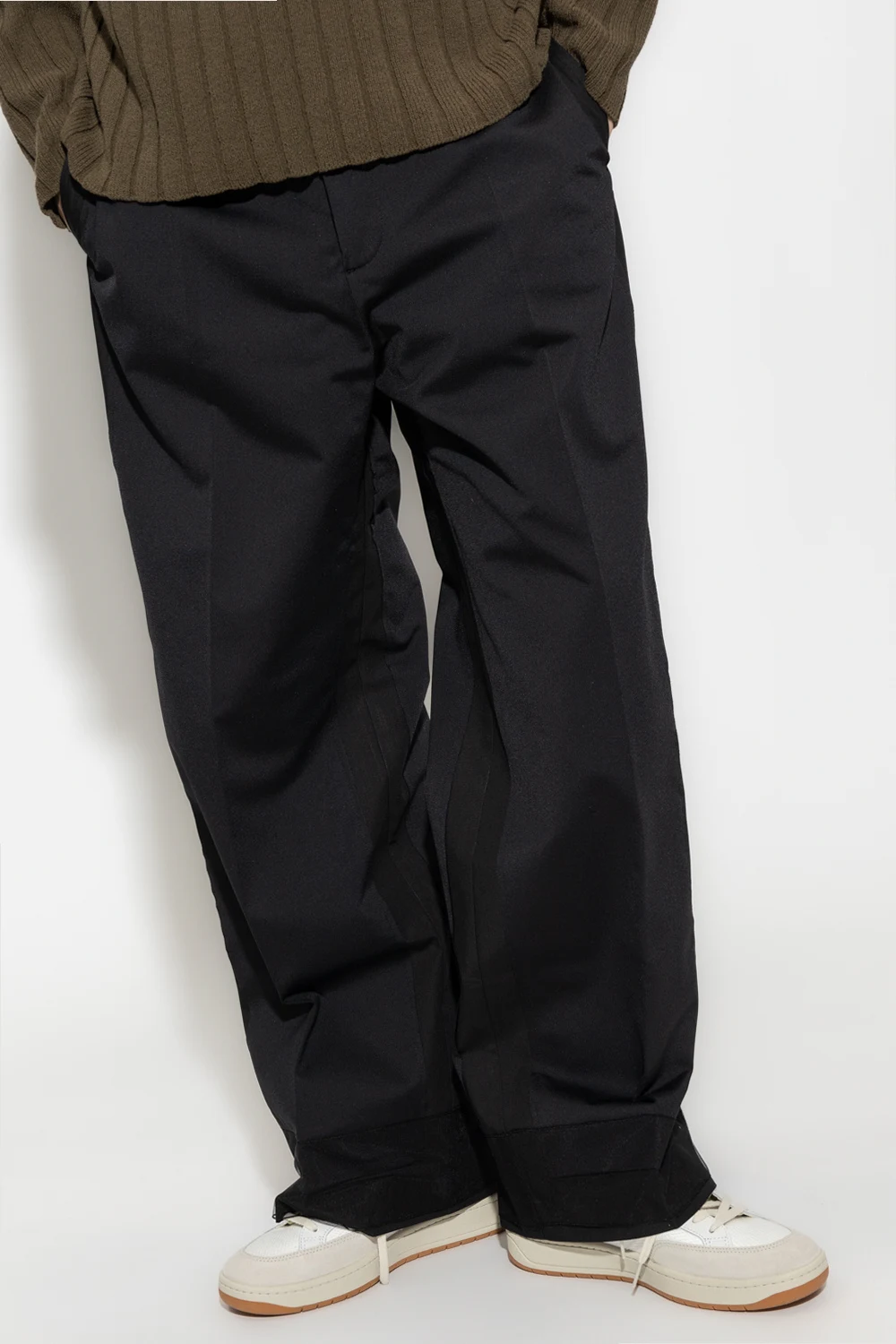 Black trousers from Undercover. Crafted with a relaxed fit, this pair falls with wide legs and features a zip fly with a button and hook & eye closure, and four slip pockets.