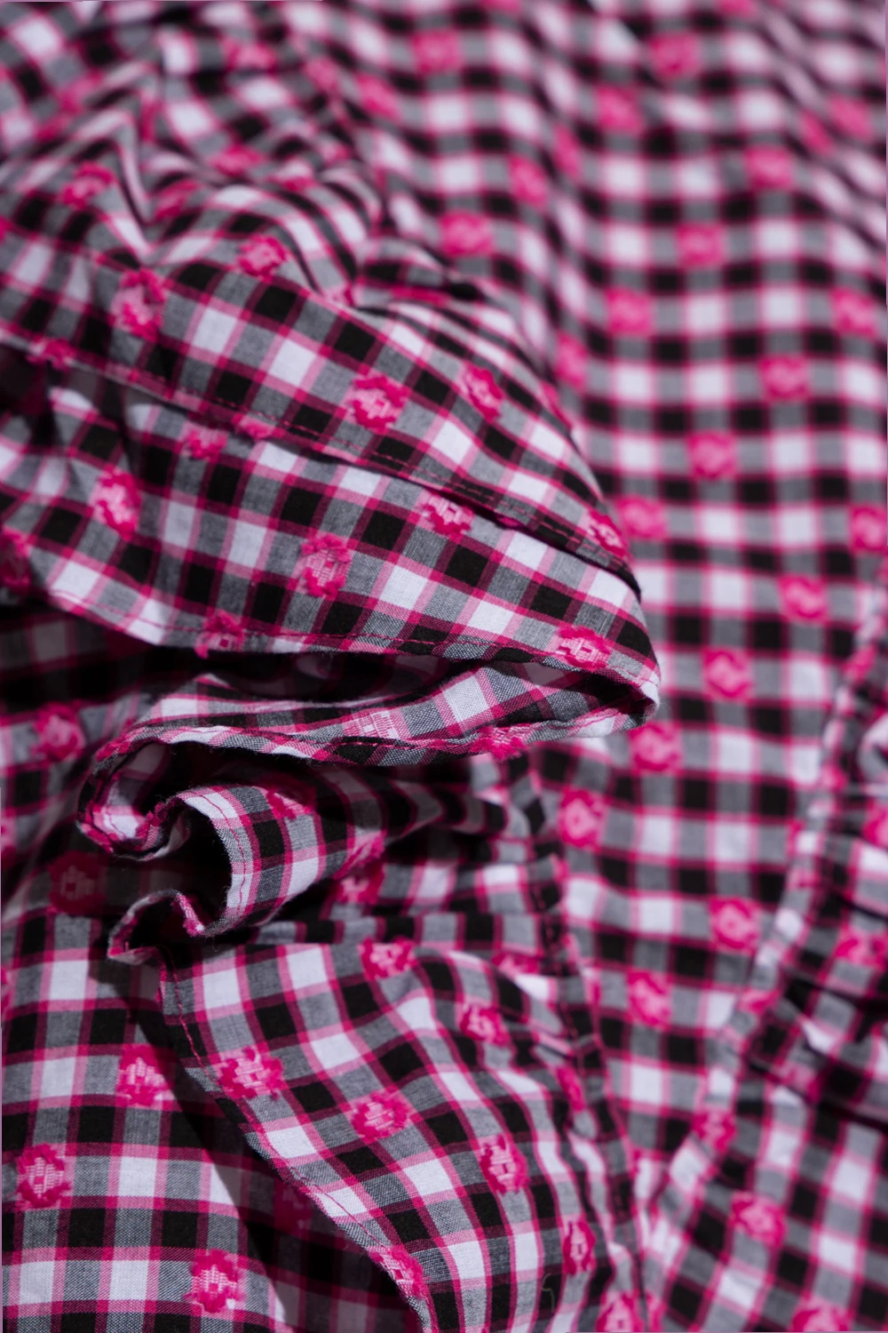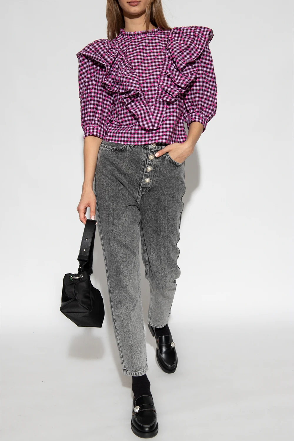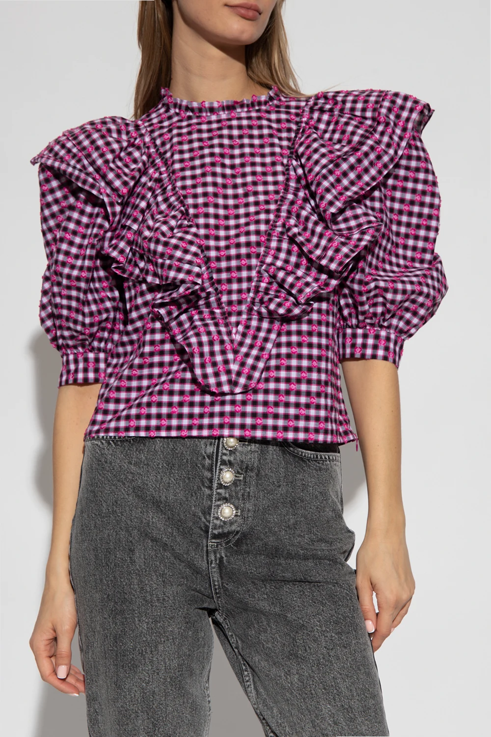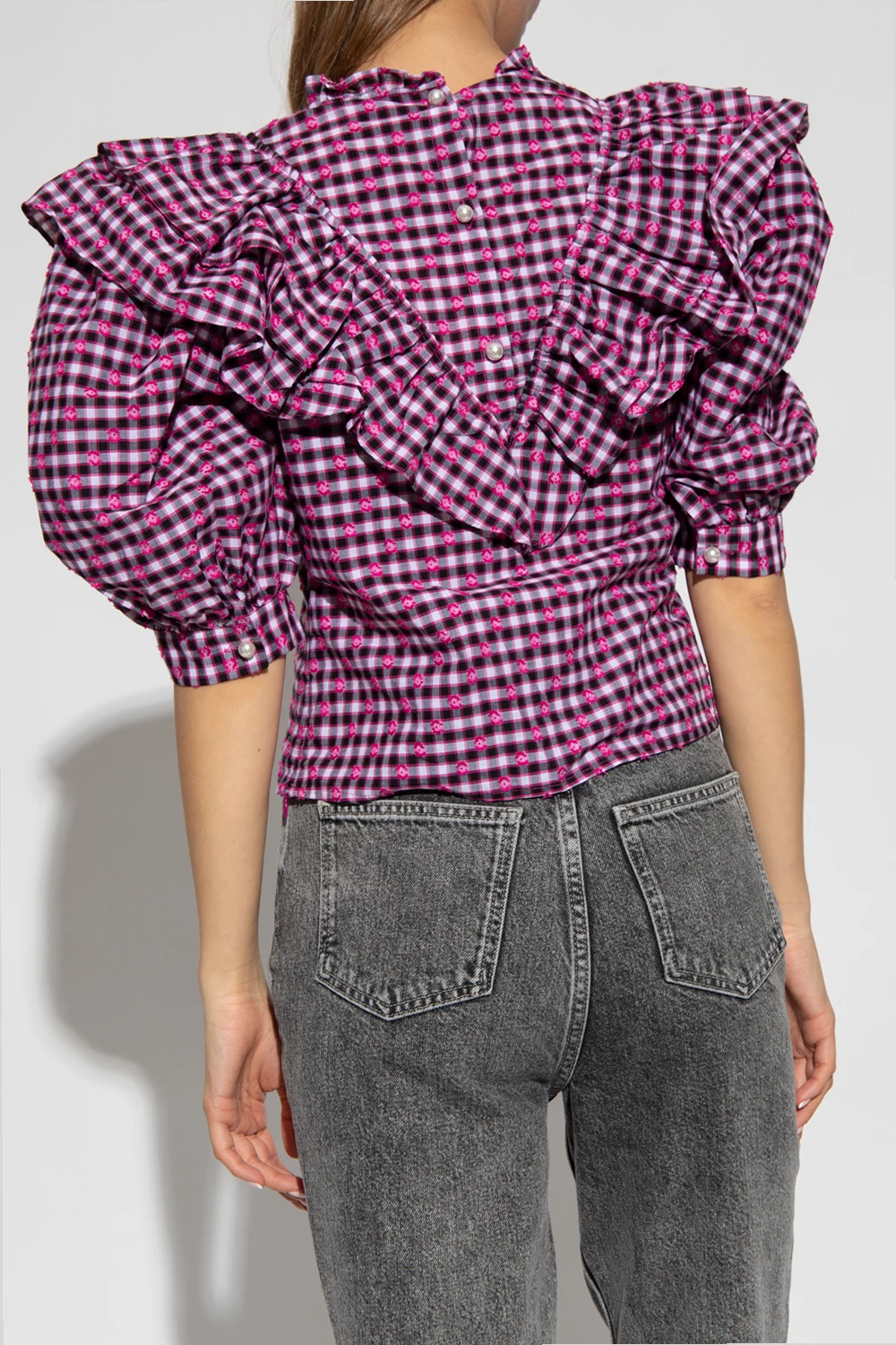 Black, white and pink ‘Diga’ top from Custommade. Crafted from checked cotton, this style features pearly buttons at the back, flouncy details, padded shoulders and short blouson sleeves.