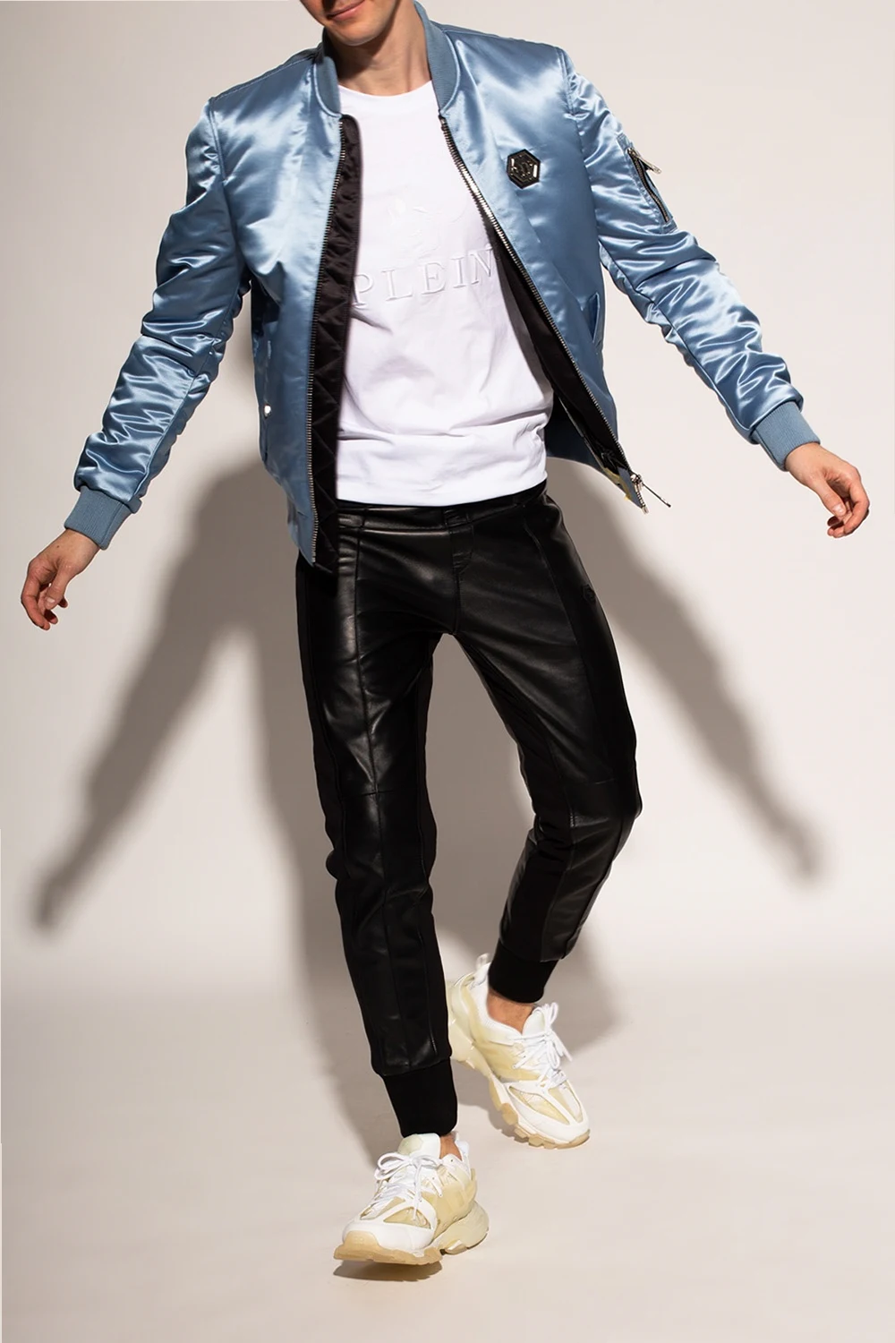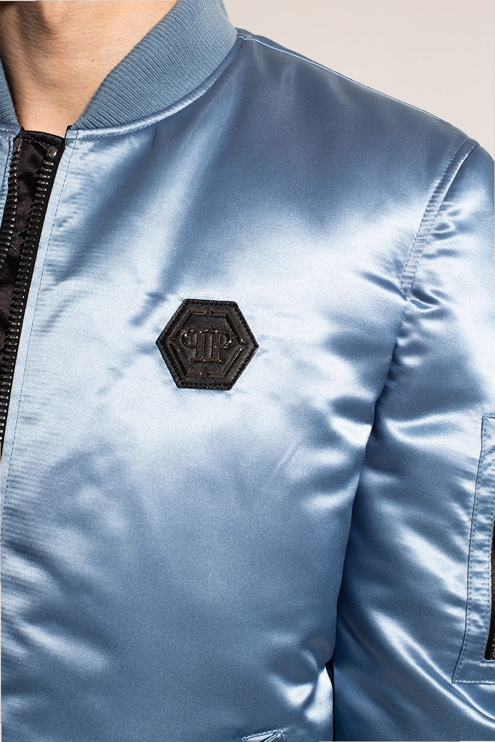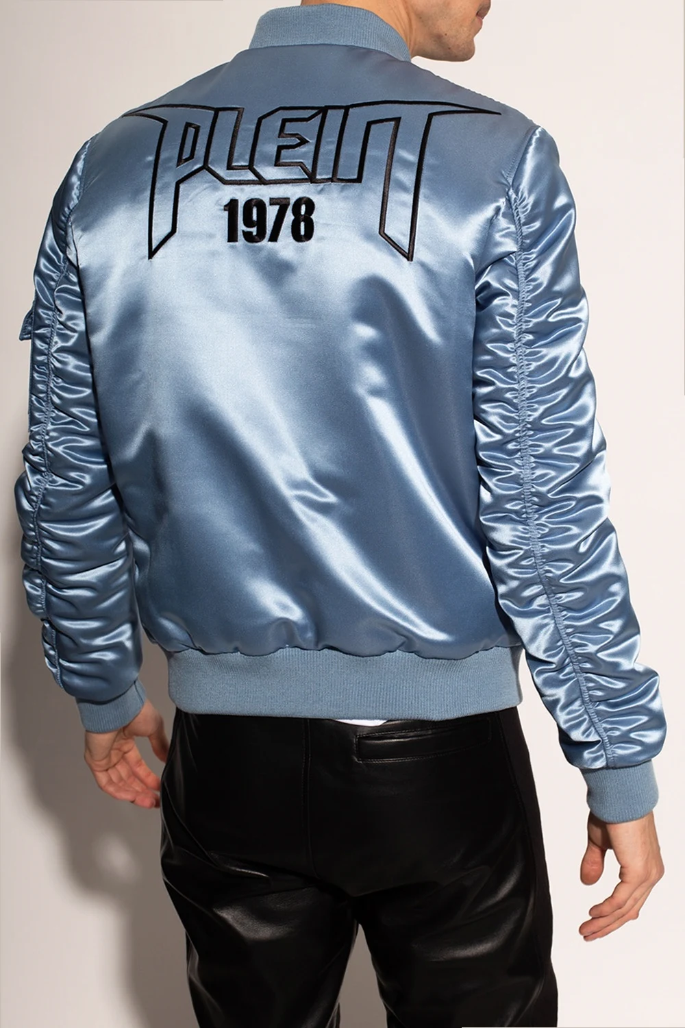 Blue bomber jacket from Philipp Plein. Fastened with a zip, this long-sleeved garment features three snap-fastened flap pockets, one zip pocket and ribbed trims at the collar, hem and cuffs.